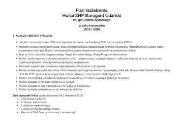 Plan kształcenia Hufca ZHP Starogard Gdański im. gen Józefa Wybickiego w roku harcerskim 2015 / 2016 I. ANALIZA OBECNEJ SYTUACJI • Hufiec zrzesza aktualnie: 254 osób (zgodnie ze stanem w Ewidencji ZHP na 1 września 2015 r). • Hufcem kieruje komendant hufca wraz z komendą hufca, działają także Komisja Rewizyjna, Międzyhufcowy Zespół Kadry Kształcącej i Komisja Stopni Instruktorskich (z uprawnieniami przyznawania stopnia przewodnika). • Brak w hufcu zespołu programowego, Kręgu Instruktorskiego i Rady Przyjaciół Harcerstwa. • Hufiec działa zgodnie z przyjmowanym co roku planem pracy, uwzględniającym cykliczne imprezy drużyn, hufca oraz ogólnozwiązkowe i chorągwiane propozycje programowe. • Harcerze wyjeżdżają co roku na organizowane obozy letnie i zimowiska • Hufiec podejmuje cykliczne akcje, które również promują harcerstwo na zewnątrz, takie jak, Betlejemskie Światło Pokoju, akcja „1 % dla ZHP”, pomoc przy organizacji imprez lokalnych i uroczystości patriotycznych. • Hufiec ma siedzibę w budynku będącym własnością ZHP (która wymaga dalszego remontu). • Hufiec posiada letnią bazę obozową w Skrzyni. • Hufiec posiada stronę internetową i fan page na Facebooku. • Hufiec posiada doświadczenie w realizacji projektów. Stan jednostek Hufca (zaktualizowany na 1 września 2015): • 2 gromady zuchowe • 6 drużyn harcerskich • 1 drużyna wędrownicza • 1 drużyna Nieprzetartego Szlaku • Harcerski Klub Specjalnościowy (ratowniczy) Wyszkolenie funkcyjnych: DRUŻYNA FUNKCJA STOPIEŃ IMIĘ NAZWISKO 2 Starogardzka Drużyna Harcerska drużynowa pwd. Wiktoria Guz 2011 Kurs drużynowych MAK, Kurs Przewodnikowski, PHM Szkoła Wodzów, KKK MAK przyboczna sam. Magda Ringwelska 2015 Puszczański Kurs przewodnikowski Szkoła Wodzów 3 Wodna Drużyna Harcerska drużynowa pwd. Aneta Witakowska 2012 Kurs drużynowych MAK, Kurs Przewodnikowski MAK przyboczna sam Hanna Połom 2015 Kurs przewodnikowski MZKK 4 Drużyna Harcerska drużynowa pwd. Paulina Szulc 2010 Kurs drużynowych MAK, Kurs przewodnikowski MAK przyboczna Sam. Jadwiga Kamińska 2015 Kurs przewodnikowski MZKK przyboczna Sam. Klaudia Burczyk 2015 przyboczny Alan Kulczyński 2015 5 Starogardzka Drużyna Wędrownicza drużynowa H.O. Marzena Fandrejewska 2014 Kurs przewodnikowski MZKK, kurs metodyczna MAK 6 Gromada Zuchowa drużynowa sam Klaudia Paszkowska 2015 Kurs przewodnikowski MZKK Opiekun Phm. Michał Hinc 2015 Kurs przewodnikowski MAK, Kurs drążynów MAK, Kurs PHM MAK drużynowa sam Eliza Wojewódka 2015 Kurs przewodnikowski MZKK Opiekun Pwd. Dorota Pałubicka 2015 9 Wodna Gromada Zuchowa STAŻ (od roku) UKOŃCZONE KURSY 10 Drużyna Harcerska Rokocin drużynowy phm. Rafał Zachmielewski 2012 Kurs drużynowych MAK, Kurs Przewodnikowski, Kurs PHM 15 Drużyna Harcerska Godziszewo drużynowa dh. Wiesława Freitag 2012 - 16 Drużyna Harcerska drużynowy phm. Michał Hinc 2012 Kurs drużynowych MAK, Kurs przewodnikowski, Kurs phm MAK przyboczna pwd Julia Weber 2013 Kurs przewodnikowski MAK, Kurs drużynowych MAK 11 Drużyna Nieprzetartego Szlaku drużynowa phm Monika Aleksandrowicz 2015 Kurs drużynowych Harcerski Klub Ratowniczy szef HO Szymon Flissikowski 2014 - SILNE STRONY: • • • • • • • • • • • Kadra: aktywna młoda kadra wraz z doświadczonymi instruktorami; stale doskonaląca się kadra (coroczny udział w kursach pwd, phm, drużynowych); drużynowi mają świadomość wagi wychowywania następcy; instruktorzy hufca działający na polu Chorągwianym, Rady Naczelnej i Głównej Kwatery; kreatywność i przedsiębiorczość instruktorów; cieszymy się dobrym wizerunkiem w Chorągwi; współtworzymy MZKK; 1 osoba posiadająca srebrną Odznakę Kadry Kształcącej, kolejna w przygotowaniu; dużo specjalistów (instruktor wspinaczki skałkowej, profilaktyk antyalkoholowy, osoby z patentami żeglarskimi, ratownicy PCK, BORM) 5 instruktorów z uprawnieniami kierownika wypoczynku; 7 otwartych prób przewodnikowskich; 1 otwarta próba podharcmistrzowska. Drużyny: kilka prężnych i aktywnych drużyn we wszystkich metodykach; większość drużynowych jest przygotowana do prowadzenia drużyn (oprócz 3 ) zwiększona świadomość drużynowych w konieczności pracy z zastępowymi oraz pracy Metodą Harcerską i zachowaniu Harcerskiego Ciągu Wychowawczego; drużynowi mają świadomość wagi wychowywania następcy; zamknięto pozytywnie 1 próbną drużynę; silnie działający funkcyjni w drużynach; drużyny biorą udział w propozycjach zewnętrznych (Zlot Westerplatte, Rodło, Leśne Plemiona, Teraz Afryka…); drużyny są w większości umundurowane. Drużyny płacą składki harcerskie. • • • • • • • • • • • • • • • • • SŁABE STRONY: Kadra: brak osoby odpowiedzialnej za wizerunek hufca; brak kadry gospodarczej (kwatermistrz, magazynier); brak Kręgu Instruktorskiego; brak Koła Przyjaciół Harcerstwa; często podczas różnych przedsięwzięć brakuje instruktorów komendy Hufca (akcje, biwaki, pomniki); jest kilku instruktorów, którzy nie rozwijają się; nie korzystanie z wyróżnień dla instruktorów. KSI potrzebuje rozwoju. Drużyny: • • • • • niewykorzystywanie w pełni narzędzi metodycznych przez drużynowych (stopnie, sprawności); są drużyny, które nie obierają świadomie celu na cały rok czy kilka lat (takie drużyny się nie rozwijają); brak pracy z przybocznymi; brak współzawodnictwa drużyn; mała ilość jednostek na terenie powiatu; • wciąż nie w każdej jednostce pracuje się systemem zastępowych; POTENCJALNE MOŻLIWOŚCI: Kadra: • pozyskiwanie instruktorów z zewnątrz (program 35+); • próba stworzenia kręgu instruktorskiego/starszyzny; Drużyny: • współpraca z rodzicami. POTENCJALNE ZAGROŻENIA: Kadra: • potrzeba zarobku może zabrać nam instruktorów w czasie HAL/HAZ; Drużyny: • brak współpracy z rodzicami; • niedoszlifowany wizerunek drużynowych