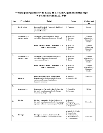Wykaz podręczników do klasy II Liceum Ogólnokształcącego w roku szkolnym 2015/16 Lp. 1. 2. 3. Przedmiot Tytuł Autor Wydawnict wo Język polski Przeszłość to dziś. Podręcznik dla klasy 2 liceum i technikum (pozostałe klasy) E. Paczoska Stentor Matematyka – poziom podst. Matematyka. Podręcznik do liceów i techników. Zakres podstawowy. Klasa 2. M. Kurczab, E. Kurczab, E. Świda Oficyna edukacyjna – Krzysztof Pazdro Zbiór zadań do liceów i techników kl. 2 zakres podstawowy M. Kurczab E. Kurczab E. Świda Oficyna edukacyjna Krzysztof Pazdro Matematyka. Podręcznik dla liceów i techników. Zakres podstawowy i rozszerzony. Klasa 2. M. Kurczab, E. Kurczab, E. Świda Oficyna edukacyjna – Krzysztof Pazdro Zbiór zadań do liceów i techników kl. 2 zakres rozszerzony M. Kurczab E. Kurczab E. Świda Oficyna edukacyjna – Krzysztof Pazdro Zrozumieć przeszłość. Starożytność i średniowiecze. Podręcznik dla liceum ogólnokształcącego i technikum. Zakres rozszerzony R. Kulesza, K. Kowalewski Informatyka Informatyka Europejczyka. Podręcznik dla szkół ponadgimnazjalnych. Zakres rozszerzony. Część 1 i 2. G. Zawadzka D. Korman Fizyka Fizyka – zrozumieć fizykę. Podręcznik dla szkół ponadgimnazjalnych. Kształcenie ogólne w zakresie rozszerzonym. Część 1. M. Braun, A. SewerynByczuk, K. Byczuk, E. Wójtowicz Matematyka – poziom rozsz. 4. Historia Nowa Era 5. 6. 7. Biologia Biologia na czasie 2. Podręcznik dla liceum i technikum. Zakres rozszerzony. M. Guzik, R. Kozik, E. Jastrzębska, R. Matuszewska, E. Pyłka-Gutowska, W. Zamachowski Helion Nowa Era Nowa Era 8. 9. Chemia Geografia Chemia – to jest chemia. Cz. 1. Chemia ogólna i nieorganiczna. Podręcznik dla liceum i technikum. Zakres rozszerzony. R. Malarz, M. Więckowski, Nowa Era Oblicza geografii 2 – podr. dla liceum ogólnokształcącego i technikum. Zakres rozszerzony T. Rachwał Nowa Era J. Maleska, Z . Smutek, B. Surmacz Operon WOS Wiedza o społeczeństwie 1. Zakres rozszerzony. Podręcznik dla szkół ponadgimnazjalnych. 11. Historia i społeczeństwo Podręcznik będzie ustalony przez szkołę w pierwszym tygodniu września Przyroda Podręcznik będzie ustalony przez szkołę w pierwszym tygodniu września Ekonomia w praktyce Podręcznik będzie ustalony przez szkołę w pierwszym tygodniu września 13. 14. Języki obce Angielski Niemiecki Rosyjski Francuski Nowa Era Oblicza geografii 1 – podr. dla liceum ogólnokształcącego i technikum. Zakres rozszerzony 10. 12. M. Litwin, Sz. StykoWlazło, J. Szymańska Podręcznik będzie ustalony przez szkołę w pierwszym tygodniu września Uwaga uczniowie klas drugich. Podręczniki do matematyki i języka polskiego obowiązują wszystkich. Jeżeli chodzi o pozostałe podręczniki, to proszę kupować tylko do tych przedmiotów, które wskazaliście w deklaracji jako przedmioty rozszerzone.