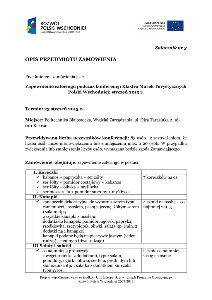 Załącznik nr 3 OPIS PRZEDMIOTU ZAMÓWIENIA Przedmiotem zamówienia jest: Zapewnienie cateringu podczas konferencji Klastra Marek Turystycznych Polski Wschodniej: styczeń 2015 r. Termin: 23 styczeń 2015 r., Miejsce: Politechnika Białostocka, Wydział Zarządzania, ul. Ojca Tarasiuka 2, 16001 Kleosin. Przewidywana liczba uczestników konferencji: 85 osób , z zastrzeżeniem, że liczba osób może ulec zwiększeniu lub zmniejszeniu max. o 20 osób. W przypadku zwiększenia lub zmniejszenia liczby osób, wymagana będzie zgoda Zamawiającego. Zamówienie obejmuje: zapewnienie cateringu w postaci: I. Koreczki kabanos + papryczka + ser żółty ser żółty + pomidor coctajlowy + kabanos ser żółty + oliwka + myśliwka ser mozzarella + pomidor suszony + myśliwka II. Kanapki kanapeczki dekoracyjne, do wyboru z serem typu camembert, łososiem, pastą jajeczną, żółtym serem i salami itp.; wszystkie kanapki z masłem; dodatki do kanapek: pomidor, ogórek, papryka, rzodkiewka, szczypiorek, oliwki, sałata itp. (min. 2 dodatki na 1 kanapkę) kanapki podane będą na pieczywie jasnym (jeden rodzaj) i ciemnym (dwa rodzaje) III Sałaty i sałatki co najmniej 3 propozycje 1 wegetariańska z dodatkami, typu: sałata, pomidory, ogórki, oliwki, ser feta, pestki dyni lub słonecznika itp. 1 sałatka z dodatkiem kurczaka typu gyros, 7 koreczków na os. 4 sztuki na osobę – co najmniej 240 g łącznie co najmniej 200g na osobę Projekt współfinansowany ze środków Unii Europejskiej w ramach Programu Operacyjnego Rozwój Polski Wschodniej 2007-2013 1 sałatka makaronowa lub z ryżem z dowolnymi dodatkami. III. Napoje zimne soki owocowe: pomarańczowy, jabłkowy, czarna porzeczka woda mineralna gazowana woda mineralna niegazowana IV. Napoje gorące kawa rozpuszczalna (w termosach) herbata – różne smaki do wyboru (wrzątek w termosie) mleko min. 2% do kawy cytryny świeże (pokrojone w plastry) cukier w opakowaniach 5 g V. Bufet deserowy ciasto – 3 rodzaje ciasteczka kruche – 3 rodzaje owoce – 3 rodzaje 300 ml na osobę 25 butelek po 500 ml 35 butelek po 500 ml min. 150 ml na osobę min. 150 ml na osobę min. 100 ml na osobę min. 3 cytryny 2 opakowania na osobę 150 g na osobę 50 g na osobę 200 g na osobę Bufet kawowo-deserowy dostępny przez cały czas trwania konferencji, tj. w godz. 9:00-16:00, uzupełniany w razie konieczności. Menu podlega akceptacji przez Zamawiającego. Dodatkowe wymagania: 1. Przygotowanie i dostarczenie cateringu 2. Wyposażenie w niezbędny sprzęt 3. Wyposażenie w serwetki, zastawę szklaną i porcelanową oraz sztućce w odpowiedniej ilości, zgodnie z zadeklarowaną przez Zamawiającego liczbą osób (informacja o ilości osób będzie przekazywana Wykonawcy na dzień przed danym spotkaniem) 4. Odbiór sprzętu i naczyń oraz uprzątnięcie po zakończeniu spotkania. Zamówienie może zostać zrealizowane wyłącznie przy użyciu produktów spełniających normy jakości produktów spożywczych, przestrzegania przepisów prawnych w zakresie przechowywania i przygotowywania artykułów spożywczych (m. in. ustawy z dnia 25 sierpnia 2006 r. o bezpieczeństwie żywności i żywienia t. jedn. Dz. U. 2010 nr 136 poz. 914 ze zm.). Projekt współfinansowany ze środków Unii Europejskiej w ramach Programu Operacyjnego Rozwój Polski Wschodniej 2007-2013