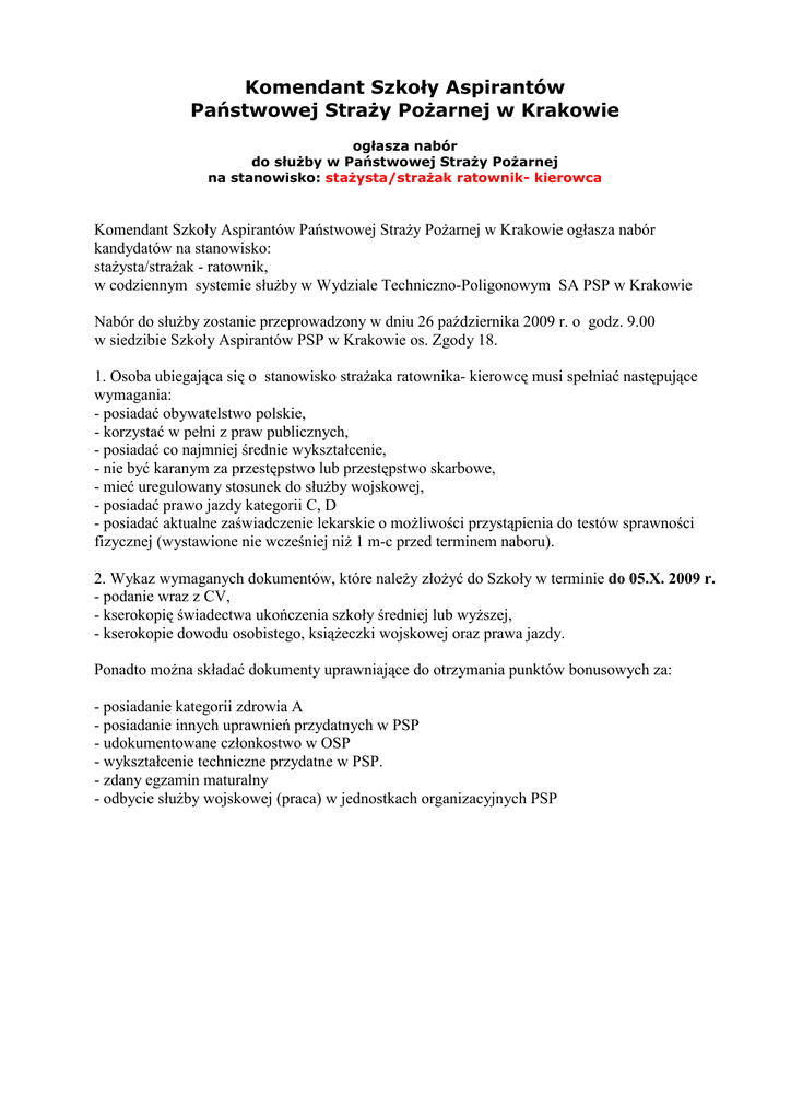 Komendant Szkoły Aspirantów Państwowej StraŜy PoŜarnej w Krakowie ogłasza nabór do słuŜby w Państwowej StraŜy PoŜarnej na stanowisko: staŜysta/straŜak ratownik- kierowca Komendant Szkoły Aspirantów Państwowej StraŜy PoŜarnej w Krakowie ogłasza nabór kandydatów na stanowisko: staŜysta/straŜak - ratownik, w codziennym systemie słuŜby w Wydziale Techniczno-Poligonowym SA PSP w Krakowie Nabór do słuŜby zostanie przeprowadzony w dniu 26 października 2009 r. o godz. 9.00 w siedzibie Szkoły Aspirantów PSP w Krakowie os. Zgody 18. 1. Osoba ubiegająca się o stanowisko straŜaka ratownika- kierowcę musi spełniać następujące wymagania: - posiadać obywatelstwo polskie, - korzystać w pełni z praw publicznych, - posiadać co najmniej średnie wykształcenie, - nie być karanym za przestępstwo lub przestępstwo skarbowe, - mieć uregulowany stosunek do słuŜby wojskowej, - posiadać prawo jazdy kategorii C, D - posiadać aktualne zaświadczenie lekarskie o moŜliwości przystąpienia do testów sprawności fizycznej (wystawione nie wcześniej niŜ 1 m-c przed terminem naboru). 2. Wykaz wymaganych dokumentów, które naleŜy złoŜyć do Szkoły w terminie do 05.X. 2009 r. - podanie wraz z CV, - kserokopię świadectwa ukończenia szkoły średniej lub wyŜszej, - kserokopie dowodu osobistego, ksiąŜeczki wojskowej oraz prawa jazdy. Ponadto moŜna składać dokumenty uprawniające do otrzymania punktów bonusowych za: - posiadanie kategorii zdrowia A - posiadanie innych uprawnień przydatnych w PSP - udokumentowane członkostwo w OSP - wykształcenie techniczne przydatne w PSP. - zdany egzamin maturalny - odbycie słuŜby wojskowej (praca) w jednostkach organizacyjnych PSP REKRUTACJA I POSTĘPOWANIE Rekrutację prowadzić będzie Komisja Kwalifikacyjna, powołana przez Komendanta Szkoły Aspirantów PSP w Krakowie, która zweryfikuje zgodność złoŜonych ofert ze stawianymi wymaganiami, dokona oceny złoŜonych dokumentów za pomocą punktów gratyfikacyjnych, podda kandydatów ocenie sprawności fizycznej oraz przeprowadzi rozmowę kwalifikacyjną z kandydatami. Rekrutacja ma charakter 5 etapowy: I etap postępowania kwalifikacyjnego: weryfikacja złoŜonych ofert pod kątem stawianych wymagań oraz dokonanie oceny złoŜonych dokumentów za pomocą punktów gratyfikacyjnych. Z dalszego postępowania zostaną wyłączeni kandydaci, których oferty nie będą spełniały stawianych wymagań formalnych lub będą niekompletne. Punktacja gratyfikująca posiadane uprawnienia i umiejętności jest następująca: Liczba punktów - posiadanie kategorii zdrowia A 5 - posiadanie innych uprawnień przydatnych w PSP 5 - udokumentowane członkostwo w OSP 3 - posiadanie kat. prawa jazdy E 5 - zdany egzamin maturalny 3 - wiek do 28 lat 5 - odbycie słuŜby wojskowej (praca) w jednostkach PSP 15 II etap postępowania kwalifikacyjnego: poddanie kandydatów ocenie sprawności fizycznej obejmującej: 1. próbę wydolnościową, 2. próbę akrofobii – wejścia i zejścia po drabinie (przy pełnej asekuracji) na wysokość 25 metrów 3. test sprawności fizycznej Do oceny sprawności fizycznej przystąpią kandydaci zakwalifikowani w I etapie. Kandydat przystępujący do oceny sprawności fizycznej powinien posiadać dowód osobisty, strój i obuwie sportowe. Ocena sprawności fizycznej przeprowadzona zostanie zgodnie z Rozporządzeniem Ministra Spraw Wewnętrznych i Administracji z dnia 27 października 2005 r. w sprawie zakresu, trybu i częstotliwości przeprowadzania okresowych profilaktycznych badań lekarskich oraz okresowej oceny sprawności fizycznej straŜaka Państwowej StraŜy PoŜarnej (Dz. U. Nr 261 poz. 2191). Do punktacji nie uwzględnia się punktów preferencyjnych z tytułu wieku. Ocena sprawności fizycznej: 1. Próba wydolnościowa i próba akrofobii Kandydaci przystępujący do próby wydolnościowej i próby akrofobii winni stawić się w siedzibie Szkoły Aspirantów PSP w Krakowie w dniu 14 października br. Próba wydolnościowa, jest to zmodyfikowana metoda harwardzka polegająca na wejściu na stopień o wysokości 40 cm dla męŜczyzn, w tempie 30 razy w ciągu 1 minuty. Czas trwania pełnego ćwiczenia wynosi 5 minut dla męŜczyzn. W przypadku nie osiągnięcia wskaźnika wydolności na poziomie co najmniej przeciętnym (65) kandydata nie dopuszcza się do testu sprawności fizycznej. Próba akrofobii polega na wejściu i zejściu po drabinie nachylonej pod kątem 45 º - na wysokość 25 metrów (przy pełnej asekuracji). Stanowi element badania u kandydata lęku przed wysokością. Stwierdzony podczas próby wejścia i zejścia po drabinie lęk wysokości, objawiający się w szczególności problemem w sprawnym wejściu i zejściu oraz związanym z tym zachwianiem równowagi, dyskwalifikuje kandydata z dalszego postępowania. 2. Test sprawności fizycznej: Kandydaci przystępujący do testu sprawności fizycznej winni stawić się w Szkole w dniu 21. 10. 2009 r. - Test obejmuje: bieg na 1000 m, bieg na 50 m, podciąganie się na drąŜku (drąŜek na wysokości doskocznej). Indywidualne wyniki kandydata uzyskane w poszczególnych konkurencjach testu sprawności fizycznej przelicza się na punkty wg tabeli stanowiącej załącznik do rozporządzenia Ministra Spraw Wewnętrznych i Administracji z dnia 27 października 2005 r. w sprawie zakresu, trybu i częstotliwości okresowych profilaktycznych badań lekarskich oraz okresowej oceny sprawności fizycznej straŜaka Państwowej StraŜy PoŜarnej (Dz. U. Nr 261, poz. 2191). Do punktacji nie uwzględnia się punktów preferencyjnych z tytułu wieku. Nie zaliczenie jednej z konkurencji lub uzyskanie średniej liczby punktów poniŜej 51 jest równoznaczne z wyeliminowaniem kandydata z postępowania rekrutacyjnego. Nie przystąpienie przez kandydata do oceny sprawności fizycznej jest jednoznaczne z rezygnacją z ubiegania się o przyjęcie do słuŜby w Państwowej StraŜy PoŜarnej. III etap pos