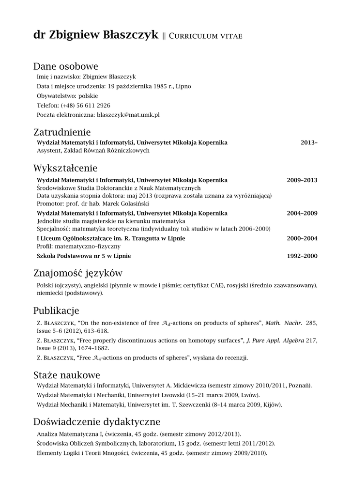 dr Zbigniew Błaszczyk || Curriculum vitae Dane osobowe Imi˛ e i nazwisko: Zbigniew Błaszczyk Data i miejsce urodzenia: 19 października 1985 r., Lipno Obywatelstwo: polskie Telefon: (+48) 56 611 2926 Poczta elektroniczna: [email protected] Zatrudnienie Wydział Matematyki i Informatyki, Uniwersytet Mikołaja Kopernika Asystent, Zakład Równań Różniczkowych 2013– Wykształcenie Wydział Matematyki i Informatyki, Uniwersytet Mikołaja Kopernika Środowiskowe Studia Doktoranckie z Nauk Matematycznych Data uzyskania stopnia doktora: maj 2013 (rozprawa została uznana za wyróżniajac ˛ a) ˛ Promotor: prof. dr hab. Marek Golasiński 2009–2013 Wydział Matematyki i Informatyki, Uniwersytet Mikołaja Kopernika Jednolite studia magisterskie na kierunku matematyka Specjalność: matematyka teoretyczna (indywidualny tok studiów w latach 2006–2009) 2004–2009 I Liceum Ogólnokształcace ˛ im. R. Traugutta w Lipnie Profil: matematyczno–fizyczny 2000–2004 Szkoła Podstawowa nr 5 w Lipnie 1992–2000 Znajomość j˛ ezyków Polski (ojczysty), angielski (płynnie w mowie i piśmie; certyfikat CAE), rosyjski (średnio zaawansowany), niemiecki (podstawowy). Publikacje Z. Błaszczyk, “On the non-existence of free Ad -actions on products of spheres”, Math. Nachr. 285, Issue 5–6 (2012), 613–618. Z. Błaszczyk, “Free properly discontinuous actions on homotopy surfaces”, J. Pure Appl. Algebra 217, Issue 9 (2013), 1674–1682. Z. Błaszczyk, “Free A4 -actions on products of spheres”, wysłana do recenzji. Staże naukowe Wydział Matematyki i Informatyki, Uniwersytet A. Mickiewicza (semestr zimowy 2010/2011, Poznań). Wydział Matematyki i Mechaniki, Uniwersytet Lwowski (15–21 marca 2009, Lwów). Wydział Mechaniki i Matematyki, Uniwersytet im. T. Szewczenki (8–14 marca 2009, Kijów). Doświadczenie dydaktyczne Analiza Matematyczna I, ćwiczenia, 45 godz. (semestr zimowy 2012/2013). Środowiska Obliczeń Symbolicznych, laboratorium, 15 godz. (semestr letni 2011/2012). Elementy Logiki i Teorii Mnogości, ćwiczenia, 45 godz. (semestr zimowy 2009/2010). Zbigniew Błaszczyk – Curriculum vitae Udział w konferencjach i seminariach z referatem Seminarium Zakładu Geometrii i Topologii, UAM (17 stycznia 2013, Poznań). Sympozjum “Geometria rozmaitości i działania grup” (6–9 września 2012, Gdańsk). 6th European Congress of Mathematics (2–7 lipca 2012, Kraków). Sympozjum “Geometria rozmaitości i działania grup” (10–13 listopada 2011, Zakopane). Israeli–Polish Mathematical Meeting (11–15 września 2011, Łódź). Sympozjum “Geometria rozmaitości i działania grup”, UAM (17–18 czerwca 2011, Poznań). Seminarium Katedry Algebry i Geometrii, UMK (10 maja 2011, Toruń). Seminarium “Metody topologiczne i wariacyjne”, UMK (10 maja 2010, Toruń). Seminarium Katedry Geometrii i Topologii, Uniwersytet Lwowski (16 marca 2009, Lwów) Seminarium Katedry Geometrii i Topologii, Ukraińska Akademia Nauk (11 marca 2009, Kijów). Seminarium doktoranckie prof. A. Prishlyaka, Uniwersytet im. T. Szewczenki (10 marca 2009, Kijów). Udział w szkołach i warsztatach z referatem Workshop on Algebraic and Geometric Topology (16–21 lipca 2012, Warszawa). Brazilian–Polish Topology Workshop (9–14 lipca 2012, Toruń). Toruńska Letnia Szkoła Matematyki (31 sierpnia–4 września 2009, Toruń). VI Matematyczne Warsztaty Kół Naukowych (29–30 listopada 2008, Toruń). V Matematyczne Warsztaty Kół Naukowych (28–30 marca 2008, Hel). IV Matematyczne Warsztaty Kół Naukowych (15–16 grudnia 2007, Toruń). III Letnia Szkoła Algebry i Topologii (3–7 września 2007, Gliwice). Pozostałe konferencje, szkoły i warsztaty Applied Topology (21–27 lipca 2013, B˛ edlewo). Minikonferencja dla doktorantów IV (13–14 kwietnia 2012, Toruń). VI Sympozjum Analizy Nieliniowej (7–9 września 2011, Toruń). Minikonferencja dla doktorantów II (8–9 kwietnia 2011, Poznań). Minikonferencja dla doktorantów I (8–9 października 2010, Warszawa). Group Actions in Topology and Geometric Group Theory (14–18 czerwca 2010, Poznań). The Second W. Killing and K. Weierstrass Colloquium (24–26 marca 2010, Braniewo). Conference on Algebraic Topology CAT’09 (6–11 lipca 2009, Warszawa). Zimowa Szkoła Centrum Badań Nieliniowych im. J. P. Schaudera (9–13 lutego 2009, Toruń). Conference on Algebraic and Geometric Topology (9–13 czerwca 2008, Gdańsk). Fifth Symposium on Nonlinear Analysis (10–14 września 2007, Toruń). Algebraic Topology: Old and New – Postnikov Memorial Conference (18–24 czerwca 2007, B˛ edlewo). Nagrody i wyróżnienia Zaproszenie do wygłoszenia referatu w trakcie sesji tematycznej “Homotopy Theory” podczas konferencji Israeli–Polish Mathematical Meeting. Kwalifikacja do programu Środowiskowych Studiów Doktoranckich z Nauk Matematycznych. Stypendium ministra nauki i szkolnictwa wyższego w roku akademickim 2008/2009. Tytuł najlepszego studenta Wydziału Matematyki i Informatyki UMK w roku akademickim 2007/2008. Stypendium marszałka województwa kujawsko-pomorskiego w semestrach: zimowym oraz letnim roku akademickiego 2007/2008. III nagroda w konkursie na najlepszy referat za odczyt On cell decomposition of SO(n) w trakcie III Letniej Szkoły Algebry i Topologii. 2/3 Zbigniew Błaszczyk – Curriculum vitae Działalność organizacyjna i popularnonaukowa Przedstawiciel doktorantów w Radzie Wydziału Matematyki i Informatyki UMK (2011–2013). Członek Wydziałowej Komisji Stypendialnej Doktorantów (rok akademicki 2009/2010). Współorganizacja proseminariów poświ˛ econych: topologicznej K-teorii (rok akademicki 2007/2008), homologiom persystentnym (semestr zimowy 2011/2012). Współorganizacja Toruńskiej Letniej Szkoły Matematyki (31 sierpnia–4 września 2009, Toruń). Udział w 9. Toruńskim Festiwalu Nauki i Sztuki – referat “2, 3, 5, 7, . . . ”, czyli o liczbach pierwszych słów kilka (25 kwietnia 2009, Toruń)
