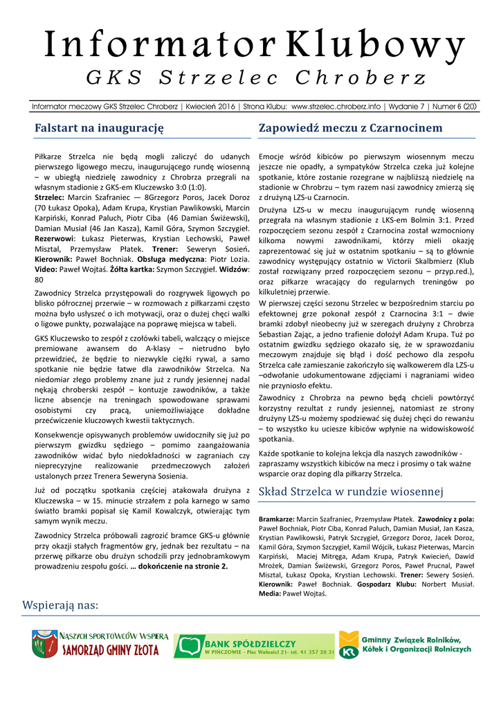Informator Klubowy GKS Strzelec Chroberz Informator meczowy GKS Strzelec Chroberz | Kwiecień 2016 | Strona Klubu: www.strzelec.chroberz.info | Wydanie 7 | Numer 6 (20) Falstartnainaugurację ZapowiedźmeczuzCzarnocinem Piłkarze Strzelca nie będą mogli zaliczyć do udanych pierwszego ligowego meczu, inaugurującego rundę wiosenną – w ubiegłą niedzielę zawodnicy z Chrobrza przegrali na własnym stadionie z GKS-em Kluczewsko 3:0 (1:0). Strzelec: Marcin Szafraniec — 8Grzegorz Poros, Jacek Doroz (70 Łukasz Opoka), Adam Krupa, Krystian Pawlikowski, Marcin Karpiński, Konrad Paluch, Piotr Ciba (46 Damian Świżewski), Damian Musiał (46 Jan Kasza), Kamil Góra, Szymon Szczygieł. Rezerwowi: Łukasz Pieterwas, Krystian Lechowski, Paweł Misztal, Przemysław Płatek. Trener: Seweryn Sosień. Kierownik: Paweł Bochniak. Obsługa medyczna: Piotr Lozia. Video: Paweł Wojtaś. Żółta kartka: Szymon Szczygieł. Widzów: 80 Emocje wśród kibiców po pierwszym wiosennym meczu jeszcze nie opadły, a sympatyków Strzelca czeka już kolejne spotkanie, które zostanie rozegrane w najbliższą niedzielę na stadionie w Chrobrzu – tym razem nasi zawodnicy zmierzą się z drużyną LZS-u Czarnocin. Drużyna LZS-u w meczu inaugurującym rundę wiosenną przegrała na własnym stadionie z LKS-em Bolmin 3:1. Przed rozpoczęciem sezonu zespół z Czarnocina został wzmocniony kilkoma nowymi zawodnikami, którzy mieli okazję zaprezentować się już w ostatnim spotkaniu – są to głównie zawodnicy występujący ostatnio w Victorii Skalbmierz (Klub został rozwiązany przed rozpoczęciem sezonu – przyp.red.), oraz piłkarze wracający do regularnych treningów po kilkuletniej przerwie. W pierwszej części sezonu Strzelec w bezpośrednim starciu po efektownej grze pokonał zespół z Czarnocina 3:1 – dwie bramki zdobył nieobecny już w szeregach drużyny z Chrobrza Sebastian Zając, a jedno trafienie dołożył Adam Krupa. Tuż po ostatnim gwizdku sędziego okazało się, że w sprawozdaniu meczowym znajduje się błąd i dość pechowo dla zespołu Strzelca całe zamieszanie zakończyło się walkowerem dla LZS-u –odwołanie udokumentowane zdjęciami i nagraniami wideo nie przyniosło efektu. Zawodnicy z Chrobrza na pewno będą chcieli powtórzyć korzystny rezultat z rundy jesiennej, natomiast ze strony drużyny LZS-u możemy spodziewać się dużej chęci do rewanżu – to wszystko ku uciesze kibiców wpłynie na widowiskowość spotkania. Zawodnicy Strzelca przystępowali do rozgrywek ligowych po blisko półrocznej przerwie – w rozmowach z piłkarzami często można było usłyszeć o ich motywacji, oraz o dużej chęci walki o ligowe punkty, pozwalające na poprawę miejsca w tabeli. GKS Kluczewsko to zespół z czołówki tabeli, walczący o miejsce premiowane awansem do A-klasy – nietrudno było przewidzieć, że będzie to niezwykle ciężki rywal, a samo spotkanie nie będzie łatwe dla zawodników Strzelca. Na niedomiar złego problemy znane już z rundy jesiennej nadal nękają chroberski zespół – kontuzje zawodników, a także liczne absencje na treningach spowodowane sprawami osobistymi czy pracą, uniemożliwiające dokładne przećwiczenie kluczowych kwestii taktycznych. Konsekwencje opisywanych problemów uwidoczniły się już po pierwszym gwizdku sędziego – pomimo zaangażowania zawodników widać było niedokładności w zagraniach czy nieprecyzyjne realizowanie przedmeczowych założeń ustalonych przez Trenera Seweryna Sosienia. Już od początku spotkania częściej atakowała drużyna z Kluczewska – w 15. minucie strzałem z pola karnego w samo światło bramki popisał się Kamil Kowalczyk, otwierając tym samym wynik meczu. Zawodnicy Strzelca próbowali zagrozić bramce GKS-u głównie przy okazji stałych fragmentów gry, jednak bez rezultatu – na przerwę piłkarze obu drużyn schodzili przy jednobramkowym prowadzeniu zespołu gości. … dokończenie na stronie 2. Wspierająnas: Każde spotkanie to kolejna lekcja dla naszych zawodników zapraszamy wszystkich kibiców na mecz i prosimy o tak ważne wsparcie oraz doping dla piłkarzy Strzelca. SkładStrzelcawrundziewiosennej Bramkarze: Marcin Szafraniec, Przemysław Płatek. Zawodnicy z pola: Paweł Bochniak, Piotr Ciba, Konrad Paluch, Damian Musiał, Jan Kasza, Krystian Pawlikowski, Patryk Szczygieł, Grzegorz Doroz, Jacek Doroz, Kamil Góra, Szymon Szczygieł, Kamil Wójcik, Łukasz Pieterwas, Marcin Karpiński, Maciej Mitręga, Adam Krupa, Patryk Kwiecień, Dawid Mrożek, Damian Świżewski, Grzegorz Poros, Paweł Prucnal, Paweł Misztal, Łukasz Opoka, Krystian Lechowski. Trener: Sewery Sosień. Kierownik: Paweł Bochniak. Gospodarz Klubu: Norbert Musiał. Media: Paweł Wojtaś. …dokończenie ze strony 1. Druga połowa rozpoczęła się optymistycznie dla zespołu Strzelca, bliski wyrównania był Konrad Paluch, jednak jego strzał z dogodnej pozycji został skierowany nieznacznie obok słupka. W 60. minucie faulowany w polu karnym był jeden z zawodników Kluczewska, a strzał z 11-metrów pewnie na gola zamienił Karol Banaszczyk. Ten sam zawodnik kilka minut później wykorzystał zamieszanie pod bramką Marcina Szafrańca, nie dając bramkarzowi Strzelca szans na obronę jego strzału, wyprowadzając drużynę z Kluczewska na trzybramkowe prowadzenie – wynik nie zmienił się już do końca spotkania. Zespół gości zaprezentował się naprawdę bardzo dobrze, potwierdzając swoje aspiracje do walki o czołowe miejsca w tabeli. Pomimo niezbyt korzystnego rezultatu, odnaleźć można jednak i pozytywne aspekty. Zgodnie z wcześniejszymi zapowiedziami drużyna Strzelca budowana jest z myślą o przyszłości, każdy mecz jest szansą do poprawy wzajemnego rozumienia się zawodników na boisku – efekty powinny być widoczne już w najbliższym czasie. MeczeStrzelcawlidze 10 KWI 17 KWI 24 KWI 1 MAJ 8 MAJ 15 MAJ 22 MAJ 26 MAJ 29 MAJ 5 CZE 11:00 Strzelec Chroberz — LZS Czarnocin 11: