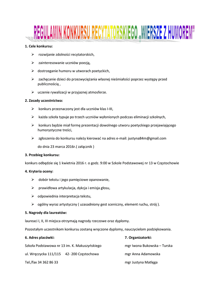 1. Cele konkursu: rozwijanie zdolności recytatorskich, zainteresowanie uczniów poezją, dostrzeganie humoru w utworach poetyckich, zachęcanie dzieci do przezwyciężania własnej nieśmiałości poprzez występy przed publicznością , uczenie rywalizacji w przyjaznej atmosferze. 2. Zasady uczestnictwa: konkurs przeznaczony jest dla uczniów klas I-III, każda szkoła typuje po trzech uczniów wyłonionych podczas eliminacji szkolnych, konkurs będzie miał formę prezentacji dowolnego utworu poetyckiego przejawiającego humorystyczne treści, zgłoszenia do konkursu należy kierować na adres e-mail: [email protected] do dnia 23 marca 2016r.( załącznik ) 3. Przebieg konkursu: konkurs odbędzie się 1 kwietnia 2016 r. o godz. 9:00 w Szkole Podstawowej nr 13 w Częstochowie 4. Kryteria oceny: dobór tekstu i jego pamięciowe opanowanie, prawidłowa artykulacja, dykcja i emisja głosu, odpowiednia interpretacja tekstu, ogólny wyraz artystyczny ( uzasadniony gest sceniczny, element ruchu, strój ). 5. Nagrody dla laureatów: laureaci I, II, III miejsca otrzymają nagrody rzeczowe oraz dyplomy. Pozostałym uczestnikom konkursu zostaną wręczone dyplomy, nauczycielom podziękowania. 6. Adres placówki: 7. Organizatorki: Szkoła Podstawowa nr 13 im. K. Makuszyńskiego mgr Iwona Bukowska – Turska ul. Wręczycka 111/115 mgr Anna Adamowska Tel./fax 34 362 86 33 42- 200 Częstochowa mgr Justyna Matlęga