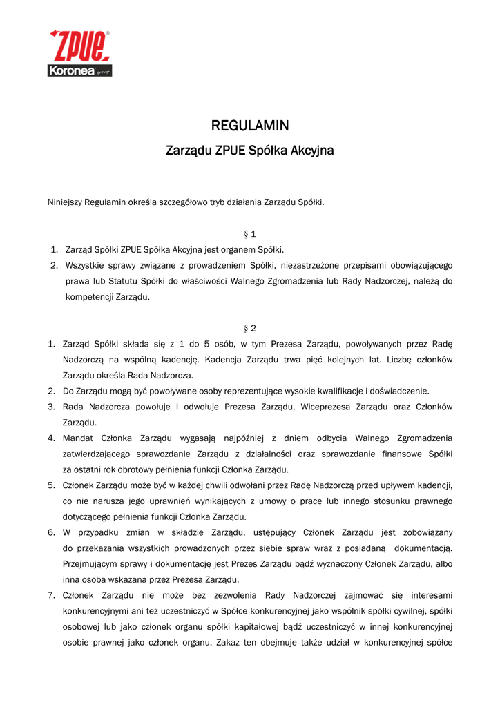 REGULAMIN Zarządu ZPUE Spółka Akcyjna Niniejszy Regulamin określa szczegółowo tryb działania Zarządu Spółki. §1 1. Zarząd Spółki ZPUE Spółka Akcyjna jest organem Spółki. 2. Wszystkie sprawy związane z prowadzeniem Spółki, niezastrzeżone przepisami obowiązującego prawa lub Statutu Spółki do właściwości Walnego Zgromadzenia lub Rady Nadzorczej, należą do kompetencji Zarządu. §2 1. Zarząd Spółki składa się z 1 do 5 osób, w tym Prezesa Zarządu, powoływanych przez Radę Nadzorczą na wspólną kadencję. Kadencja Zarządu trwa pięć kolejnych lat. Liczbę członków Zarządu określa Rada Nadzorcza. 2. Do Zarządu mogą być powoływane osoby reprezentujące wysokie kwalifikacje i doświadczenie. 3. Rada Nadzorcza powołuje i odwołuje Prezesa Zarządu, Wiceprezesa Zarządu oraz Członków Zarządu. 4. Mandat Członka Zarządu wygasają najpóźniej z dniem odbycia Walnego Zgromadzenia zatwierdzającego sprawozdanie Zarządu z działalności oraz sprawozdanie finansowe Spółki za ostatni rok obrotowy pełnienia funkcji Członka Zarządu. 5. Członek Zarządu może być w każdej chwili odwołani przez Radę Nadzorczą przed upływem kadencji, co nie narusza jego uprawnień wynikających z umowy o pracę lub innego stosunku prawnego dotyczącego pełnienia funkcji Członka Zarządu. 6. W przypadku zmian w składzie Zarządu, ustępujący Członek Zarządu jest zobowiązany do przekazania wszystkich prowadzonych przez siebie spraw wraz z posiadaną dokumentacją. Przejmującym sprawy i dokumentację jest Prezes Zarządu bądź wyznaczony Członek Zarządu, albo inna osoba wskazana przez Prezesa Zarządu. 7. Członek Zarządu nie może bez zezwolenia Rady Nadzorczej zajmować się interesami konkurencyjnymi ani też uczestniczyć w Spółce konkurencyjnej jako wspólnik spółki cywilnej, spółki osobowej lub jako członek organu spółki kapitałowej bądź uczestniczyć w innej konkurencyjnej osobie prawnej jako członek organu. Zakaz ten obejmuje także udział w konkurencyjnej spółce kapitałowej, w przypadku posiadania w niej przez Członka Zarządu co najmniej 10 % udziałów lub akcji bądź prawa do powołania co najmniej jednego członka zarządu. 8. W przypadku sprzeczności interesów Spółki z interesami Członka Zarządu, jego współmałżonka, krewnych i powinowatych do drugiego stopnia oraz osób, z którymi jest powiązany osobiście, Członek Zarządu powinien wstrzymać się od udziału w rozstrzyganiu takich spraw i może żądać zaznaczenia tego w protokole. 9. Wysokość wynagrodzeń oraz zasady wynagradzania Członków Zarządu określa Rada Nadzorcza. 10. W umowie między Spółką a Członkiem Zarządu, jak również w sporze z nim, Spółkę reprezentuje Rada Nadzorcza, jej delegowany Członek albo pełnomocnik powołany uchwałą Walnego Zgromadzenia. §3 1. Zarząd prowadzi sprawy Spółki kolegialnie i reprezentuje Spółkę we wszystkich czynnościach sądowych i pozasądowych. 2. Członkowie Zarządu wykonują swoje obowiązki osobiście. 3. Zarząd może udzielić pełnomocnictwa lub prokury. 4. Udzielenie prokury wymaga zgody wszystkich Członków Zarządu. Prokurę może odwołać każdy z Członków Zarządu. 5. Zarząd ustanawia pełnomocników i określa zasady dokonywania czynności prawnych związanych z prowadzeniem określonych spraw Spółki. 6. Do składania oświadczeń woli i podpisywania dokumentów w imieniu Spółki jest wymagane współdziałanie dwóch Członków Zarządu lub Członka Zarządu i jednego prokurenta łącznego. 7. Zarząd może upoważnić Członka Zarządu lub inną osobę do wykonywania czynności w sprawach z zakresu prawa pracy. §4 1. Uchwały Zarządu wymagają wszystkie sprawy przekraczające zakres zwykłych czynności Spółki, a w szczególności: 1) uchwalanie rocznych i wieloletnich planów działalności Spółki, w tym planów inwestycyjnych oraz strategicznych planów wieloletnich, 2) przyjęcie regulaminu Zarządu, regulaminu organizacyjnego przedsiębiorstwa Spółki, struktury organizacyjnej, regulaminu pracy oraz regulaminu wynagradzania, 3) ustalanie zasad gospodarki finansowej i systemu ekonomicznego przedsiębiorstwa Spółki, 4) ustanowienie prokury oraz pełnomocnika, za wyjątkiem pełnomocnika procesowego, 5) zbycie i nabycie nieruchomości lub prawa użytkowania wieczystego, z zastrzeżeniem uprzedniego uzyskania zgody Rady Nadzorczej, 6) nabycie, zbycie lub obciążenie składników aktywów trwałych, innych niż wskazane w § 4 ust. 1 pkt 5) Regulaminu, 7) wzięcie w leasing, dzierżawę, najem, użytkowanie lub przyjęcie do jakiegokolwiek innego używania nieruchomości, 8) zaciąganie pożyczek i kredytów, 9) zaciąganie zobowiązań warunkowych, w tym udzielanie przez Spółkę gwarancji, poręczeń oraz wystawianie weksli, 10) wydzierżawienie nieruchomości, 11) tworzenie i przystępowanie do spółek prawa handlowego, 12) objęcie lub nabycie akcji lub udziałów innej spółki prawa handlowego, 13) zbywanie akcji i udziałów w podmiotach zależnych Spółki, 14) tworzenie i likwidacja oddziałów. 2. Niezależnie od spraw wymienionych w § 4 ust. 1 Regulaminu, uchwał Zarządu wymagają sprawy podlegające zaopiniowaniu lub zatwierdzeniu przez Radę Nadzorczą albo Walne Zgromadzenie oraz przyjęcie innych materiałów, kierowanych przez Zarząd do Rady Nadzorczej. 3. Uchwały Zarządu podejmowane są w głosowaniu jawnym. Na żądanie choćby jednego z głosujących, zarządza się głosowanie tajne. 4. Dla ważności uchwał Zarządu wymagana jest obecność na posiedzeniu co najmniej dwóch Członków Zarządu. 5. Uchwały Zarządu zapadają zwykłą większością głosów oddanych. 6. W uzasadnionych przypadkach dopuszcza się możliwość głosowania w trybie pisemnym lub przy wykorzystaniu środków bezpośredniego porozumiewania się na odległość. 7. W przypadku równej liczby głosów oddanych za uchwałą lub przeciwko uchwale, rozs
