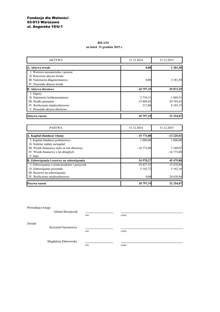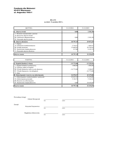 Fundacja dla Wolności 03-913 Warszawa ul. Angorska 19/U-1 BILANS na dzień 31 grudnia 2015 r. AKTYWA 31.12.2014 A. Aktywa trwałe I. Wartości niematerialne i prawne II. Rzeczowe aktywa trwałe III. Należności długoterminowe IV. Pozostałe aktywa trwałe 31.12.2015 0,00 2 381,58 0,00 2 381,58 B. Aktywa obrotowe I. Zapasy II. Należności krótkoterminowe III. Środki pieniężne IV. Rozliczenia międzyokresowe V. Pozostałe aktywa obrotowe 18 797,19 29 873,29 2 710,31 15 869,82 217,06 1 069,51 20 702,63 8 101,15 Aktywa razem 18 797,19 32 254,87 PASYWA 31.12.2014 A. Kapitał (fundusz) własny I. Kapitał (fundusz) podstawowy II. Należne wpłaty na kapitał III. Wynik finansowy netto za rok obrotowy IV. Wynik finansowy z lat ubiegłych V. Inne B. Zobowiązania i rezerwy na zobowiązania I. Zobowiązania z tytułu kredytów i pożyczek II. Zobowiązania pozostałe III. Rezerwy na zobowiązania IV. Rozliczenia międzyokresowe Pasywa razem Prowadzący księgi: Jolanta Skrzypczak data podpis data podpis data podpis Zarząd: Krzysztof Jarymowicz Magdalena Zaborowska 31.12.2015 - 15 773,08 1 000,00 - 13 225,01 1 000,00 - 16 773,08 2 548,07 - 16 773,08 34 570,27 29 427,55 5 142,72 45 479,88 15 678,88 5 162,16 0,00 24 638,84 18 797,19 32 254,87 Fundacja dla Wolności 03-913 Warszawa ul. Angorska 19/U-1 RACHUNEK ZYSKÓW i STRAT za okres od 1 stycznia 2015 r. do 31 grudnia 2015 r. POZYCJA 31.12.2014 31.12.2015 A. Przychody podstawowej działalności operacyjnej i zrównane z nimi 208 871,03 324 440,06 B. Koszty podstawowej działalności operacyjnej 225 221,79 321 414,76 18 214,17 63 738,08 143 269,54 45 173,92 89 104,31 187 136,53 18,22 184,01 18,22 184,01 D. Pozostałe koszty i straty, w tym aktualizacja aktywów 440,54 661,24 I. Koszty finansowe II. Inne koszty i straty E. Podatek dochodowy 440,54 661,24 I. Amortyzacja II. Zużycie materiałów i energii III. Wynagrodzenia oraz ubezpieczenia społeczne i inne świadczenia IV. Pozostałe koszty rodzajowe C. Pozostałe przychody i zyski, w tym aktualizacja aktywów I. Przychody finansowe II. Inne przychody i zyski F. Wynik finansowy netto ogółem I. Nadwyżka przychodów nad kosztami II. Nadwyżka kosztów nad przychodami 0,00 0,00 - 16 773,08 2 548,07 2 548,07 - 16 773,08 Prowadzący księgi: Jolanta Skrzypczak data podpis data podpis data podpis Zarząd: Krzysztof Jarymowicz Magdalena Zaborowska FUNDACJA DLA WOLNOŚCI 03-913 Warszawa ul. Angorska 19/U-1 INFORMACJA DODATKOWA do sprawozdania finansowego za okres od 1 stycznia 2015 r. do 31 grudnia 2015 r. WPROWADZENIE DO SPRAWOZDANIA FINANSOWEGO 1. Fundacja dla Wolności z siedzibą w Warszawie, przy ul. Angorskiej 19/ U-1 została zarejestrowana 23 grudnia 2004 r. w Sądzie Rejonowym dla m. st. Warszawy, XX Wydział Gospodarczy Krajowego Rejestru Sądowego, pod numerem KRS 0000224819. W dniu 20 kwietnia 2009 r. Fundacja została zarejestrowana jako organizacja pożytku publicznego. Fundacja nie prowadzi działalności gospodarczej. Czas trwania Fundacji jest nieoznaczony. Przedmiotem działalności Fundacji jest: a) dążenie do rozwoju społeczeństwa opartego na kryterium równości oraz zwalczanie wykluczenia społecznego, b) popularyzowanie kulturalnej i społecznej aktywności obywatelskiej poprzez organizację i wspieranie inicjatyw poszerzających wiedzę i propagujących przestrzeganie praw człowieka oraz innych praw i obowiązków obywateli, c) popularyzowanie i dążenie do przestrzegania wolności wypowiedzi, wolności dostępu do informacji oraz wolności dostępu do kształcenia, d) popularyzowanie integracji europejskiej oraz wiedzy na temat zagadnień związanych z procesami globalnymi. 2. Roczne sprawozdanie finansowe sporządzono za okres od 1 stycznia 2015 r. do 31 grudnia 2015 r. Sprawozdanie to nie podlega obowiązkowi badania przez biegłego rewidenta. 3. Roczne sprawozdanie finansowe sporządzono przy założeniu kontynuowania działalności przez Fundację przez co najmniej 12 kolejnych miesięcy i dłużej. Nie istnieją okoliczności wskazujące na zagrożenie kontynuowania przez nią działalności. 4. Zasady rachunkowości przewidziane dla jednostek mikro Fundacja sporządza sprawozdanie wg załącznika 4 do ustawy z 29 września 1994 r. o rachunkowości (Dz.U. z 2002 r. Nr 76, poz. 694, z późniejszymi zmianami). Fundacja korzysta z niestosowania zasady ostrożnej wyceny 5. Metody wyceny majątku oraz przychodów i kosztów Aktywa i pasywa wycenione zostały według zasad określonych w ustawie z 29 września 1994 r. o rachunkowości (Dz.U. z 2002 r. Nr 76, poz. 694, z późniejszymi zmianami), przy czym: Środki trwałe wykazywane są według cen nabycia. Amortyzacja ujęta w kosztach zgodnie z planem amortyzacji, naliczana jest metodą liniową poczynając od miesiąca, w którym przyjęto środki trwałe do eksploatacji. Składniki majątku o wartości nieprzekraczającej 3.500,00 PLN zaliczane są do kosztów w momencie przyjęcia do użytkowania. Należności i zobowiązania krajowe wykazane są w kwocie nominalnej. Należności i zobowiązania wyrażone w walucie obcej wyceniane były w ciągu roku obrotowego po średnim kursie NBP ogłoszonym w ostatnim dniu roboczym poprzedzającym dzień przeprowadzenia operacji. Środki pieniężne w walucie obcej wyceniane były w ciągu roku obrotowego według kursów stosowanych w dniu dokonania operacji przez bank prowadzący rachunek walutowy. Należności i zobowiązania wyrażone w walucie obcej oraz środki pieniężne w walucie obcej na dzień bilansowy nie występują. Nadwyżkę ujemnych różnic kursowych nad dodatnimi ustaloną na dzień bilansowy wykazano w rachunku wyników jako koszty finansowe. 1/4 DODATKOWE INFORMACJE I WYJAŚNIENIA I. Wyjaśnienia do bilansu 1. Wykaz zmian wartości majątku trwałego (sprzęt komputerowy) w ciągu roku obrotowego (w PLN): wartość początkowa: stan na początek roku grupa zwiększenia zmniejszenia stan na koniec roku maszyny, urządzenia i aparaty ogólnego zastoso