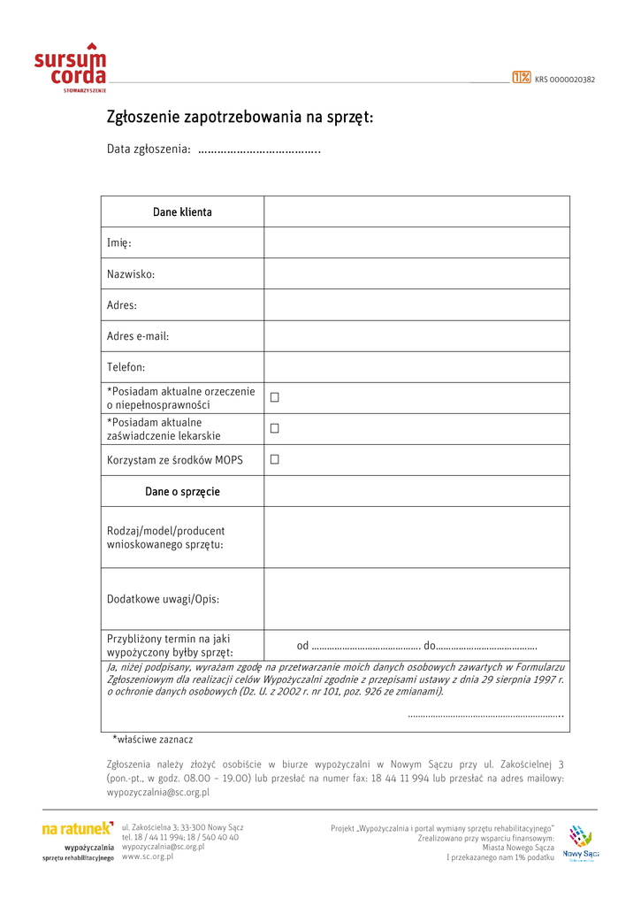 KRS 0000020382 Zgłoszenie zapotrzebowania na sprzęt: Data zgłoszenia: ……………………………….. Dane klienta Imię: Nazwisko: Adres: Adres e-mail: Telefon: *Posiadam aktualne orzeczenie o niepełnosprawności *Posiadam aktualne zaświadczenie lekarskie @ Korzystam ze środków MOPS @ @ Dane o sprzęcie Rodzaj/model/producent wnioskowanego sprzętu: Dodatkowe uwagi/Opis: Przybliżony termin na jaki od ……………………………………. do…………………………………. wypożyczony byłby sprzęt: Ja, niżej podpisany, wyrażam zgodę na przetwarzanie moich danych osobowych zawartych w Formularzu Zgłoszeniowym dla realizacji celów Wypożyczalni zgodnie z przepisami ustawy z dnia 29 sierpnia 1997 r. o ochronie danych osobowych (Dz. U. z 2002 r. nr 101, poz. 926 ze zmianami). …………………………………………………….. *właściwe zaznacz Zgłoszenia należy złożyć osobiście w biurze wypożyczalni w Nowym Sączu przy ul. Zakościelnej 3 (pon.-pt., w godz. 08.00 – 19.00) lub przesłać na numer fax: 18 44 11 994 lub przesłać na adres mailowy: [email protected] ul. Zakościelna 3; 33-300 Nowy Sącz tel. 18 / 44 11 994; 18 / 540 40 40 [email protected] www.sc.org.pl Projekt „Wypożyczalnia i portal wymiany sprzętu rehabilitacyjnego” Zrealizowano przy wsparciu finansowym: Miasta Nowego Sącza I przekazanego nam 1% podatku
