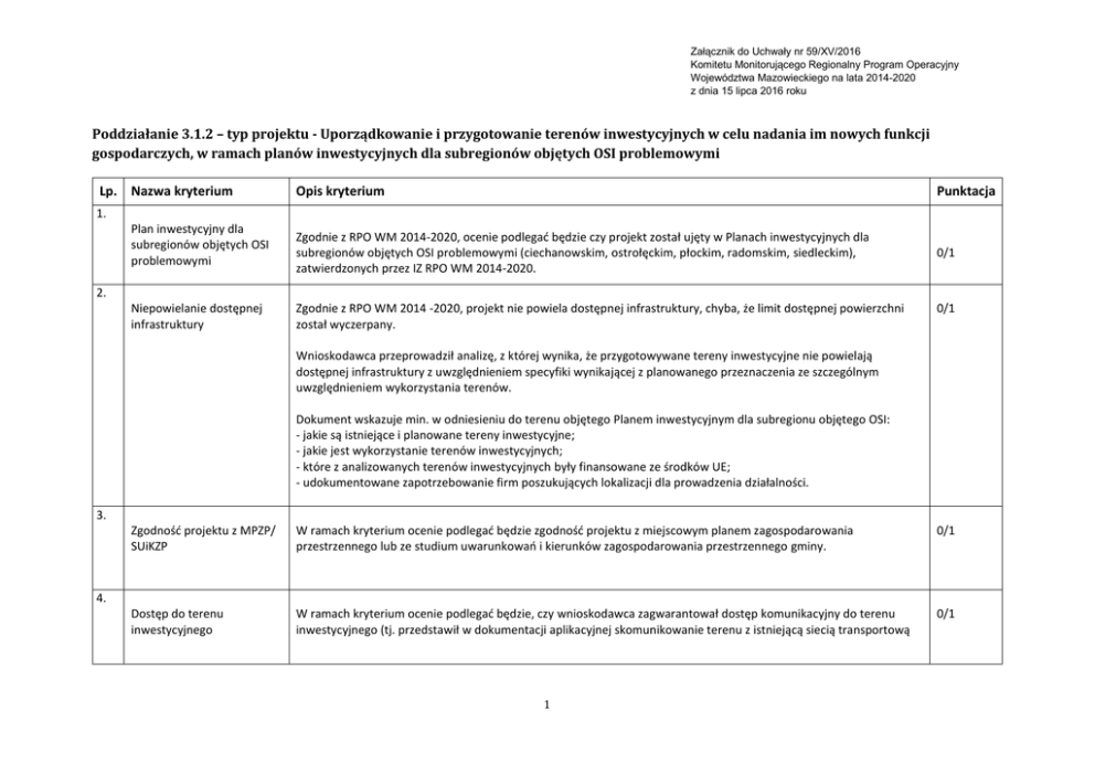 Załącznik do Uchwały nr 59/XV/2016 Komitetu Monitorującego Regionalny Program Operacyjny Województwa Mazowieckiego na lata 2014-2020 z dnia 15 lipca 2016 roku Poddziałanie 3.1.2 – typ projektu - Uporządkowanie i przygotowanie terenów inwestycyjnych w celu nadania im nowych funkcji gospodarczych, w ramach planów inwestycyjnych dla subregionów objętych OSI problemowymi Lp. Nazwa kryterium Opis kryterium Punktacja Zgodnie z RPO WM 2014-2020, ocenie podlegać będzie czy projekt został ujęty w Planach inwestycyjnych dla subregionów objętych OSI problemowymi (ciechanowskim, ostrołęckim, płockim, radomskim, siedleckim), zatwierdzonych przez IZ RPO WM 2014-2020. 0/1 1. Plan inwestycyjny dla subregionów objętych OSI problemowymi 2. Niepowielanie dostępnej infrastruktury Zgodnie z RPO WM 2014 -2020, projekt nie powiela dostępnej infrastruktury, chyba, że limit dostępnej powierzchni został wyczerpany. 0/1 Wnioskodawca przeprowadził analizę, z której wynika, że przygotowywane tereny inwestycyjne nie powielają dostępnej infrastruktury z uwzględnieniem specyfiki wynikającej z planowanego przeznaczenia ze szczególnym uwzględnieniem wykorzystania terenów. Dokument wskazuje min. w odniesieniu do terenu objętego Planem inwestycyjnym dla subregionu objętego OSI: - jakie są istniejące i planowane tereny inwestycyjne; - jakie jest wykorzystanie terenów inwestycyjnych; - które z analizowanych terenów inwestycyjnych były finansowane ze środków UE; - udokumentowane zapotrzebowanie firm poszukujących lokalizacji dla prowadzenia działalności. 3. Zgodność projektu z MPZP/ SUiKZP W ramach kryterium ocenie podlegać będzie zgodność projektu z miejscowym planem zagospodarowania przestrzennego lub ze studium uwarunkowań i kierunków zagospodarowania przestrzennego gminy. 0/1 Dostęp do terenu inwestycyjnego W ramach kryterium ocenie podlegać będzie, czy wnioskodawca zagwarantował dostęp komunikacyjny do terenu inwestycyjnego (tj. przedstawił w dokumentacji aplikacyjnej skomunikowanie terenu z istniejącą siecią transportową 0/1 4. 1 Załącznik do Uchwały nr 59/XV/2016 Komitetu Monitorującego Regionalny Program Operacyjny Województwa Mazowieckiego na lata 2014-2020 z dnia 15 lipca 2016 roku (kolejową lub drogową)) w momencie składania wniosku o dofinansowanie lub powinien złożyć deklarację, że zapewni dostęp komunikacyjny do terenu inwestycyjnego najpóźniej do czasu rzeczowego zakończenia realizacji projektu. KRYTERIA MERYTORYCZNE – SZCZEGÓŁOWE Poddziałanie 3.1.2 – typ projektu - Uporządkowanie i przygotowanie terenów inwestycyjnych w celu nadania im nowych funkcji gospodarczych, w ramach planów inwestycyjnych dla subregionów objętych OSI problemowymi L.p. Kryterium 1. Kompleksowość projektu Opis kryterium Punktacja Maksymalna liczba punktów Kryterium promuje projekty przygotowujące tereny inwestycyjne w sposób, jak najbardziej kompleksowy. Za każdy element po 4 punkty: 20 Kanalizacja; Wodociąg; Instalacja elektryczna; Instalacja gazowa lub ciepłownicza; Sieć światłowodowa Punkty w ramach kryterium sumują się. Brak spełnienia ww. warunków lub brak informacji w tym zakresie – 0 pkt. 2 Załącznik do Uchwały nr 59/XV/2016 Komitetu Monitorującego Regionalny Program Operacyjny Województwa Mazowieckiego na lata 2014-2020 z dnia 15 lipca 2016 roku 2. 3. Gotowość projektu do realizacji Uwarunkowania gospodarcze Kryterium promuje gotowość Wnioskodawcy do realizacji projektu. Promowane będą projekty posiadające wszystkie prawomocne wymagane pozwolenia na budowę lub Zezwolenia na Realizację Inwestycji Drogowej (ZRiD). Wnioskodawca posiada prawomocne pozwolenia na budowę lub ZRiD – 3 pkt W ramach kryterium weryfikowane jest, czy załączone listy intencyjne warunkują współpracę, z: 1. przedsiębiorcami prowadzącymi działalność eksportową; 2. przedsiębiorcami ponoszącymi nakłady na działalność badawczo rozwojową w jednym z trzech ostatnich zamkniętych lat sprawozdawczych; 3. przedsiębiorcami prowadzącymi działalność w ramach obszarów inteligentnej specjalizacji regionu wskazanych w załączniku numer 1 do Regionalnej Strategii Innowacji dla Mazowsza do 2020 roku. Ad.1 Nawiązanie współpracy z przedsiębiorcami prowadzącymi działalność eksportową z: 3 lub więcej inwestorami – 3 pkt 2 inwestorami – 2 pkt 1 inwestorem – 1 pkt Ad.2 Nawiązanie współpracy z przedsiębiorcami ponoszącymi nakłady na działalność badawczo rozwojową w jednym z trzech ostatnich zamkniętych lat sprawozdawczych z: 3 lub więcej inwestorami – 3 pkt 2 inwestorami – 2 pkt 1 inwestorem – 1 pkt Ad.3 Nawiązanie współpracy z przedsiębiorcami prowadzącymi działalność w ramach obszarów inteligentnej specjalizacji regionu wskazanych w załączniku nr 1 do Regionalnej Strategii Innowacji dla Mazowsza do 2020 roku z: 3 lub więcej inwestorami – 3 pkt 2 inwestorami – 2 pkt 1 inwestorem – 1 pkt Uwaga: 3 3 Brak spełnienia ww. warunków lub brak informacji w tym zakresie – 0 pkt. 9 Załącznik do Uchwały nr 59/XV/2016 Komitetu Monitorującego Regionalny Program Operacyjny Województwa Mazowieckiego na lata 2014-2020 z dnia 15 lipca 2016 roku Dopuszcza się zaklasyfikowanie tego samego inwestora w ramach poszczególnych podkryteriów. Punkty w ramach kryterium sumują się. Brak spełnienia ww. warunków lub brak informacji w tym zakresie – 0 pkt. 4. Lokalizacja projektu na terenie o zwiększonym bezrobociu Kryterium promuje projekty realizujące przedsięwzięcia na terenach o zwiększonej stopie bezrobocia. Rankingowanie wg wartości wskaźnika. Wskaźnik obliczony na podstawie danych GUS wg stanu na koniec roku poprzedzającego rok złożenia wniosku (dane dotyczące wskaźnika bezrobocia tj. stopa bezrobocia rejestrowanego). W przypadku projektów realizowanych w partnerstwie brany będzie pod uwagę wskaźnik korzystniejszy dla Wnioskodawcy. 5. Powierzchnia tworzonego terenu i