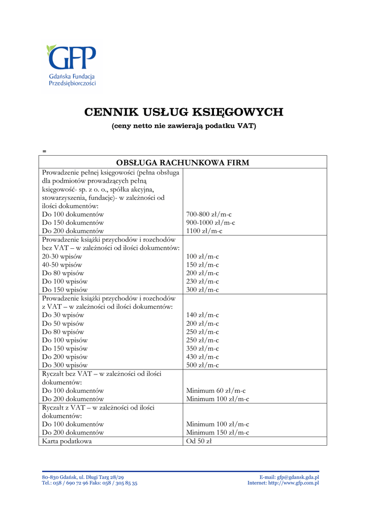 CENNIK USŁUG KSIĘGOWYCH (ceny netto nie zawierają podatku VAT) = OBSŁUGA RACHUNKOWA FIRM Prowadzenie pełnej księgowości (pełna obsługa dla podmiotów prowadzących pełną księgowość- sp. z o. o., spółka akcyjna, stowarzyszenia, fundacje)- w zaleŜności od ilości dokumentów: Do 100 dokumentów Do 150 dokumentów Do 200 dokumentów Prowadzenie ksiąŜki przychodów i rozchodów bez VAT – w zaleŜności od ilości dokumentów: 20-30 wpisów 40-50 wpisów Do 80 wpisów Do 100 wpisów Do 150 wpisów Prowadzenie ksiąŜki przychodów i rozchodów z VAT – w zaleŜności od ilości dokumentów: Do 30 wpisów Do 50 wpisów Do 80 wpisów Do 100 wpisów Do 150 wpisów Do 200 wpisów Do 300 wpisów Ryczałt bez VAT – w zaleŜności od ilości dokumentów: Do 100 dokumentów Do 200 dokumentów Ryczałt z VAT – w zaleŜności od ilości dokumentów: Do 100 dokumentów Do 200 dokumentów Karta podatkowa 80-830 Gdańsk, ul. Długi Targ 28/29 Tel.: 058 / 690 72 96 Faks: 058 / 305 85 35 700-800 zł/m-c 900-1000 zł/m-c 1100 zł/m-c 100 zł/m-c 150 zł/m-c 200 zł/m-c 230 zł/m-c 300 zł/m-c 140 zł/m-c 200 zł/m-c 250 zł/m-c 250 zł/m-c 350 zł/m-c 430 zł/m-c 500 zł/m-c Minimum 60 zł/m-c Minimum 100 zł/m-c Minimum 100 zł/m-c Minimum 150 zł/m-c Od 50 zł E-mail: [email protected] Internet: http://www.gfp.com.pl 2 OBSŁUGA KADR I PŁAC Za 1 pracownika Do 5 pracowników Do 10 pracowników PowyŜej 10 pracowników Deklaracje ZUS (składki, zasiłki chorobowe, deklaracje zgłoszeniowe, wyrejestrowujące) Sporządzanie deklaracji PIT- 4 +DRA + RCA +RSA + RZA +druczki wpłat 35 zł/m-c 50 zł/osobę/m-c 40 zł/osobę/m-c 20-40 zł/osobę/m-c 10-20 zł/osobę 60 zł/komplet. PRACE DODATKOWE Sporządzanie sprawozdania finansowego Od 500 do 2000 zł Sporządzanie sprawozdania do GUS Sporządzanie deklaracji PIT 28, 36, 37 Rozliczenie CIT+ deklaracja Rozliczenie VAT+ deklaracja Sporządzanie deklaracji PIT -5 Ewidencja i rozliczanie amortyzacji Sporządzanie rejestrów VAT Od 50 zł/szt. 50 zł/szt. Minimum 50zł/szt. Minimum 50 zł/szt. Minimum 50 zł/szt. od 50 zł 20-100 zł