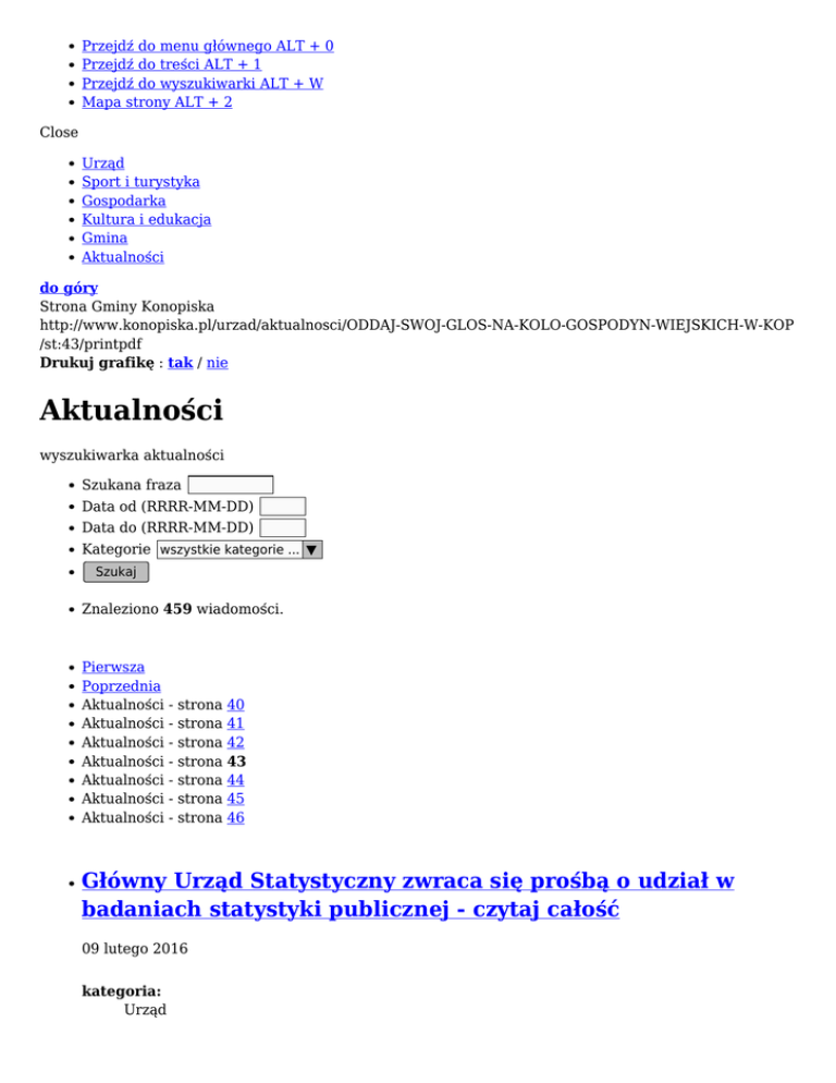 Przejdź do menu głównego ALT + 0 Przejdź do treści ALT + 1 Przejdź do wyszukiwarki ALT + W Mapa strony ALT + 2 Close Urząd Sport i turystyka Gospodarka Kultura i edukacja Gmina Aktualności do góry Strona Gminy Konopiska http://www.konopiska.pl/urzad/aktualnosci/ODDAJ-SWOJ-GLOS-NA-KOLO-GOSPODYN-WIEJSKICH-W-KOP /st:43/printpdf Drukuj grafikę : tak / nie Aktualności wyszukiwarka aktualności Szukana fraza Data od (RRRR-MM-DD) Data do (RRRR-MM-DD) Kategorie wszystkie kategorie ... ▼ Szukaj Znaleziono 459 wiadomości. Pierwsza Poprzednia Aktualności - strona 40 Aktualności - strona 41 Aktualności - strona 42 Aktualności - strona 43 Aktualności - strona 44 Aktualności - strona 45 Aktualności - strona 46 Główny Urząd Statystyczny zwraca się prośbą o udział w badaniach statystyki publicznej - czytaj całość 09 lutego 2016 kategoria: Urząd Przychylność wobec ankieterów statystycznych, czas im poświęcony, zapewnią wysoką jakość uzyskanych danych statystycznych. Ze statystyki publicznej od wielu lat korzystają nie tylko organy państwa, przedsiębiorcy, studenci i uczniowie, ale też ogół społeczeństwa. Każdy z nas poszukuje informacji o swoim kraju, województwie, regionie, czy miejscowości. Główny Urząd Statystyczny zwraca się prośbą Główny Urząd Statystyczny zwraca się prośbą o udział w badaniach statystyki publicznej - czytaj całość Zawiadomienie - czytaj całość 09 lutego 2016 kategoria: Urząd Na podstawie art. 20 ust. 1 ustawy o samorządzie gminnym z dnia 8 marca 1990 r. (Dz. U. z 2015 poz. 1515) zawiadamiam, że dnia: 16 lutego 2016 r. (wtorek) o godz. 12.00 w sali konferencyjnej Urzędu Gminy w Konopiskach odbędzie się: XIX sesja Rady Gminy Konopiska Zawiadomienie Zawiadomienie - czytaj całość Zwrot podatku akcyzowego zawartego w cenie oleju napędowego wykorzystywanego do produkcji rolnej w 2016 roku - czytaj całość 05 lutego 2016 kategoria: Urząd Uprzejmie informujemy, że od 1 lutego 2016r. do 29 lutego 2016 r. w Urzędzie Gminy w Konopiskach przyjmowane będą wnioski o zwrot podatku akcyzowego zawartego w cenie oleju napędowego wykorzystywanego do produkcji rolnej w pierwszym terminie. Zwrot podatku akcyzowego zawartego w cenie oleju n Zwrot podatku akcyzowego zawartego w cenie oleju napędowego wykorzystywanego do produkcji rolnej w 2016 roku - czytaj całość Obwieszczenie - czytaj całość 04 lutego 2016 kategoria: Urząd Obwieszczenie Wójta Gminy Konopiska Obwieszczenie Obwieszczenie - czytaj całość Projekt Strategii Rozwoju Gminy Konopiska 2016-2020 konsultacje - czytaj całość 04 lutego 2016 kategoria: Urząd Przedstawiamy Państwu projekt Strategii Rozwoju Gminy Konopiska na lata 2016-2020 do konsultacji. Projekt Strategii Rozwoju Gminy Konopiska 2016-202 Projekt Strategii Rozwoju Gminy Konopiska 2016-2020 - konsultacje - czytaj całość REKRUTACJA UCZESTNIKÓW PROJEKTU PT. „DRUŻYNA POWIATU” - czytaj całość 03 lutego 2016 kategoria: Urząd Gminny Ośrodek Pomocy Społecznej w Konopiskach, jako Partner Powiatowego Centrum Pomocy Rodzinie w Częstochowie oraz Ośrodków Pomocy Społecznej z terenu powiatu częstochowskiego, prowadzi nabór uczestników do realizowanego w latach 2016-2017 Projektu Partnerskiego „Drużyna Powiatu”. REKRUTACJA UCZESTNIKÓW PROJEKTU PT. „DRUŻYNA P REKRUTACJA UCZESTNIKÓW PROJEKTU PT. „DRUŻYNA POWIATU” - czytaj całość Obwieszczenie - czytaj całość 02 lutego 2016 kategoria: Urząd OBWIESZCZENIE WÓJTA GMINY KONOPISKA Obwieszczenie Obwieszczenie - czytaj całość Informacja o kwalifikacji wojskowej w 2016 roku - czytaj całość 02 lutego 2016 kategoria: Urząd Wójt Gminy Konopiska informuje, że zgodnie z wojewódzkim planem kwalifikacji wojskowej w dniach 19, 22, 23.02.2016 r. odbędzie się kwalifikacja wojskowa dla Gminy Konopiska. Kwalifikacja zostanie przeprowadzona w Starostwie Powiatowym w Częstochowie, ul. Jana III Sobieskiego 9, 42-217 Częstochowa. Informacja o kwalifikacji wojskowej w 2016 roku Informacja o kwalifikacji wojskowej w 2016 roku - czytaj całość Zawiadomienie o posiedzeniach komisji - czytaj całość 02 lutego 2016 kategoria: Urząd Zawiadamiam, że w dniach 9 - 16 lutego 2016 w sali konferencyjnej Urzędu Gminy w Konopiskach odbędą się posiedzenia członków Komisji Rady Gminy Konopiska Zawiadomienie o posiedzeniach komisji Zawiadomienie o posiedzeniach komisji - czytaj całość Informacja - czytaj całość 29 stycznia 2016 kategoria: Urząd W sprawie określenia kryteriów naboru do klas pierwszych szkół podstawowych i gimnazjów, dla których organem prowadzącym jest Gmina Konopiska do postępowania rekrutacyjnego dla kandydatów zamieszkałych poza obwodem szkoły, oraz określenia dokumentów niezbędnych do potwierdzenia tych kryteriów. Informacja Informacja - czytaj całość Pierwsza Poprzednia Aktualności - strona 40 Aktualności - strona 41 Aktualności - strona 42 Aktualności - strona 43 Aktualności - strona 44 Aktualności - strona 45 Aktualności - strona 46