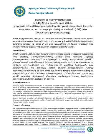 Agencja Oceny Technologii Medycznych Rada Przejrzystości Stanowisko Rady Przejrzystości nr 145/2013 z dnia 29 lipca 2013 r. w sprawie zakwalifikowania świadczenia opieki zdrowotnej: leczenie raka stercza brachyterapią o niskiej mocy dawki (LDR) jako świadczenia gwarantowanego Rada Przejrzystości uważa za zasadne zakwalifikowanie świadczenia opieki leczenie raka stercza brachyterapią o niskiej mocy dawki (LDR) jako świadczenia gwarantowanego na okres 2 lat, pod warunkiem, że koszty realizacji tego świadczenia nie przekroczą łącznych kosztów teleradioterapii. Uzasadnienie Brachyterapia LDR stanowi kolejna opcję terapeutyczną w leczeniu wczesnego raka prostaty. Słabej/umiarkowanej jakości dane naukowe sugerują porównywalną skuteczność brachyterapii o niskiej mocy dawki (LDR) i alternatywnych metod leczenia interwencyjnego raka stercza, w odniesieniu do zarówno przeżywalności jak i dodatkowych punktów końcowych, przy porównywalnej lub mniejszej liczbie działań niepożądanych. Analizy ekonomiczne wskazują, że LDR może być finalnie terapią nieznacznie tańszą od najważniejszych metod leczenia interwencyjnego. Ze względu na ograniczoną jakość aktualnie dostępnych dowodów naukowych istnieje konieczność ponownej weryfikacji dostępnych danych. Przedmiot wniosku Niniejszy raport opracowano w związku ze zleceniem Ministra Zdrowia przygotowania rekomendacji Prezesa AOTM w sprawie zakwalifikowania świadczenia opieki zdrowotnej „Leczenie raka stercza brachyterapią o niskiej mocy dawki (LDR)” jako świadczenia gwarantowanego w zakresie leczenia szpitalnego, na podstawie art. 31c Ustawy o świadczeniach. Identyfikacja ocenianego świadczenia miałaby następować poprzez nowy kod ICD9 PL: 92.418 Brachyterapia środtkankowa standardowa (LDR – 125I, 103Pd) oraz rozpoznanie wg ICD-10: C61 Nowotwór złośliwy gruczołu krokowego. Zgodnie z przyjętą procedurą właściwą dla zlecenia z art. 31c ustawy o świadczeniach przygotowano raport skrócony, zawierający uproszczone analizy efektywności klinicznej i wpływu na budżet, bez modelowania efektywności kosztów terapii. Problem zdrowotny Rak gruczołu krokowego (rak stercza; RGK) jest nowotworem złośliwym, wywodzącym się z obwodowej strefy gruczołu krokowego. W początkowym stadium choroby, które może trwać wiele lat, nowotwór jest ograniczony do narządu i niemy klinicznie. U niektórych chorych występują dolegliwości ze strony dolnych dróg moczowych, będące raczej następstwem współistnienia łagodnego rozrostu stercza – takie jak częstomocz, nykturia, naglące parcie, pieczenie w czasie mikcji, uczucie niepełnego wypróżnienia, wąski strumień moczu. Niekiedy pierwszym objawem raka uogólnionego są bóle kostne wywołane przez przerzuty. Wyboru sposobu postępowania dokonuje się między innymi w oparciu o klasyfikację chorych do określonych grup ryzyka progresji po leczeniu, w której bierze się pod uwagę stężenie PSA, stopień złośliwości raka (suma Gleasona; Gl.s.) i stopień zaawansowania klinicznego (TNM). W badaniu EUROCARE-4 odsetek przeżyć 5-letnich u chorych na RGK Agencja Oceny Technologii Medycznych ul. I. Krasickiego 26, 02-611 Warszawa, tel. +48 22 56 67 200 fax +48 22 56 67 202 e-mail: [email protected] www.aotm.gov.pl Stanowisko Rady Przejrzystości AOTM nr 145/2013 z dnia 29 lipca 2013 r. rozpoznanego w latach 1995–1999 wyniósł w Polsce 60,5%, a średnia w krajach europejskich miała wartość 76,4%. Oceniane świadczenie Brachyterapia o niskiej mocy dawki (LDR-BT; low dose rate brachytherapy; permanent interstitial brachytherapy; permanent seed implantation) polega na implantacji źródeł promieniowania radioaktywnego bezpośrednio do gruczołu krokowego. Brachyterapia jest metodą radioterapii nowotworów, w której wykorzystuje się energię fotonów lub cząstek pochodzącą z rozpadu izotopów promieniotwórczych umieszczanych w guzie lub w jego bezpośrednim sąsiedztwie. Może być stosowana jako leczenie radykalne (w monoterapii), jako element leczenia radykalnego (w skojarzeniu z chirurgią i/lub teleradioterapią), jako samodzielne leczenie paliatywne – lub w skojarzeniu oraz jako brachyterapia ratunkowa. Oceniana technologia jest metodą brachyterapii, ze względu na sposób stosowania - śródtkankową (śródmiąższową), ze względu na czas pozostawania źródła w leczonym obszarze - stałą (permanentną – źródła nie są usuwane po umieszczeniu w gruczole) oraz, ze względu na moc dawki stosowanego źródła – brachyterapią o niskiej mocy dawki. Stosowane w brachyterapii izotopy promieniotwórcze charakteryzują się unikalnymi wartościami emitowanej energii i czasu połowicznego rozpadu, które determinują ich aplikację w jednej z dwóch rodzajów brachyterapii stosowanej w RGK – stałej (oceniana technologią) lub czasowej (jedna z technologii alternatywnych). Wyższa energia izotopu wiąże się z głębszą penetracją dawki w docelowej tkance, w związku z czym można zastosować pojedyncze źródło o wysokiej mocy dawki, natomiast przy zastosowaniu źródeł o niskiej mocy dawki (stosowanych w LDR-BT) zasięg penetracji jest ograniczony, co ma umożliwiać precyzyjne podanie zaplanowanej dawki wewnątrz gruczołu krokowego z jednoczesną efektywną ochroną otaczających tkanek. Izotopy LDR-BT muszą być umieszczane ze szczególną uwagą, aby nie dopuścić do pozostawienia przestrzeni nieobjętych dawką leczącą. W technice LDR-BT bardzo wysoka dawka (120-160 Gy) promieniowania jest dostarczana do tkanki docelowej poprzez kumulację w dłuższym czasie. Izotopy o niskiej mocy dawki, obecnie stosowane w LDR-BT to: jod-125 (125I), pallad-103 (103Pd) i cez-131 (131Cs). Najdłużej stosowanym izotopem jest 125I, 103Pd jest stosowany od 1986, a cez – od 2004 roku. Oceniane świadczenie obejmuje zastosowanie izotopów 125I lub 103Pd (bez izotopu cezu). Implantowane ziarna są niewielkie (standard