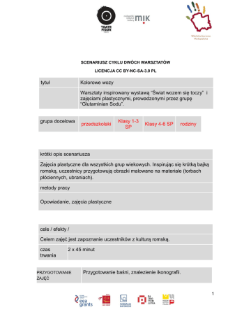 SCENARIUSZ CYKLU DWÓCH WARSZTATÓW LICENCJA CC BY-NC-SA-3.0 PL tytuł Kolorowe wozy Warsztaty inspirowany wystawą “Świat wozem się toczy” i zajęciami plastycznymi, prowadzonymi przez grupę “Glutaminian Sodu”. grupa docelowa przedszkolaki Klasy 1-3 SP Klasy 4-6 SP rodziny krótki opis scenariusza Zajęcia plastyczne dla wszystkich grup wiekowych. Inspirując się krótką bajką romską, uczestnicy przygotowują obrazki malowane na materiale (torbach płóciennych, ubraniach). metody pracy Opowiadanie, zajęcia plastyczne cele / efekty / Celem zajęć jest zapoznanie uczestników z kulturą romską. czas trwania 2 x 45 minut PRZYGOTOWANIE ZAJĘĆ Przygotowanie baśni, znalezienie ikonografii. 1 środki dydaktyczne Materiały do malowania: torby, płótna, jasne ubrania, farby przebieg działania z opisem 1. Opowiedz uczestnikom romską baśń o stworzeniu świata. Na zakończenie dodaj informację, że lud romski wieki temu rozjechał się po świecie i do dzisiaj podróżuje i muzykuje. 2. Poproś uczestników o namalowanie na materiale wybranego motywu z baśni. 3. Technikę i sposób malowania należy dostosować do wieku i umiejętności uczestników zajęć. Jeżeli pracujesz z młodszymi dziećmi, to rozdaj im przygotowane szablony – wóz, skrzypce, koło, smoki. Jeżeli ze starszymi, to inspiracją może być malarstwo Małgorztay Mirgi Tas. II wersja warsztatów lub kolejne zajęcia: Uczestnicy malują na szkle. Wówczas można im podłożyć pod szybki wybrane obrazy z katalogu wystawy Jah Digh malarzy romskich. W ten sposób mogą odrysować kontury, kalkować zdarzenia lub inspirować się obrazem pod szybką, ale spróbować eksperymentować z kolorem czy techniką nakładania farby. 2