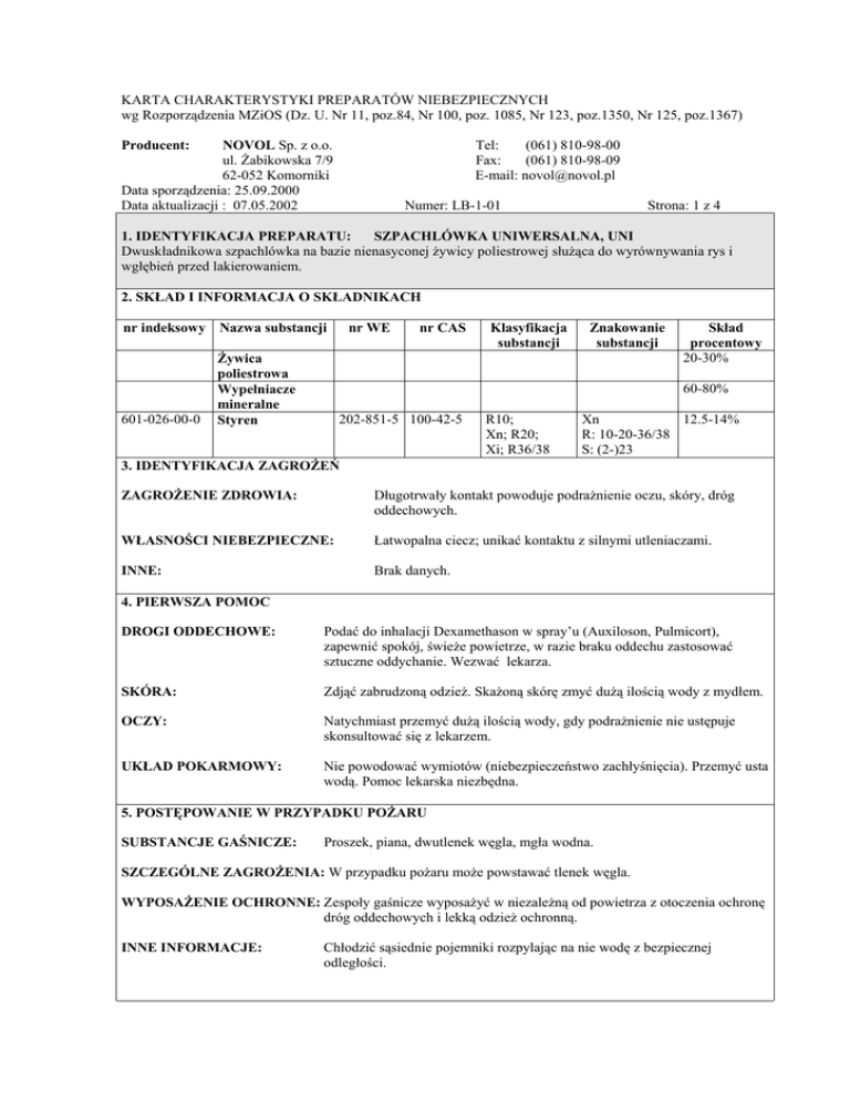 KARTA CHARAKTERYSTYKI PREPARATÓW NIEBEZPIECZNYCH wg Rozporządzenia MZiOS (Dz. U. Nr 11, poz.84, Nr 100, poz. 1085, Nr 123, poz.1350, Nr 125, poz.1367) Producent: NOVOL Sp. z o.o. ul. Żabikowska 7/9 62-052 Komorniki Data sporządzenia: 25.09.2000 Data aktualizacji : 07.05.2002 Tel: (061) 810-98-00 Fax: (061) 810-98-09 E-mail: [email protected] Numer: LB-1-01 Strona: 1 z 4 1. IDENTYFIKACJA PREPARATU: SZPACHLÓWKA UNIWERSALNA, UNI Dwuskładnikowa szpachlówka na bazie nienasyconej żywicy poliestrowej służąca do wyrównywania rys i wgłębień przed lakierowaniem. 2. SKŁAD I INFORMACJA O SKŁADNIKACH nr indeksowy Nazwa substancji 601-026-00-0 Żywica poliestrowa Wypełniacze mineralne Styren nr WE nr CAS Klasyfikacja substancji Znakowanie substancji Skład procentowy 20-30% 60-80% 202-851-5 100-42-5 R10; Xn; R20; Xi; R36/38 Xn 12.5-14% R: 10-20-36/38 S: (2-)23 3. IDENTYFIKACJA ZAGROŻEŃ ZAGROŻENIE ZDROWIA: Długotrwały kontakt powoduje podrażnienie oczu, skóry, dróg oddechowych. WŁASNOŚCI NIEBEZPIECZNE: Łatwopalna ciecz; unikać kontaktu z silnymi utleniaczami. INNE: Brak danych. 4. PIERWSZA POMOC DROGI ODDECHOWE: Podać do inhalacji Dexamethason w spray’u (Auxiloson, Pulmicort), zapewnić spokój, świeże powietrze, w razie braku oddechu zastosować sztuczne oddychanie. Wezwać lekarza. SKÓRA: Zdjąć zabrudzoną odzież. Skażoną skórę zmyć dużą ilością wody z mydłem. OCZY: Natychmiast przemyć dużą ilością wody, gdy podrażnienie nie ustępuje skonsultować się z lekarzem. UKŁAD POKARMOWY: Nie powodować wymiotów (niebezpieczeństwo zachłyśnięcia). Przemyć usta wodą. Pomoc lekarska niezbędna. 5. POSTĘPOWANIE W PRZYPADKU POŻARU SUBSTANCJE GAŚNICZE: Proszek, piana, dwutlenek węgla, mgła wodna. SZCZEGÓLNE ZAGROŻENIA: W przypadku pożaru może powstawać tlenek węgla. WYPOSAŻENIE OCHRONNE: Zespoły gaśnicze wyposażyć w niezależną od powietrza z otoczenia ochronę dróg oddechowych i lekką odzież ochronną. INNE INFORMACJE: Chłodzić sąsiednie pojemniki rozpylając na nie wodę z bezpiecznej odległości. KARTA CHARAKTERYSTYKI PREPARATÓW NIEBEZPIECZNYCH wg Rozporządzenia MZiOS (Dz. U. Nr 11, poz.84, Nr 100, poz. 1085, Nr 123, poz.1350, Nr 125, poz.1367) SZPACHLÓWKA UNIWERSALNA, UNI Data sporządzenia: 25.09.2000 Data aktualizacji : 07.05.2002 Numer: LB-1-01 Strona: 2 z 4 6. POSTĘPOWANIE W PRZYPADKU UWOLNIENIA DO ŚRODOWISKA OCHRONA OSOBISTA: Środki ochrony osobistej: rękawice ochronne, okulary ochronne, butelka z czystą wodą do przemywania oczu. POSTĘPOWANIE PRZY WYCIEKU LUB WYSYPIE SUBSTANCJI: Uszczelnić opakowanie, uszkodzone opakowania umieścić w opakowaniu awaryjnym, przy dużych wyciekach teren obwałować, zebrać i zniszczyć substancję w odpowiedniej spalarni lub usunąć jako odpad specjalny. Usunąć źródła zapłonu, unikać bezpośredniego kontaktu z uwalniającą się substancją. 7. POSTĘPOWANIE Z PREPARATEM I ICH MAGAZYNOWANIE ZASADY POSŁUGIWANIA SIĘ: Trzymać z dala od ciepła i źródeł ognia. Nie palić papierosów. Nie wdychać par. Unikać kontaktu ze skórą i oczami. Przedsięwziąć środki bezpieczeństwa przeciw wyładowaniom elektrostatycznym. MAGAZYNOWANIE: Przechowywać w szczelnie zamkniętych pojemnikach, w chłodnych, dobrze wentylowanych pomieszczeniach. Zakaz składowania w pobliżu dużej ilości nadtlenków organicznych oraz innych silnych utleniaczy. SPECYFICZNE ZASTOSOWANIE: Patrz karta techniczna LT-1-01. 8. KONTROLA NARAŻENIA I ŚRODKI OCHRONY INDYWIDUALNEJ WARTOŚCI GRANICZNE: Zgodnie z DU nr 79 z 17 czerwca 1998 r. poz. 513 NDSCh (mg/m3) NDSP (mg/m3) NUMER CAS SUBSTANCJA NDS (mg/m3) 100-42-5 Styren 50 200 --OCHRONA DRÓG ODDECHOWYCH: Maska przeciwgazowa z pochłaniaczem typu A. OCHRONA RĄK: Rękawice ochronne do rozpuszczalników. OCHRONA OCZU: Okulary ochronne OCHRONA SKÓRY: Odpowiednia odzież ochronna 9. WŁASNOŚCI FIZYKOCHEMICZNE Stan fizyczny: Kolor: Zapach: pH: Temperatura wrzenia: Temperatura topnienia: Temperatura rozkładu: Temperatura zapłonu: Temperatura samozapłonu: Granice wybuchowości: Właściwości wybuchowe: Prężność par: Gęstość: Rozpuszczalność w wodzie: Współczynnik podziału n-oktanok/woda: Lepkość (reometr rotacyjny): wysoko lepka ciecz beżowy typowy styrenu -146°C -30°C -32°C 490°C % dolna: 1.1 vol% górna: 8.0 vol% -7.3 hPa ok. 1.9 g/cm3 (20°C) bardzo słaba -20000 - 50000 mPas KARTA CHARAKTERYSTYKI PREPARATÓW NIEBEZPIECZNYCH wg Rozporządzenia MZiOS (Dz. U. Nr 11, poz.84, Nr 100, poz. 1085, Nr 123, poz.1350, Nr 125, poz.1367) SZPACHLÓWKA UNIWERSALNA, UNI Data sporządzenia: 25.09.2000 Data aktualizacji : 07.05.2002 Numer: LB-1-01 Strona: 3 z 4 10. STABILNOŚĆ I REAKTYWNOŚĆ STABILNOŚĆ: Produkt stabilny w warunkach normalnych. UNIKAĆ KONTAKTU MATERIAŁU Z: Środkami silnie utleniającymi, wysoką temperaturą NIEBEZPIECZNE PRODUKTY ROZKŁADU: W wyniku rozkładu termicznego powstaje tlenek węgla i inne toksyczne gazy. 11. INFORMACJE TOKSYKOLOGICZNE TOKSYCZNOŚĆ: LD50 (szczur doustnie) LCL0 (człowiek inhalacja) DZIAŁANIA DRAŻNIĄCE: Na skórę: drażni skórę i śluzówkę Na oczy: działa drażniąco OBJAWY ZATRUCIA: Bóle i zawroty głowy, zmęczenie, osłabienie mięśni, senność i w wyjątkowych przypadkach utrata przytomności. Połknięcie może spowodować podrażnienie przewodu pokarmowego, nudności, wymioty i biegunki. 5000 mg/kg 10000 ppm/0.5 godz. 12. INFORMACJE EKOLOGICZNE Preparat o bardzo słabej rozpuszczalności w wodzie. Trzymać z dala od kanalizacji, wód powierzchniowych, gruntowych oraz gleby. 13. POSTĘPOWANIE Z ODPADAMI ZALECENIA: Substancję należy usuwać z uwzględnieniem odpowiednich, miejscowych i urzędowych, przepisów. METODY UNIESZKODLIWIANIA: Kontrolowane spalanie. 14. INFORMACJE O TRANSPORCIE Nr UN Nazwa surowca Nr rozpoznawczy zagrożenia Wymagana nalepka ostrzegawcza Grupa pakowania 1866 Żywica w roztworze, zapalna 30 3 III ADR/RID: UN 1866 żywica w roztworze, zapalna, klas