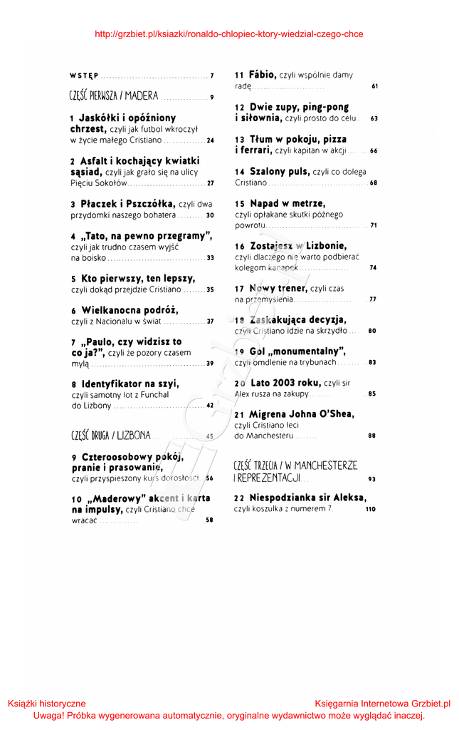 http://grzbiet.pl/ksiazki/ronaldo-chlopiec-ktory-wiedzial-czego-chce WSTĘP. .7 CZ(ŚĆ riERWSZA l MADERA . 11 Fibio, czyli wspólnie dam'/ radę 61 1 2 Dwie zupy, ping-pong i siłownia, czyli prosto do celu 63 9 1 Jaskółki i opóźniony chrzest, czyli jak futbol wkroczył . .. 24 w życie małego Cristiano . 1 3 Tłum w pokoju, pizza i ferrari, czyli kapitan w akcji 66 2 Asfalt i kochający kwiatki sąsiad, czyli jak grało się na ulicy . 21 Pięciu Sokołów.. i Pszczółka, czyli dwa 30 przydomki naszego bohatera 3 Płaczek 4 "Tato, na pewno przegramy", czyli jak trudno czasem wyjść na boisko ........................... ..... 33 5 Kto pierwszy, ten lepszy, .... 35 czyli dokąd przejdzie Cristiano 6 Wielkanocna podróż, czyli z Naciona lu w świat .............. 37 7 "Paulo, czy widzisz to co ja?", czyli że pozory czasem . ................. .. 39 mylą. 8 Identyfikator na szyi, czyli samotny lot z Funchal do Lizbony .... CZ[ŚĆ DRUGA l LIZBONA . 45 dorosłosci 68 15 Napad w metrze, czyli opłakane skutki późnego powrotu .. 71 1 6 Zostajesz w Lizbonie, czyli dlaczego nie warto podbierać kolegom kanapek .. 74 17 na Nowy trener, czyli czas przemyślenia. 77 1 8 Zaskakująca decyzja, czyli Cristiano idzie na skrzydło . BO 1 9 Gol "monumentalny", czyli omdlenie na trybunach 83 2 o Lato 2003 roku, czyli sir Alex rusza na zakupy 85 21 Migrena Johna czyli Cristiano leci do Manchesteru O'Shea, 88 CZ[ŚĆ TRZECIA l WMANCHESTERZE 56 "Maderowy" akcent i karta na impulsy, czyl1 Cristiano chce 1o wracać puls, czyli co dolega 42 9 Czteroosobowy pokój, pranie i prasowanie, czyli przyspieszony kurs 14 Szalony Cristiano. l REPREZENTACJI 93 2 2 Niespodzianka sir Aleksa, 110 czyli koszulka z numerem 7 58 Książki historyczne Księgarnia Internetowa Grzbiet.pl Uwaga! Próbka wygenerowana automatycznie, oryginalne wydawnictwo może wyglądać inaczej. http://grzbiet.pl/ksiazki/ronaldo-chlopiec-ktory-wiedzial-czego-chce 2 3 Mesjasz na Ol d Trafford, czyli l1t:biut wart szampana. . 112 3 6 Deszczowe karne, czyli trzeba zawsze wierzyr~ do korKa......... . 151 Obiady mamy i żarty w szatni, czyli witaj, stabilizacjo' CZlŚĆ CZWARTA l REAL MADRYT ......... 167 24 115 2s Manchester United kontra Arsenal, czyli bitwa na Old Trafford Lipcowy wieczór, czyli coś 37 szykuje 2 6 Puchar w górę, czyli sep1 dobiega końca.... .........•..... ·, •. 122 2 7 Euro 2004, czyli część pierWSza greckiego dramatu ................ 1M w Madrycie ................ 168 3 8 i Hala Madrid!, czyli Bernabeu szaleje ............... ........... 111 3 9 Galaktyczni, czyli kilka słów o Realu Madryt ............... 173 4o 2 8 Wielki finał, czyli część druga g,.eckiego dramatu.. 121 Madryt kontra Madryt, czyli witamy w Lizbonie ................ 176 41 2 9 Moskiewska wiadomość, c.:yli są sprawy ważniejsze ni: futbol . .. . . . .. .. .. . . Podstawowy czas gry, czyli wojna nerwów .................. ... 179 130 3 O 62. minuta, czyli słabe nerwy Wayne·a Rooneya .. . . . . . .. . .. .. .. . 133 31 Dziesięciu kontra jedenastu, czyli karne. które wstrząsną Anglią się ............... 118 4 z 120. minuta meczu, czyli marzenia się spełniają ........... 182 4 3 Mały i duży Superman, czyli co znaczy mieć szczęście w życiu ......... 185 ............ 136 E P l L O G .................. ................ 202 3 2 Anglia szuka winnego, czyli Cristiano rzucony na pożarcie Bibliografia, .139 3 3 Wróg publiczny numer 1, czyli Jak hartował się Cristiano ...... 143 czyli skąd to wszystko wiem ........ 206 Podziękowania, czyli jak wiele zawdzięczam innym ...... 207 wykorzystać bezczynność, czyli trochę nauki ni~ zaszkodzi ............ 146 34 Jak 35 Moskwa 2008, czyli rosyjski .... ' ... ' 148 Książki historyczne Księgarnia Internetowa Grzbiet.pl Uwaga! Próbka wygenerowana automatycznie, oryginalne wydawnictwo może wyglądać inaczej.
