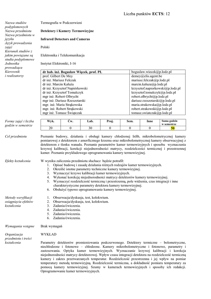 Liczba punktów ECTS: 12 Nazwa studiów podyplomowych Nazwa przedmiotu Nazwa przedmiotu w języku Język prowadzenia zajęć Kierunek studiów z jakim powiązane są studia podyplomowe Jednostka prowadząca Kierownik i realizatorzy Formy zajęć i liczba godzin w semestrze Termografia w Podczerwieni Detektory i Kamery Termowizyjne Infrared Detectors and Cameras Polski Elektronika i Telekomunikacja Instytut Elektroniki, I-16 [email protected] [email protected] [email protected] [email protected] [email protected] [email protected] [email protected] [email protected] [email protected] [email protected] [email protected] dr hab. inŜ. Bogusław Więcek, prof. PŁ prof. Gilbert De Mey dr inŜ. Mariusz Felczak dr inŜ. Marcin KałuŜa dr inŜ. Krzysztof Napiórkowski dr inŜ. Krzysztof Tomalczyk mgr inŜ. Robert Olbrycht mgr inŜ. Dariusz Rzeszotarski mgr. inŜ. Maria Strąkowska mgr. inŜ. Robert Strąkowski mgr inŜ. Tomasz Świątczak Wyk. Ćw. Lab. Proj. Sem. Inne 20 0 30 0 0 0 Suma godzin w semestrze 50 Cel przedmiotu Poznanie budowy, działania i obsługi kamery chłodzonej InSb, mikrobolometrycznej kamery pomiarowej z detektorem z amorficznego krzemu oraz mikrobolometrycznej kamery obserwacyjnej z detektorem z tlenku wanadu. Poznanie parametrów kamer termowizyjnych i sposobu wyznaczania krzywej kalibracji, korekcji niejednorodności matrycy, rozdzielczości termicznej i przestrzennej kamer. Poznanie przykładowego oprogramowania kamery termowizyjnej. Efekty kształcenia W wyniku zaliczenia przedmiotu słuchacz będzie potrafił: 1. Opisać budowę i zasadę działania róŜnych rodzajów kamer termowizyjnych. 2. Określić istotne parametry techniczne kamery termowizyjnej. 3. Wyznaczyć krzywe kalibracji kamer termowizyjnych. 4. Wykonać korekcję niejednorodności matrycy detektorów kamery termowizyjnej. 5. Wyznaczyć rozdzielczość termiczną i przestrzenną, pole widzenia, czas integracji i inne charakterystyczne parametry detektora kamery termowizyjnej. 6. ObsłuŜyć typowe oprogramowanie kamery termowizyjnej. Metody weryfikacji osiągnięcia efektów kształcenia 1. 2. 3. 4. 5. 6. Obserwacja/dyskusja, test, kolokwium. Obserwacja/dyskusja, test, kolokwium. Zadania/ćwiczenia. Zadania/ćwiczenia. Zadania/ćwiczenia. Zadania/ćwiczenia. Wymagania wstępne Brak wymagań Organizacja przedmiotu i treści kształcenia WYKŁAD Parametry detektorów promieniowania podczerwonego. Detektory termiczne – bolometryczne, niechłodzone i fotonowe – chłodzone. Kamery mikrobolometryczne i fotonowe, parametry i zastosowania. Optyka kamer termowizyjnych. Wyznaczanie krzywej kalibracji i korekcja niejednorodności matrycy detektorowej. Wpływ czasu integracji detektora na rozdzielczość termiczną kamery i zakres przetwarzanych temperatur. Rozdzielczość przestrzenna i jej wpływ na pomiar temperatury metodą termowizyjną. Rozdzielczość termiczna, a dokładność pomiaru temperatury za pomocą kamery termowizyjnej. Szumy w kamerach termowizyjnych i sposoby ich redukcji. Oprogramowanie kamer termowizyjnych. LABORATORIUM Wyznaczanie krzywej kalibracji kamery mikrobolometrycznej. Wyznaczanie krzywej kalibracji kamery fotonowej. Korekcja niejednorodności matrycy detektorowej kamery fotonowej. Korekcja niejednorodności matrycy detektorowej kamery mikrobolometrycznej. Wyznaczanie rozdzielczości przestrzennej i pola widzenia kamer termowizyjnych. Wyznaczanie czasu integracji detektorów w kamerze fotonowej i mikrobolometrycznej. Forma zaliczenia Ocena końcowa jest wystawiana na podstawie ocen za aktywność przy dyskusji podczas zajęć, końcowego testu/kolokwium i sprawozdań z praktycznych zadań/ćwiczeń laboratoryjnych. Literatura podstawowa 1. 2. 3. 4. 5. 6. Literatura uzupełniająca Przeciętne obciąŜenie słuchacza pracą własną Hackforth H. L.: „Promieniowanie podczerwone”. PWN, Warszawa 1963 Burakowski T., Giziński J., Sala A.: „Podczerwień i jej zastosowanie”. Wyd. MON, Warszawa 1963 Bielecki Z., Rogalski A.: „Detekcja sygnałów optycznych”. WNT 2001 Minkina W.: „Pomiary termowizyjne – przyrządy i metody”. Wyd. Politechniki Częstochowskiej, Częstochowa 2004 Konferencja Krajowa Termografia i Termometria w Podczerwieni. Materiały konferencyjne z lat 2002-2011 Quantitative Infrared Thermography. Materiały konferencyjne z lat 2006-2011 Do wyboru i zaprezentowania przez prowadzącego. 250 Całkowite obciąŜenie słuchacza pracą Praca własna słuchacza obejmuje: - analizę szerokiego zakresu literatury uzupełniającej – 60 godzin, - analizę innych źródeł, w szczególności aktualizację wiedzy w oparciu o najnowsze publikacje naukowe z dziedziny termografii, termometrii i innych technik obrazowania w podczerwieni – 60 godzin, - w uzupełnieniu zajęć praktycznych samodzielne wykonanie szeregu róŜnorodnych pomiarów termowizyjnych – 30 godzin, - szczegółowa analizę wyników wykonanych pomiarów i ich interpretację w odniesieniu do treści specyficznych dla danego przedmiotu – 60 godzin, - przygotowanie raportów i sprawozdań z pracy własnej – 40 godzin. Uwagi Brak. Aktualizacja 2012.01.20 dr hab. inŜ. Bogusław Więcek, prof. PŁ Łódź dnia………………….. 300 ……………………………………………. Podpis, tytuł lub stopień naukowy Kierownika studiów podyplomowych oraz pieczątka Katedry lub Instytutu dr hab. inŜ. Bogusław Więcek, prof. PŁ ……………………………………………… Podpis, tytuł lub stopień naukowy Kierownika przedmiotu oraz pieczątka Katedry lub Instytutu (jednostki prowadzącej studia podyplomowe)