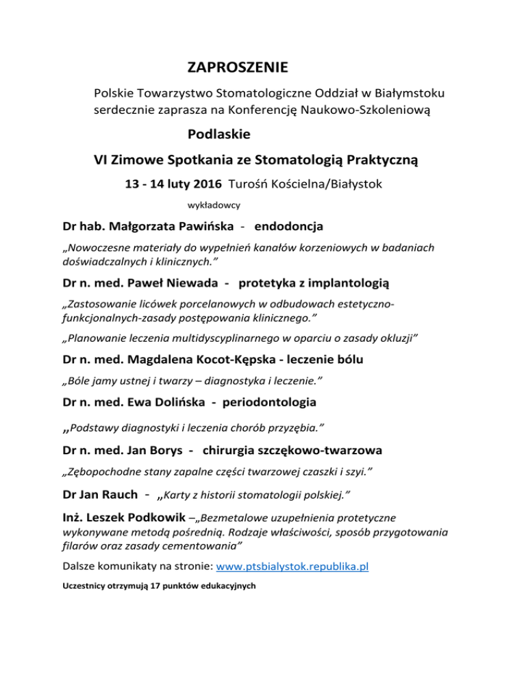 ZAPROSZENIE Polskie Towarzystwo Stomatologiczne Oddział w Białymstoku serdecznie zaprasza na Konferencję Naukowo-Szkoleniową Podlaskie VI Zimowe Spotkania ze Stomatologią Praktyczną 13 - 14 luty 2016 Turośń Kościelna/Białystok wykładowcy Dr hab. Małgorzata Pawińska - endodoncja „Nowoczesne materiały do wypełnień kanałów korzeniowych w badaniach doświadczalnych i klinicznych.” Dr n. med. Paweł Niewada - protetyka z implantologią „Zastosowanie licówek porcelanowych w odbudowach estetycznofunkcjonalnych-zasady postępowania klinicznego.” „Planowanie leczenia multidyscyplinarnego w oparciu o zasady okluzji” Dr n. med. Magdalena Kocot-Kępska - leczenie bólu „Bóle jamy ustnej i twarzy – diagnostyka i leczenie.” Dr n. med. Ewa Dolińska - periodontologia „Podstawy diagnostyki i leczenia chorób przyzębia.” Dr n. med. Jan Borys - chirurgia szczękowo-twarzowa „Zębopochodne stany zapalne części twarzowej czaszki i szyi.” Dr Jan Rauch - „Karty z historii stomatologii polskiej.” Inż. Leszek Podkowik –„Bezmetalowe uzupełnienia protetyczne wykonywane metodą pośrednią. Rodzaje właściwości, sposób przygotowania filarów oraz zasady cementowania” Dalsze komunikaty na stronie: www.ptsbialystok.republika.pl Uczestnicy otrzymują 17 punktów edukacyjnych Koszty uczestnictwa: Do 1 stycznia 2016 roku: Członek PTS Białystok - 250,Osoba niezrzeszona -350,- Emeryci i studenci -100,- Od 2 stycznia do 5 lutego 2016 roku Członek PTS Białystok - 300,Osoba niezrzeszona - 400,- Jeden dzień wykładowy - 200,Kolacja uroczysta z muzyką na żywo ( ilość miejsc ograniczona ) - 150,Nocleg w ośrodku konferencyjnym ze śniadaniem- 100,-/os w pokoju 2 os. (ilość miejsc ograniczona) Szczegółowe informacje na stronie www.ptsbialystok.republika.pl Zgłoszenia na powyższy adres : dr Ewa Stokowska [email protected] , tel. 608671055 Streszczenia (w języku polskim) prezentacji ustnych (max. 10 minut) w sesji młodych naukowców (14 luty godz. od 15.00 do 18.00) do 1 lutego 2016 roku na adres: [email protected]