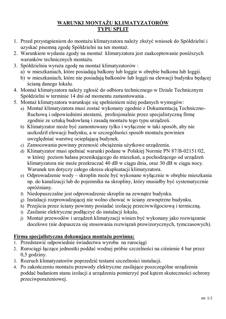 WARUNKI MONTAŻU KLIMATYZATORÓW TYPU SPLIT 1. Przed przystąpieniem do montażu klimatyzatora należy złożyć wniosek do Spółdzielni i uzyskać pisemną zgodę Spółdzielni na ten montaż. 2. Warunkiem wydania zgody na montaż klimatyzatora jest zaakceptowanie poniższych warunków technicznych montażu. 3. Spółdzielnia wyraża zgodę na montaż klimatyzatorów : a) w mieszkaniach, które posiadają balkony lub loggie w obrębie balkonu lub loggii. b) w mieszkaniach, które nie posiadają balkonów lub loggii na elewacji budynku będącej ścianą danego lokalu. 4. Montaż klimatyzatora należy zgłosić do odbioru technicznego w Dziale Technicznym Spółdzielni w terminie 14 dni od momentu zamontowania . 5. Montaż klimatyzatora warunkuje się spełnieniem niżej podanych wymogów: a) Montaż klimatyzatora musi zostać wykonany zgodnie z Dokumentacją TechnicznoRuchową i odpowiednimi atestami, profesjonalnie przez specjalistyczną firmę zgodnie ze sztuką budowlaną i zasadą montażu tego typu urządzeń. b) Klimatyzator może być zamontowany tylko i wyłącznie w taki sposób, aby nie uszkodził elewacji budynku, a w szczególności sposób montażu powinien uwzględniać warstwę ocieplającą budynek. c) Zamocowania powinny przenosić obciążenia użytkowe urządzenia. d) Klimatyzator musi spełniać warunki podane w Polskiej Normie PN 87/B-02151/02, w której poziom hałasu przenikającego do mieszkań, a pochodzącego od urządzeń klimatyzatora nie może przekraczać 40 dB w ciągu dnia, oraz 30 dB w ciągu nocy. Warunek ten dotyczy całego okresu eksploatacji klimatyzatora. e) Odprowadzenie wody – skroplin może być wykonane wyłącznie w obrębie mieszkania np. do kanalizacji lub do pojemnika na skropliny, który musiałby być systematycznie opróżniany. f) Niedopuszczalne jest odprowadzenie skroplin na zewnątrz budynku. g) Instalacji rozprowadzającej nie wolno chować w ściany zewnętrzne budynku. h) Przejścia przez ściany powinny posiadać izolację przeciwwilgociową i termiczną. i) Zasilanie elektryczne podłączyć do instalacji lokalu, j) Montaż przewodów i urządzeń klimatyzacji winien być wykonany jako rozwiązanie docelowe (nie dopuszcza się stosowania rozwiązań prowizorycznych, tymczasowych). Firma specjalistyczna dokonująca montażu powinna: 1. Przedstawić odpowiednie świadectwa wyrobu na rurociągi 2. Rurociągi łączące jednostki poddać wodnej próbie szczelności na ciśnienie 4 bar przez 0,5 godziny. 3. Rozruch klimatyzatorów poprzedzić testami szczelności instalacji. 4. Po zakończeniu montażu przewody elektryczne zasilające poszczególne urządzenia poddać badaniom stanu izolacji a urządzenia pomierzyć pod kątem skuteczności ochrony przeciwporażeniowej. str. 1/2 Spółdzielnia zastrzega sobie prawo do cofnięcia zgody na montaż klimatyzatora w przypadku gdy: 1. dysponent lokalu nie zgłosi montażu klimatyzatora do odbioru montażu klimatyzatora do Działu Technicznego, 2. zamontowany klimatyzator lub sposób jego montażu nie będzie spełniał warunków technicznych, 3. uzasadnionych przypadkach pomimo uprzedniego wezwania przez Spółdzielnię dysponent lokalu nie dokona demontażu zewnętrznej części klimatyzatora, 4. zamontowany klimatyzator będzie powodem naruszenia zasad współżycia społecznego mieszkańców. Wszelkiego rodzaju szkody wynikłe z awarii, pracy oraz sposobu montażu klimatyzatora obciążają bezpośrednio jego właściciela (np. zniszczenie struktury elewacji lub zabrudzenie elewacji i w związku z tym konieczna renowacja lub malowanie). Dysponent lokalu zobowiązany jest na wezwanie Spółdzielni do dokonania demontażu zewnętrznej części klimatyzacji w przypadkach uzasadnionych względami prawnymi, technicznymi lub eksploatacyjnymi. W przypadku nie dostosowania się do powyższego zobowiązania Spółdzielnia zastrzega sobie prawo do czasowego lub bezterminowego demontażu zewnętrznej części klimatyzacji na koszt dysponenta lokalu. Spółdzielnia nie ponosi odpowiedzialności za ewentualne występowanie w lokalu wilgoci, zagrzybienia lub alergii lokatorów. Spółdzielnia zaleca stosowanie Klimatyzatorów: o klasie energetycznej A ze sprężarkami INWERTEROWYMI, charakteryzującymi się małym poborem energii elektrycznej oraz niskim poziomem hałasu, o mocy chłodniczej nie większej niż 3,5 kW – co odpowiada mocy elektrycznej 1 kW, Niniejsze warunki są ważne przez 90 dni od daty ich wydania. Ostateczny termin wykonania prac wyznacza się na dzień.................................................................... Powyższe warunki przyjmuję do wiadomości i stosowania: _____________________ (data i podpis osoby uprawnionej do lokalu) ____________________________ Podpis Zatwierdzającego str. 2/2