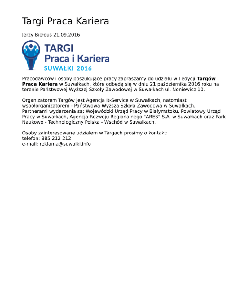 Targi Praca Kariera Jerzy Biełous 21.09.2016 Pracodawców i osoby poszukujące pracy zapraszamy do udziału w I edycji Targów Praca Kariera w Suwałkach, które odbędą się w dniu 21 października 2016 roku na terenie Państwowej Wyższej Szkoły Zawodowej w Suwałkach ul. Noniewicz 10. Organizatorem Targów jest Agencja It-Service w Suwałkach, natomiast współorganizatorem - Państwowa Wyższa Szkoła Zawodowa w Suwałkach. Partnerami wydarzenia są: Wojewódzki Urząd Pracy w Białymstoku, Powiatowy Urząd Pracy w Suwałkach, Agencja Rozwoju Regionalnego "ARES" S.A. w Suwałkach oraz Park Naukowo - Technologiczny Polska - Wschód w Suwałkach. Osoby zainteresowane udziałem w Targach prosimy o kontakt: telefon: 885 212 212 e-mail: [email protected]