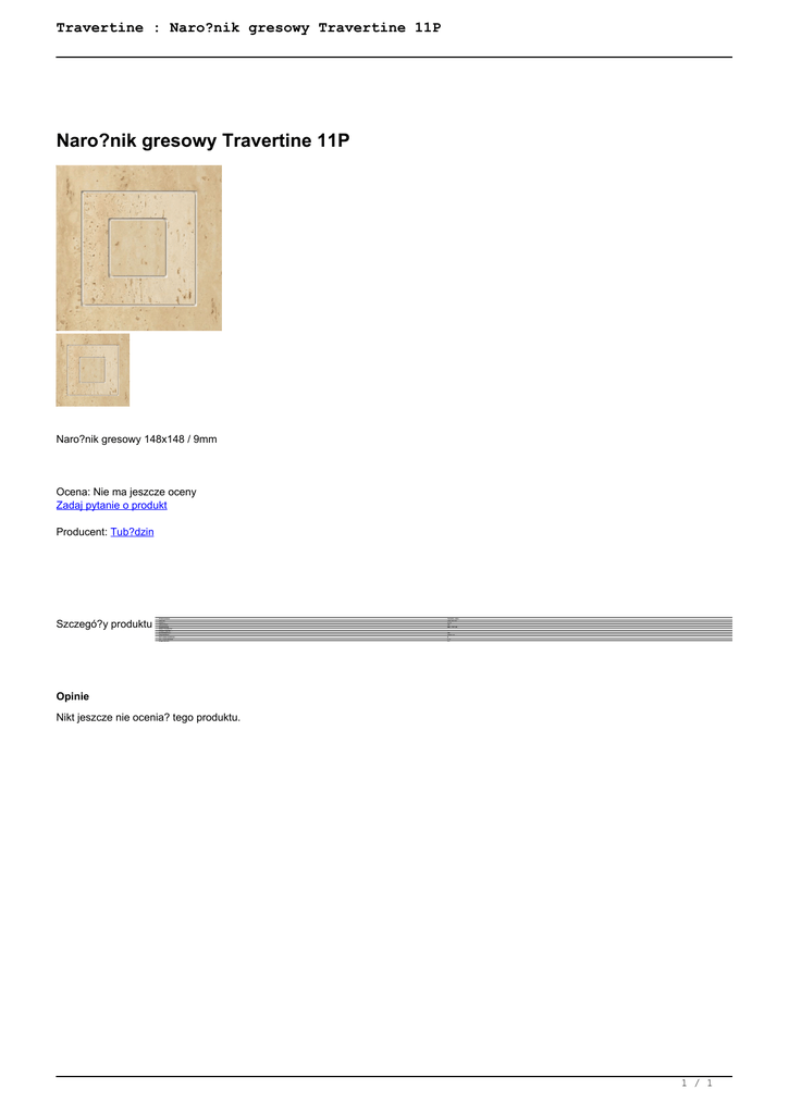 Travertine : Naro?nik gresowy Travertine 11P Naro?nik gresowy Travertine 11P Naro?nik gresowy 148x148 / 9mm Ocena: Nie ma jeszcze oceny Zadaj pytanie o produkt Producent: Tub?dzin Szczegó?y produktu Przeznaczenie Rozmiar Grubo?? Rektyfikacja Powierzchnia Klasa ?cieralno?ci Antypo?lizgowo?? Mrozoodporno?? Zastosowanie Ilo?? sztuk w kartonie Ilo?? m2 w kartonie Waga kartonu ?azienka, salon 148x148 mm 9 mm Nie Mat + Po?ysk Nie Wewn?trz 8 0.18 4.2 Opinie Nikt jeszcze nie ocenia? tego produktu. 1 / 1 Powered by TCPDF (www.tcpdf.org)