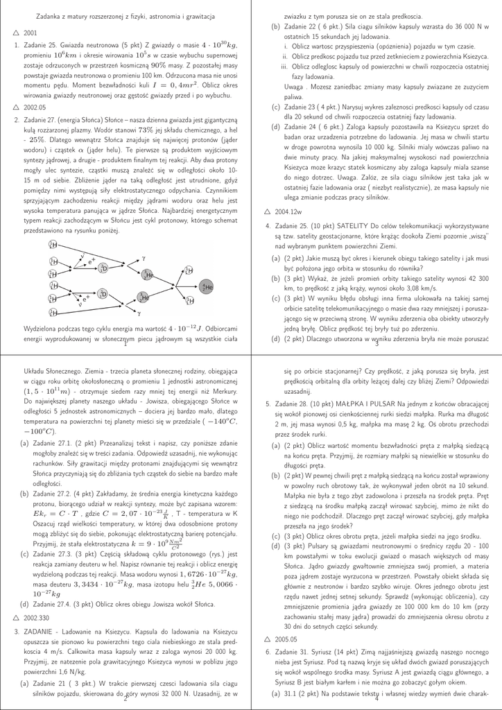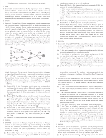 Zadanka z matury rozszerzonej z fizyki, astronomia i grawitacja △ 2001 1. Zadanie 25. Gwiazda neutronowa (5 pkt) Z gwiazdy o masie 4 · 1030 kg , promieniu 106km i okresie wirowania 105 s w czasie wybuchu supernowej zostaje odrzuconych w przestrzeń kosmiczną 90% masy. Z pozostałej masy powstaje gwiazda neutronowa o promieniu 100 km. Odrzucona masa nie unosi momentu pędu. Moment bezwładności kuli I = 0, 4mr 2. Oblicz okres wirowania gwiazdy neutronowej oraz gęstość gwiazdy przed i po wybuchu. △ 2002.05 2. Zadanie 27. (energia Słońca) Słońce – nasza dzienna gwiazda jest gigantyczną kulą rozżarzonej plazmy. Wodór stanowi 73% jej składu chemicznego, a hel - 25%. Dlatego wewnątrz Słońca znajduje się najwięcej protonów (jąder wodoru) i cząstek α (jąder helu). Te pierwsze są produktem wyjściowym syntezy jądrowej, a drugie - produktem finalnym tej reakcji. Aby dwa protony mogły ulec syntezie, cząstki muszą znaleźć się w odległości około 1015 m od siebie. Zbliżenie jąder na taką odległość jest utrudnione, gdyż pomiędzy nimi występują siły elektrostatycznego odpychania. Czynnikiem sprzyjającym zachodzeniu reakcji między jądrami wodoru oraz helu jest wysoka temperatura panująca w jądrze Słońca. Najbardziej energetycznym typem reakcji zachodzącym w Słońcu jest cykl protonowy, którego schemat przedstawiono na rysunku poniżej. Wydzielona podczas tego cyklu energia ma wartość 4 · 10−12J . Odbiorcami energii wyprodukowanej w słonecznym piecu jądrowym są wszystkie ciała 1 Układu Słonecznego. Ziemia - trzecia planeta słonecznej rodziny, obiegająca w ciągu roku orbitę okołosłoneczną o promieniu 1 jednostki astronomicznej (1, 5 · 1011 m) - otrzymuje siedem razy mniej tej energii niż Merkury. Do największej planety naszego układu - Jowisza, obiegającego Słońce w odległości 5 jednostek astronomicznych – dociera jej bardzo mało, dlatego temperatura na powierzchni tej planety mieści się w przedziale ( −140o C , −100o C ). (a) Zadanie 27.1. (2 pkt) Przeanalizuj tekst i napisz, czy poniższe zdanie mogłoby znaleźć się w treści zadania. Odpowiedź uzasadnij, nie wykonując rachunków. Siły grawitacji między protonami znajdującymi się wewnątrz Słońca przyczyniają się do zbliżania tych cząstek do siebie na bardzo małe odległości. (b) Zadanie 27.2. (4 pkt) Zakładamy, że średnia energia kinetyczna każdego protonu, biorącego udział w reakcji syntezy, może być zapisana wzorem: J , T - temperatura w K Ekr = C · T , gdzie C = 2, 07 · 10−23 K Oszacuj rząd wielkości temperatury, w której dwa odosobnione protony mogą zbliżyć się do siebie, pokonując elektrostatyczną barierę potencjału. 2 Przyjmij, że stała elektrostatyczna k = 9 · 109 NCm2 (c) Zadanie 27.3. (3 pkt) Częścią składową cyklu protonowego (rys.) jest reakcja zamiany deuteru w hel. Napisz równanie tej reakcji i oblicz energię wydzieloną podczas tej reakcji. Masa wodoru wynosi 1, 6726 · 10−27 kg , masa deuteru 3, 3434 · 10−27 kg , masa izotopu helu 32He 5, 0066 · 10−27 kg (d) Zadanie 27.4. (3 pkt) Oblicz okres obiegu Jowisza wokół Słońca. △ 2002.330 3. ZADANIE - Ladowanie na Ksiezycu. Kapsula do ladowania na Ksiezycu opuszcza sie pionowo ku powierzchni tego ciala niebieskiego ze stala predkoscia 4 m/s. Calkowita masa kapsuly wraz z zaloga wynosi 20 000 kg. Przyjmij, ze natezenie pola grawitacyjnego Ksiezyca wynosi w poblizu jego powierzchni 1,6 N/kg. (a) Zadanie 21 ( 3 pkt.) W trakcie pierwszej czesci ladowania sila ciagu silników pojazdu, skierowana do góry wynosi 32 000 N. Uzasadnij, ze w 2 zwiazku z tym porusza sie on ze stala predkoscia. (b) Zadanie 22 ( 6 pkt.) Sila ciagu silników kapsuly wzrasta do 36 000 N w ostatnich 15 sekundach jej ladowania. i. Oblicz wartosc przyspieszenia (opóznienia) pojazdu w tym czasie. ii. Oblicz predkosc pojazdu tuz przed zetknieciem z powierzchnia Ksiezyca. iii. Oblicz odleglosc kapsuly od powierzchni w chwili rozpoczecia ostatniej fazy ladowania. Uwaga . Mozesz zaniedbac zmiany masy kapsuly zwiazane ze zuzyciem paliwa. (c) Zadanie 23 ( 4 pkt.) Narysuj wykres zaleznosci predkosci kapsuly od czasu dla 20 sekund od chwili rozpoczecia ostatniej fazy ladowania. (d) Zadanie 24 ( 6 pkt.) Zaloga kapsuly pozostawila na Ksiezycu sprzet do badan oraz urzadzenia potrzebne do ladowania. Jej masa w chwili startu w droge powrotna wynosila 10 000 kg. Silniki mialy wówczas paliwo na dwie minuty pracy. Na jakiej maksymalnej wysokosci nad powierzchnia Ksiezyca moze krazyc statek kosmiczny aby zaloga kapsuly miala szanse do niego dotrzec. Uwaga. Zalóz, ze sila ciagu silników jest taka jak w ostatniej fazie ladowania oraz ( niezbyt realistycznie), ze masa kapsuly nie ulega zmianie podczas pracy silników. △ 2004.12w 4. Zadanie 25. (10 pkt) SATELITY Do celów telekomunikacji wykorzystywane są tzw. satelity geostacjonarne, które krążąc dookoła Ziemi pozornie „wiszą” nad wybranym punktem powierzchni Ziemi. (a) (2 pkt) Jakie muszą być okres i kierunek obiegu takiego satelity i jak musi być położona jego orbita w stosunku do równika? (b) (3 pkt) Wykaż, że jeżeli promień orbity takiego satelity wynosi 42 300 km, to prędkość z jaką krąży, wynosi około 3,08 km/s. (c) (3 pkt) W wyniku błędu obsługi inna firma ulokowała na takiej samej orbicie satelitę telekomunikacyjnego o masie dwa razy mniejszej i poruszającego się w przeciwną stronę. W wyniku zderzenia oba obiekty utworzyły jedną bryłę. Oblicz prędkość tej bryły tuż po zderzeniu. (d) (2 pkt) Dlaczego utworzona w wyniku zderzenia bryła nie może poruszać 3 się po orbicie stacjonarnej? Czy prędkość, z jaką porusza się bryła, jest prędkością orbitalną dla orbity leżącej dalej czy bliżej Ziemi? Odpowiedzi uzasadnij. 5. Zadanie 28. (10 pkt) MAŁPKA I PULSAR Na jednym z końców obracającej się wokół pionowej osi cienkościennej rurki siedzi małpka. Rurka ma długoś