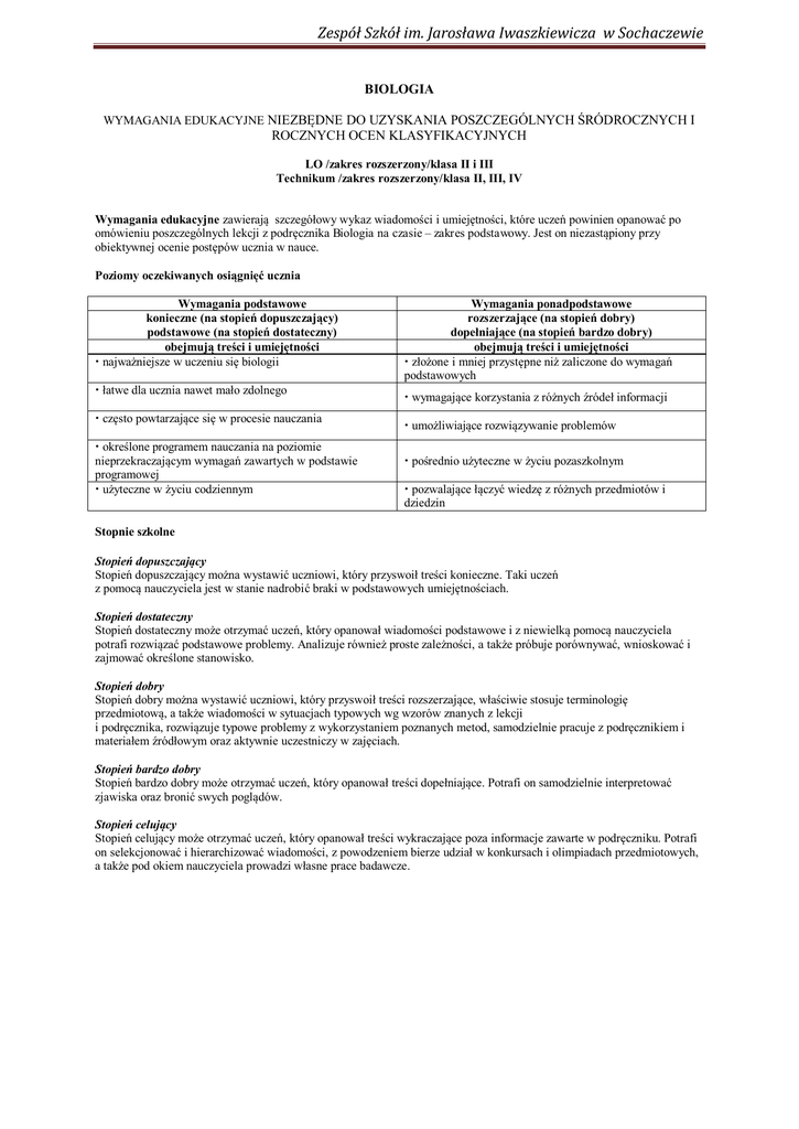 Zespół Szkół im Jarosława Iwaszkiewicza w Sochaczewie BIOLOGIA WYMAGANIA EDUKACYJNE NIEZB DNE DO UZYSKANIA POSZCZEGÓLNYCH RÓDROCZNYCH I ROCZNYCH OCEN KLASYFIKACYJNYCH LO /zakres rozszerzony/klasa II i III Technikum /zakres rozszerzony/klasa II, III, IV Wymagania edukacyjne zawieraj szczegółowy wykaz wiadomo ci i umiej tno ci, które ucze powinien opanować po omówieniu poszczególnych lekcji z podr cznika Biologia na czasie – zakres podstawowy. Jest on niezast piony przy obiektywnej ocenie post pów ucznia w nauce. Poziomy oczekiwanych osi gni ć ucznia Wymagania podstawowe konieczne (na stopie dopuszczaj cy) podstawowe (na stopie dostateczny) obejmuj tre ci i umiej tno ci najwa niejsze w uczeniu si biologii łatwe dla ucznia nawet mało zdolnego cz sto powtarzaj ce si w procesie nauczania okre lone programem nauczania na poziomie nieprzekraczaj cym wymaga zawartych w podstawie programowej u yteczne w yciu codziennym Wymagania ponadpodstawowe rozszerzaj ce (na stopie dobry) dopełniaj ce (na stopie bardzo dobry) obejmuj tre ci i umiej tno ci zło one i mniej przyst pne ni zaliczone do wymaga podstawowych wymagaj ce korzystania z ró nych ródeł informacji umo liwiaj ce rozwi zywanie problemów po rednio u yteczne w yciu pozaszkolnym pozwalaj ce ł czyć wiedz z ró nych przedmiotów i dziedzin Stopnie szkolne Stopie dopuszczaj cy Stopie dopuszczaj cy mo na wystawić uczniowi, który przyswoił tre ci konieczne. Taki ucze z pomoc nauczyciela jest w stanie nadrobić braki w podstawowych umiej tno ciach. Stopie dostateczny Stopie dostateczny mo e otrzymać ucze , który opanował wiadomo ci podstawowe i z niewielk pomoc nauczyciela potrafi rozwi zać podstawowe problemy. Analizuje równie proste zale no ci, a tak e próbuje porównywać, wnioskować i zajmować okre lone stanowisko. Stopie dobry Stopie dobry mo na wystawić uczniowi, który przyswoił tre ci rozszerzaj ce, wła ciwie stosuje terminologi przedmiotow , a tak e wiadomo ci w sytuacjach typowych wg wzorów znanych z lekcji i podr cznika, rozwi zuje typowe problemy z wykorzystaniem poznanych metod, samodzielnie pracuje z podr cznikiem i materiałem ródłowym oraz aktywnie uczestniczy w zaj ciach. Stopie bardzo dobry Stopie bardzo dobry mo e otrzymać ucze , który opanował tre ci dopełniaj ce. Potrafi on samodzielnie interpretować zjawiska oraz bronić swych pogl dów. Stopie celuj cy Stopie celuj cy mo e otrzymać ucze , który opanował tre ci wykraczaj ce poza informacje zawarte w podr czniku. Potrafi on selekcjonować i hierarchizować wiadomo ci, z powodzeniem bierze udział w konkursach i olimpiadach przedmiotowych, a tak e pod okiem nauczyciela prowadzi własne prace badawcze. Zespół Szkół im Jarosława Iwaszkiewicza w Sochaczewie WYMAGANIA EDUKACYJNE BIOLOGIA NA CZASIE 1 Dział programu Badania przyrodnicze Chemiczne podstawy ycia Lp. Poziom wymaga Temat konieczny (K) podstawowy (P) rozszerzaj cy (R) Ucze : omawia zasady prowadzenia i dokumentowania bada formułuje główne etapy bada do konkretnych obserwacji i do wiadcze biologicznych planuje przykładow obserwacj biologiczn wykonuje dokumentacj przykładowej obserwacji porównuje działanie mikroskopu optycznego i mikroskopu elektronowego wymienia zalety i wady mikroskopów optycznych oraz elektronowych dopełniaj cy (D) Ucze : analizuje kolejne etapy prowadzenia bada Metodyka bada biologicznych Ucze : rozró nia metody poznawania wiata wymienia etapy bada biologicznych Ucze : wyja nia, na czym polega ró nica mi dzy rozumowaniem dedukcyjnym a rozumowaniem indukcyjnym rozró nia problem badawczy od hipotezy, prób kontroln od próby badawczej, zmienn niezale n od zmiennej zale nej 2 Obserwacje mikroskopowe jako ródło wiedzy biologicznej nazywa elementy układu optycznego i układu mechanicznego mikroskopu optycznego wymienia cechy obrazu ogl danego w mikroskopie optycznym definiuje poj cie zdolno ć rozdzielcza wyja nia sposób działania mikroskopów optycznego i elektronowego 1 Składniki nieorganiczne organizmów klasyfikuje zwi zki chemiczne na organiczne i nieorganiczne wymienia zwi zki buduj ce organizm klasyfikuje pierwiastki na makroelementy i mikroelementy wymienia pierwiastki biogenne nazywa wi zania i oddziaływania chemiczne wymienia funkcje wody wymienia funkcje soli mineralnych wymienia cechy i funkcje głównych grup w glowodanów klasyfikuje sacharydy i podaje przykłady wymienia wła ciwo ci mono-, oligo- i polisacharydów omawia znaczenie wybranych makro- i mikroelementów okre la znaczenie i wyst powanie wybranych typów wi za i oddziaływa chemicznych omawia budow cz steczki wody okre la objawy niedoboru wybranych makro- i mikroelementów charakteryzuje budow ró nych typów wi za chemicznych charakteryzuje wła ciwo ci fizykochemiczne wody uzasadnia znaczenie soli mineralnych dla organizmów rysuje modele ró nych typów wi za chemicznych wykazuje zwi zek mi dzy budow cz steczki wody i wła ciwo ciami a jej rol w organizmie okre la kryterium klasyfikacji sacharydów wyja nia, w jaki sposób powstaje wi zanie O-glikozydowe omawia wyst powanie i znaczenie wybranych mono-, oligo- i polisacharydów klasyfikuje monosacharydy charakteryzuje i porównuje budow wybranych polisacharydów porównuje budow chemiczn mono-, oligo- i polisacharydów planuje do wiadczenie maj ce na celu wykrycie glukozy wymienia kryteria klasyfikacji tłuszczowców charakteryzuje budow lipidów prostych, zło onych i izoprenowych uzasadnia znaczenie cholesterolu planuje do wiadczenie, którego celem jest wykrycie lipidów charakteryzuje grupy białek ze wzgl du na pełnione funkcje, liczb aminokwasów w ła cuchu i struktur oraz obecno ć elementów nieaminokwasowych zapisuje wzór ogólny aminokwasów zapisuje reakcj powstawania dipeptydu omawia powstawanie form pier cieniowych monosacharydów ilustruje powstawanie wi zania Oglikozydowego zapisuje wzory wybranych w glowodanów 1 2 Budowa i znaczenie w glowodanów 3 Lipidy – budowa i znaczenie wymienia fu