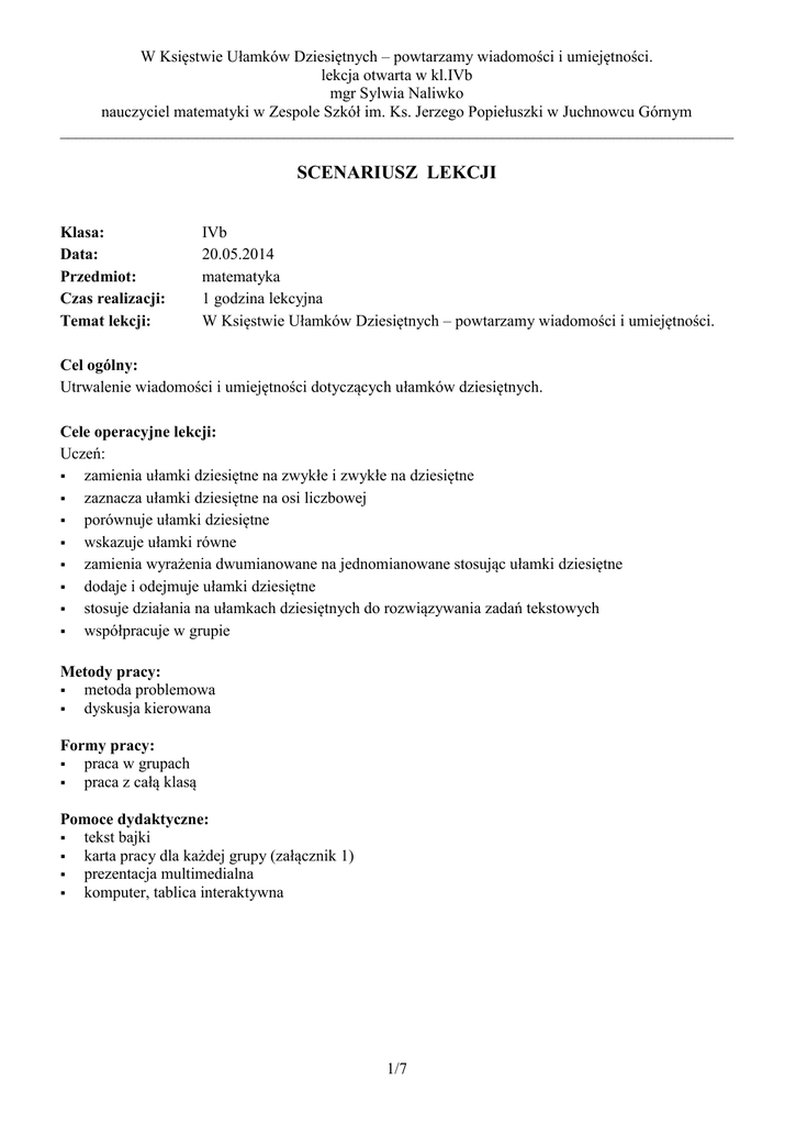 scenariusz lekcji - Zespół Szkół im. Ks. Jerzego Popiełuszki w