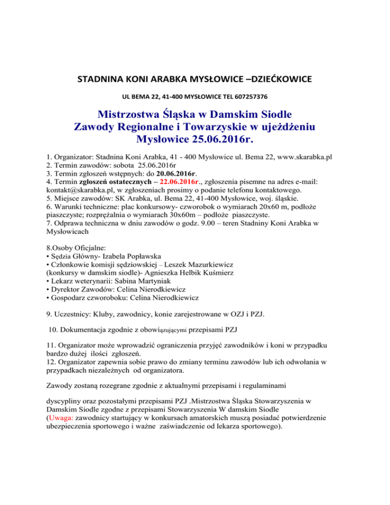 STADNINA KONI ARABKA MYSŁOWICE –DZIEĆKOWICE UL BEMA 22, 41-400 MYSŁOWICE TEL 607257376 Mistrzostwa Śląska w Damskim Siodle Zawody Regionalne i Towarzyskie w ujeżdżeniu Mysłowice 25.06.2016r. 1. Organizator: Stadnina Koni Arabka, 41 - 400 Mysłowice ul. Bema 22, www.skarabka.pl 2. Termin zawodów: sobota 25.06.2016r 3. Termin zgłoszeń wstępnych: do 20.06.2016r. 4. Termin zgłoszeń ostatecznych – 22.06.2016r., zgłoszenia pisemne na adres e-mail: [email protected], w zgłoszeniach prosimy o podanie telefonu kontaktowego. 5. Miejsce zawodów: SK Arabka, ul. Bema 22, 41-400 Mysłowice, woj. śląskie. 6. Warunki techniczne: plac konkursowy- czworobok o wymiarach 20x60 m, podłoże piaszczyste; rozprężalnia o wymiarach 30x60m – podłoże piaszczyste. 7. Odprawa techniczna w dniu zawodów o godz. 9.00 – teren Stadniny Koni Arabka w Mysłowicach 8.Osoby Oficjalne: • Sędzia Główny- Izabela Popławska • Członkowie komisji sędziowskiej – Leszek Mazurkiewicz (konkursy w damskim siodle)- Agnieszka Helbik Kuśmierz • Lekarz weterynarii: Sabina Martyniak • Dyrektor Zawodów: Celina Nierodkiewicz • Gospodarz czworoboku: Celina Nierodkiewicz 9. Uczestnicy: Kluby, zawodnicy, konie zarejestrowane w OZJ i PZJ. 10. Dokumentacja zgodnie z obowiązującymi przepisami PZJ 11. Organizator może wprowadzić ograniczenia przyjęć zawodników i koni w przypadku bardzo dużej ilości zgłoszeń. 12. Organizator zapewnia sobie prawo do zmiany terminu zawodów lub ich odwołania w przypadkach niezależnych od organizatora. Zawody zostaną rozegrane zgodnie z aktualnymi przepisami i regulaminami dyscypliny oraz pozostałymi przepisami PZJ .Mistrzostwa Śląska Stowarzyszenia w Damskim Siodle zgodne z przepisami Stowarzyszenia W damskim Siodle (Uwaga: zawodnicy startujący w konkursach amatorskich muszą posiadać potwierdzenie ubezpieczenia sportowego i ważne zaświadczenie od lekarza sportowego). PROGRAM ZAWODÓW 25.06.2016 Odprawa techniczna od godz. 9.00. Konkursy od godz. 9.30. Konkurs nr L- 1 (Mała Runda MPA) - półfinał Mistrzostw Śląska MR w damskim siodle Konkurs nr P-6 (Mała runda MPA) – finał Mistrzostw Śląska MR w damskim siodle Pozostałe konkursy w damskim siodle : Konkursy dodatkowe Equitation, elegancji historyczny ,konkurs przejazd dowolny. Konkurs nr.1 L-1 –ZR i ZT Konkurs nr.2 L-3 ZR i ZT Konkurs nr 3 P-3 – ZR i ZT Konkurs nr 4 N-7 – ZR Konkurs nr 5 C-1 – ZR Konkurs nr.6 CC-4- ZR Konkurs nr.7 CC-5-ZR Istnieje również możliwość pojechania ww. konkursów konsultacyjnie. SPRAWY ORGANIZACYJNE 1. Opłaty: opłata organizacyjna 60,00 PLN od przejazdu (ZR, ZT, Mistrzostwa Śląska w damskim siodle); 35,00 PLN za udział we wszystkich konkursach, dodatkowych w damskim siodle. 2. Wszystkie opłaty należy uregulować przed startem. 3. Pojemniki na paszę i wodę we własnym zakresie. W sprawie boksów prosimy o kontakt telefoniczny. Wyżywienie we własnym zakresie lub na terenie Ośrodka. 5. Za reklamacje i odwołania obowiązuje kaucja w wys. 200zł. 6. Wymagana dokumentacja dla koni: aktualne badania i szczepienia ochronne. 7. Organizator nie ponosi odpowiedzialności za kradzieże, wypadki oraz inne szkody mogące mieć miejsce podczas zawodów i transportu. 8. Nagrody: Dla zwycięskich koni Flot’s i nagrody rzeczowe. 9. Propozycje zawodów zatwierdzone przez Śląski Związek Jeździecki . SPRAWY WETERYNARYJNE 1. Powiatowy lekarz wet. Dr Tadeusz Hapeta 2. Lekarz wet. zawodów Dr Sabina Martyniak 601 156 266 Szczepienia ochronne przeciwko grypie koni. Obowiązuje następujący schemat szczepień a. szczepienie podstawowe: • pierwsze szczepienie – w dniu rozpoczęcia szczepień • drugie szczepienie – nie wcześniej niż 21-go dnia i nie później j niż 92 dnia od pierwszego szczepienia. b. szczepienie przypominające: • co 6 miesięcy od ostatniego szczepienia (jest dopuszczalny 21 dniowy okres karencji); • żadne szczepienie przypominające nie może się odbyć później niż na 7 dni przed przybyciem na zawody. KODEKS POSTĘPOWANIA Z KONIEM Polski Związek Jeździecki prosi wszystkie osoby zaangażowane w jakikolwiek sposób w sporty konne, o przestrzeganie poniżej przedstawionego kodeksu oraz zasady, że dobro konia jest najważniejsze. Dobro konia musi być zawsze i wszędzie uwzględnione w sportach konnych i nie może być podporządkowane współzawodnictwu sportowemu ani innym celom np. komercyjnym. I. Na wszystkich etapach treningu i przygotowań konia do startu w zawodach, dobro konia musi stać ponad wszelkimi innymi wymaganiami. Dotyczy to stałej opieki, metod treningu, starannego obrządku, kucia i transportu. II. Konie i jeźdźcy muszą być wytrenowani, kompetentni i zdrowi zanim wezmą udział w zawodach. Odnosi się to także do podawania leków i środków medycznych, zabiegów chirurgicznych zagrażającym dobru konia lub ciąży klaczy klaczy, oraz do przypadków nadużycia pomocy. III. Zawody nie mogą zagrażać dobru konia. Wymaga to zwrócenia szczególnej uwagi na teren zawodów, powierzchnię podłoża, pogodę, warunki stajenne, kondycję koni i ich bezpieczeństwo także podczas podróży na zawody i powrotnej z zawodów. IV. Należy dołożyć wszelkich starań, aby zapewnić koniom staranną opiekę po zakończeniu zawodów, a także humanitarne traktowanie po zakończeniu kariery sportowej. Dotyczy to właściwej opieki weterynaryjnej obciążeń odniesionych na zawodach, spokojnej starości, ewentualnie eutanazji . PZJ zachęca wszystkie osoby działające w sporcie jeździeckim do stałego podnoszenia swojej wiedzy oraz umiejętności dotyczących wszelkich aspektów współpracy z koniem. Stadnina Koni Arabka, 41-400 Mysłowice ul. Bema 22, www.skarabka.pl, [email protected]
