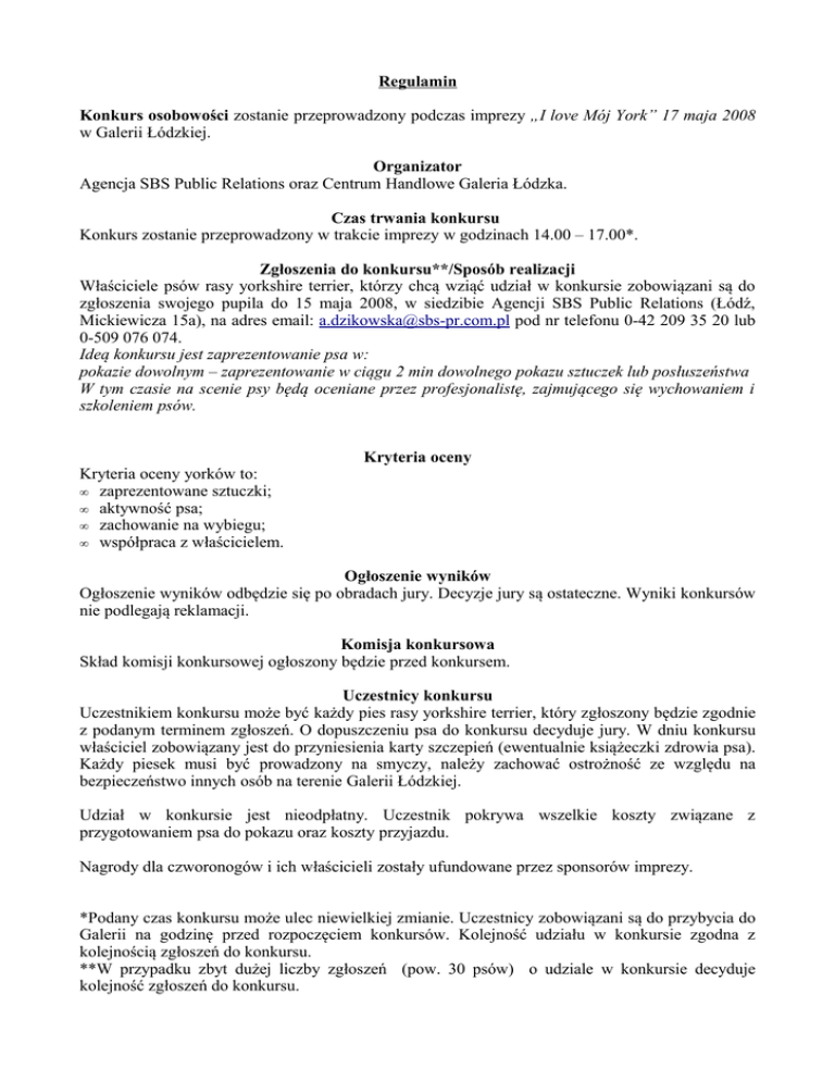 Regulamin Konkurs osobowości zostanie przeprowadzony podczas imprezy „I love Mój York” 17 maja 2008 w Galerii Łódzkiej. Organizator Agencja SBS Public Relations oraz Centrum Handlowe Galeria Łódzka. Czas trwania konkursu Konkurs zostanie przeprowadzony w trakcie imprezy w godzinach 14.00 – 17.00*. Zgłoszenia do konkursu**/Sposób realizacji Właściciele psów rasy yorkshire terrier, którzy chcą wziąć udział w konkursie zobowiązani są do zgłoszenia swojego pupila do 15 maja 2008, w siedzibie Agencji SBS Public Relations (Łódź, Mickiewicza 15a), na adres email: [email protected] pod nr telefonu 0-42 209 35 20 lub 0-509 076 074. Ideą konkursu jest zaprezentowanie psa w: pokazie dowolnym – zaprezentowanie w ciągu 2 min dowolnego pokazu sztuczek lub posłuszeństwa W tym czasie na scenie psy będą oceniane przez profesjonalistę, zajmującego się wychowaniem i szkoleniem psów. Kryteria oceny Kryteria oceny yorków to: • zaprezentowane sztuczki; • aktywność psa; • zachowanie na wybiegu; • współpraca z właścicielem. Ogłoszenie wyników Ogłoszenie wyników odbędzie się po obradach jury. Decyzje jury są ostateczne. Wyniki konkursów nie podlegają reklamacji. Komisja konkursowa Skład komisji konkursowej ogłoszony będzie przed konkursem. Uczestnicy konkursu Uczestnikiem konkursu może być każdy pies rasy yorkshire terrier, który zgłoszony będzie zgodnie z podanym terminem zgłoszeń. O dopuszczeniu psa do konkursu decyduje jury. W dniu konkursu właściciel zobowiązany jest do przyniesienia karty szczepień (ewentualnie książeczki zdrowia psa). Każdy piesek musi być prowadzony na smyczy, należy zachować ostrożność ze względu na bezpieczeństwo innych osób na terenie Galerii Łódzkiej. Udział w konkursie jest nieodpłatny. Uczestnik pokrywa wszelkie koszty związane z przygotowaniem psa do pokazu oraz koszty przyjazdu. Nagrody dla czworonogów i ich właścicieli zostały ufundowane przez sponsorów imprezy. *Podany czas konkursu może ulec niewielkiej zmianie. Uczestnicy zobowiązani są do przybycia do Galerii na godzinę przed rozpoczęciem konkursów. Kolejność udziału w konkursie zgodna z kolejnością zgłoszeń do konkursu. **W przypadku zbyt dużej liczby zgłoszeń (pow. 30 psów) o udziale w konkursie decyduje kolejność zgłoszeń do konkursu.