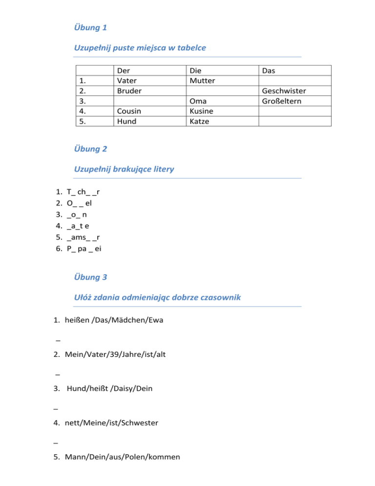 Übung 1 Uzupełnij puste miejsca w tabelce Übung 2 Uzupełnij