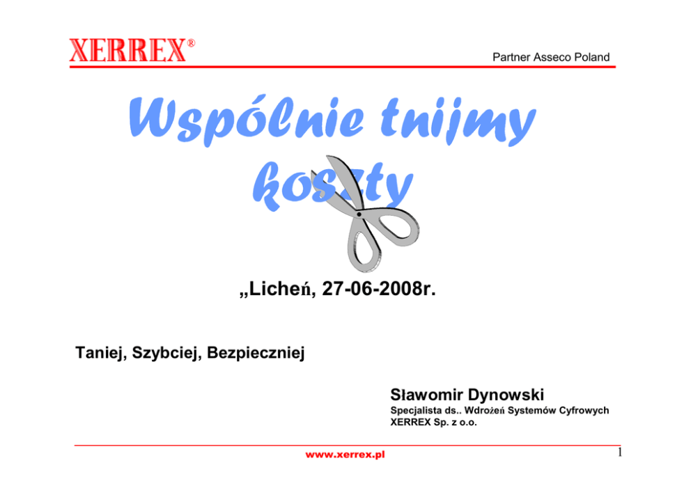 Partner Asseco Poland „Licheń, 27-06-2008r. Taniej, Szybciej, Bezpieczniej Sławomir Dynowski Specjalista ds.. WdroŜeń Systemów Cyfrowych XERREX Sp. z o.o. www.xerrex.pl 1 Partner Asseco Poland 1. Firma XERREX Sp. z o.o. 35-032 Rzeszów ul. Lisa Kuli 6 • Spółka zarejestrowana Sądzie Rejonowym w Rzeszowie pod nr KRS 0000009107 • Kapitał zakładowy wynosi 1’860’000,00 PLN • Firma posiada zastrzeŜony znak towarowy: XERREX® www.xerrex.pl 2 Partner Asseco Poland 1. Firma • XERREX Sp. z o.o. z siedzibą w Rzeszowie Działamy w sektorze cyfrowych rozwiązań przetwarzania i przepływu informacji Specjalizujemy się w optymalizacji procesów przepływu dokumentów Dostarczamy klientom kompleksowe systemy rozwiązań wspomagające tworzenie, archiwizację, obieg dokumentów oraz profesjonalne urządzenia wielofunkcyjne Stale podnosimy jakość świadczonych usług oraz dbamy o niezawodność oferowanych rozwiązań w dziedzinie zarządzania dokumentami Posiadamy 21-letni know-how (działamy od 1987r.) www.xerrex.pl 3 Partner Asseco Poland 2. Obieg dokumentów • Obecna sytuacja związana z obiegiem dokumentów: Rozwój techniki sprawił informacja biznesowa stała się ogólnie dostępna oraz łatwa do zarchiwizowania Doprowadziło to do dynamicznego wzrostu tworzonych nakładów w formie papierowej Brak kontroli oraz nieprawidłowe zarządzanie dokumentami produkowanymi na urządzeniach kopiujących i drukujących powoduje wzrost kosztów Ze względu na istotę dokumentów, nie moŜna z nich zrezygnować www.xerrex.pl 4 Partner Asseco Poland 2. Obieg dokumentów • Typowy obieg dokumentów www.xerrex.pl 5 Partner Asseco Poland 2.1 Koszty obiegu dokumentów • Źródła kosztów związanych z obiegiem dokumentów: Bardzo duŜo urządzeń w róŜnych lokalizacjach Znaczne koszty eksploatacji Skomplikowana obsługa Strata zajmowanej powierzchni biurowej Konieczność współpracy z wieloma dostawcami (materiały, obsługa serwisowa, itp...) Brak kontroli nad przepływem dokumentów MoŜliwość zagubienia dokumentów / informacji „Wąskie gardła” – przerwa w procesie obiegu dokumentów spowodowana nieobecnością osób odpowiedzialnych Niechęć do korzystania z archiwów www.xerrex.pl 6 Partner Asseco Poland 2.1 Koszty obiegu dokumentów • Generowane koszty: Koszty twarde: Koszty miękkie: Toner Papier Amortyzacja Koszt powierzchni archiwum Infrastruktura IT Oprogramowanie Sprzęt www.xerrex.pl Czas pracowników Projektowanie Chodzenie Oczekiwanie Wykańczanie Obsługa kontaktów z dostawcami Marnotrawstwo Błędy uŜytkowników 7 Partner Asseco Poland 2.1 Koszty obiegu dokumentów • Koszty twarde: • Średni koszt strony: ~ 0,095 PLN (bez koloru) Wyłączając: * Amortyzację sprzętu * Koszty logistyki * Koszty zarządzania * Koszty papieru • Szacunkowa wielkość rocznych nakładów: ~ 3.000.000 stron Przy załoŜeniu około 500 stron miesięcznie na pracownika biurowego (średnia dla Polski) dla firmy 500 osobowej ~ 285.000 PLN rocznie za samą eksploatację www.xerrex.pl 8 Partner Asseco Poland 2.1 Koszty obiegu dokumentów • Koszty miękkie: Koszt 1 etatu [zł brutto] Liczba pracowników % udziału w obsłudze dokumentów % zaangaŜowania Pełne etaty "dokumentowe" Roczny koszt etatów 4522,4 500 25% 10% 12,5 678 360,00 zł Źródło: oprac. własne na podstawie Businessman – Raport Outsourcing, nr 8 (173) sierpień 2005, str. 68 www.xerrex.pl 9 Partner Asseco Poland 3. Zarządzanie środowiskiem dokumentowym • Potrzeba kontroli kosztów i usprawnienia zarządzania środowiskiem dokumentowym poprzez: Zidentyfikowanie wraŜliwych obszarów w procesie wytwarzania dokumentów Skoncentrowanie aktywności na najbardziej krytycznych obszarach Szukanie rozwiązań optymalnego wykorzystania zasobów będących w dyspozycji firmy Analiza alternatywnych rozwiązań Redukcja kosztów i zwiększenie efektywności pracy www.xerrex.pl 10 Partner Asseco Poland 3.1 Audyt • Celem audytu jest: Ocena procesów wytworzenia dokumentów Analiza zapotrzebowania i oszacowanie wysokości kosztów wytworzenia dokumentów. Wskazanie obszarów wymagających usprawnienia lub generujących nadmierne koszty Przedstawienie propozycji rozwiązań umoŜliwiających: Zwiększenie efektywności obiegu dokumentów Podniesienia bezpieczeństwa danych Pełną kontrolę i racjonalizację kosztów www.xerrex.pl 11 Partner Asseco Poland 3.1 Audyt • Efektem audytu jest projekt wraz z wyliczeniem opłacalności jego wdroŜenia. Zawiera: Ocenę bieŜącej sytuacji ze względu na koszty twarde: Inwentaryzację wszystkich urządzeń związanych ze środowiskiem dokumentowym Analizę kosztów produkcji dokumentów w oparciu o ilość wytwarzanych dokumentów i koszty eksploatacji urządzeń Ocenę bieŜącej sytuacji ze względu na koszty miękkie: Charakterystykę sieci i obecnego modelu pracy uŜytkowników Analizę wydajności zasobów ludzkich w organizacji klienta www.xerrex.pl 12 Partner Asseco Poland 3.1 Audyt Kierunki zmian: Informacje o moŜliwościach i kierunkach poprawy efektywności zarządzania posiadanymi zasobami Propozycje rozwiązań pozwalających obniŜyć koszty i w pełni kontrolować proces produkcji dokumentów Sugestie jak polepszyć organizację pracy i zaoszczędzić czas, przy uwzględnieniu specyfiki przedsiębiorstwa. Szacunkową wartość oszczędności z wdroŜenia projektu www.xerrex.pl 13 Partner Asseco Poland 3.2 Korzyści ze zmian • Zalety z wdroŜenia kompleksowej propozycji systemu zarządzania wydrukami, opracowanej na podstawie audytu: Wzrost efektywności i bezpieczeństwa procesu wytwarzania dokumentów Lepsze wykorzystanie istniejących zasobów infrastrukturalnych firmy Znaczna redukcja i dokładna kontrola kosztów związanych obsługą obiegu informacji poprzez wdroŜenie rozwiązań firmy XERREX Przygotowanie firmy na potrzeby związane z przyszłym rozwojem www.xerrex.pl 14 Partner Asseco Poland 3.2. Korzyści ze zmian • Dla przypomnieni