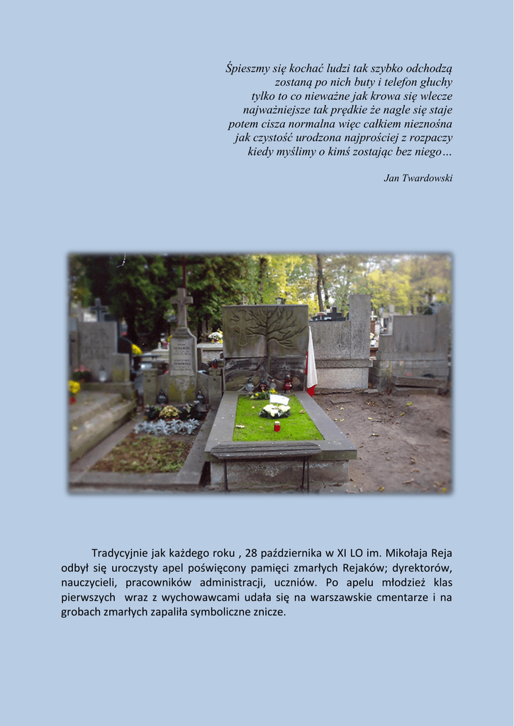 Śpieszmy się kochać ludzi tak szybko odchodzą zostaną po nich buty i telefon głuchy tylko to co nieważne jak krowa się wlecze najważniejsze tak prędkie że nagle się staje potem cisza normalna więc całkiem nieznośna jak czystość urodzona najprościej z rozpaczy kiedy myślimy o kimś zostając bez niego… Jan Twardowski Tradycyjnie jak każdego roku , 28 października w XI LO im. Mikołaja Reja odbył się uroczysty apel poświęcony pamięci zmarłych Rejaków; dyrektorów, nauczycieli, pracowników administracji, uczniów. Po apelu młodzież klas pierwszych wraz z wychowawcami udała się na warszawskie cmentarze i na grobach zmarłych zapaliła symboliczne znicze.