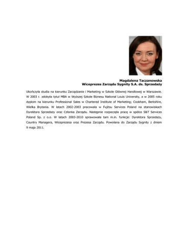 Magdalena Taczanowska Wiceprezes Zarządu Sygnity S.A. ds. Sprzedaży Ukończyła studia na kierunku Zarządzanie i Marketing w Szkole Głównej Handlowej w Warszawie. W 2003 r. zdobyła tytuł MBA w Wyższej Szkole Biznesu National Louis University, a w 2005 roku dyplom na kierunku Professional Sales w Chartered Institute of Marketing; Cookham, Berkshire, Wielka Brytania. W latach 2002-2003 pracowała w Fujitsu Services Poland na stanowiskach Dyrektora Sprzedaży oraz Członka Zarządu. Następnie rozpoczęła pracę w spółce S&T Services Poland Sp. z o.o. W latach 2003-2010 sprawowała tam m.in. funkcje: Dyrektora Sprzedaży, Country Managera, Wiceprezesa oraz Prezesa Zarządu. Powołana do Zarządu Sygnity z dniem 9 maja 2011.