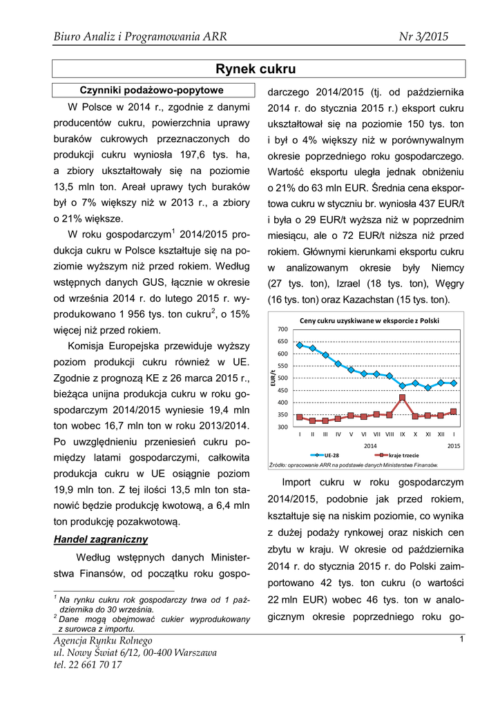 Biuro Analiz i Programowania ARR Nr 3/2015 Rynek cukru Czynniki podażowo-popytowe darczego 2014/2015 (tj. od października W Polsce w 2014 r., zgodnie z danymi 2014 r. do stycznia 2015 r.) eksport cukru producentów cukru, powierzchnia uprawy ukształtował się na poziomie 150 tys. ton buraków cukrowych przeznaczonych do i był o 4% większy niż w porównywalnym produkcji cukru wyniosła 197,6 tys. ha, okresie poprzedniego roku gospodarczego. a zbiory ukształtowały się na poziomie Wartość eksportu uległa jednak obniżeniu 13,5 mln ton. Areał uprawy tych buraków o 21% do 63 mln EUR. Średnia cena ekspor- był o 7% większy niż w 2013 r., a zbiory towa cukru w styczniu br. wyniosła 437 EUR/t o 21% większe. i była o 29 EUR/t wyższa niż w poprzednim 1 W roku gospodarczym 2014/2015 pro- miesiącu, ale o 72 EUR/t niższa niż przed dukcja cukru w Polsce kształtuje się na po- rokiem. Głównymi kierunkami eksportu cukru ziomie wyższym niż przed rokiem. Według w wstępnych danych GUS, łącznie w okresie (27 tys. ton), Izrael (18 tys. ton), Węgry od września 2014 r. do lutego 2015 r. wy- (16 tys. ton) oraz Kazachstan (15 tys. ton). analizowanym okresie były Niemcy 2 produkowano 1 956 tys. ton cukru , o 15% Ceny cukru uzyskiwane w eksporcie z Polski więcej niż przed rokiem. 700 650 Komisja Europejska przewiduje wyższy 600 poziom produkcji cukru również w UE. bieżąca unijna produkcja cukru w roku gospodarczym 2014/2015 wyniesie 19,4 mln ton wobec 16,7 mln ton w roku 2013/2014. Po uwzględnieniu przeniesień cukru pomiędzy latami gospodarczymi, całkowita produkcja cukru w UE osiągnie poziom 19,9 mln ton. Z tej ilości 13,5 mln ton stanowić będzie produkcję kwotową, a 6,4 mln ton produkcję pozakwotową. Handel zagraniczny Według wstępnych danych Ministerstwa Finansów, od początku roku gospo1 Na rynku cukru rok gospodarczy trwa od 1 października do 30 września. 2 Dane mogą obejmować cukier wyprodukowany z surowca z importu. Agencja Rynku Rolnego ul. Nowy Świat 6/12, 00-400 Warszawa tel. 22 661 70 17 EUR/t Zgodnie z prognozą KE z 26 marca 2015 r., 550 500 450 400 350 300 I II III IV V VI VII VIII IX X XI XII 2014 UE-28 I 2015 kraje trzecie Źródło: opracowanie ARR na podstawie danych Ministerstwa Finansów. Import cukru w roku gospodarczym 2014/2015, podobnie jak przed rokiem, kształtuje się na niskim poziomie, co wynika z dużej podaży rynkowej oraz niskich cen zbytu w kraju. W okresie od października 2014 r. do stycznia 2015 r. do Polski zaimportowano 42 tys. ton cukru (o wartości 22 mln EUR) wobec 46 tys. ton w analogicznym okresie poprzedniego roku go1 Biuro Analiz i Programowania ARR Nr 3/2015 spodarczego. W okresie czterech pierw- Krajowe ceny zbytu cukru białego (z VAT) szych miesięcy bieżącego roku gospodar- 3,30 3,10 czego cukier importowano do Polski przede 2,90 2,70 wszystkim z Niemiec (17 tys. ton), Francji 2,50 zł/kg (9 tys. ton) oraz Danii (7 tys. ton). 2,30 2,10 Handel zagraniczny cukrem 1,90 70 1,70 1,50 60 VIIVIII IX X XI XII I II III IV V VI VIIVIII IX X XI XII I II tys. ton 50 cukier workowany 40 2014 2015 cukier paczkowany Źródło: opracowanie ARR na podstawie danych GUS. 30 Ceny cukru na giełdach światowych 20 W marcu 2015 r. odnotowano dalszy spa- 10 0 I II III IV V VI VII VIII IX X XI XII I 2015* 2014* wywóz przywóz * dane wstępne dek cen cukru na monitorowanych giełdach światowych. Spadek cen związany jest z prognozą wzrostu zbiorów trzciny cukrowej Źródło: opracowanie ARR na podstawie danych Ministerstwa Finansów. W roku 2014/2015 (stan na koniec w Brazylii w sezonie 2015/2016 oraz znacz- stycznia br.) saldo wymiany handlowej cu- nym bieżącym eksportem cukru z tego kraju. krem było dodatnie i wyniosło 108 tys. ton Notowany średni poziom cen na giełdach i 41 mln EUR. światowych jest najniższy od sześciu lat. Notowania cen kontraktów terminowych cukru białego i surowego Tendencje cenowe 550 Krajowe ceny cukru 500 W lutym 2015 r. odnotowano ponowny ale ich poziom był nadal dużo niższy niż 450 USD/t wzrost cen zbytu cukru na rynku krajowym, 400 350 przed rokiem. Ceny 300 zbytu cukru paczkowanego 250 IX X XI XII I II III IV V VI VIIVIII IX X XI XII I II III wyniosły średnio 1,86 zł/kg (z VAT), o 7% 2013 więcej niż w styczniu, ale o 20% mniej niż przed rokiem. W analizowanym miesiącu w mniejszym stopniu (o 1%) wzrosły ceny zbytu cukru workowanego i wyniosły 1,83 zł/kg (z VAT). Ceny zbytu cukru w workach były o 25% niższe niż przed rokiem. Agencja Rynku Rolnego ul. Nowy Świat 6/12, 00-400 Warszawa tel. 22 661 70 17 2014 LIFFE Londyn - cukier biały 2015 ICE New York - cukier surowy Źródło: opracowanie ARR na podstawie danych FAMMU/FAPA. Na giełdzie LIFFE w Londynie w marcu 2015 r. średnia cena cukru białego (w trzymiesięcznym kontrakcie terminowym) wyniosła 368 USD/t i była o 3% niższa niż w lutym. Natomiast na giełdzie 2 Biuro Analiz i Programowania ARR Nr 3/2015 IntercontinentalExchange (ICE) w Nowym z 20 listopada 2014 r. limit wywozu cukru Jorku średnie ceny trzymiesięcznych kon- pozakwotowego w sezonie 2014/2015 dla traktów terminowych na cukier surowy spa- całej UE ustalono na poziomie 1 350 tys. ton dły w większym stopniu (o 11%), kształtując i został całkowicie rozdysponowany po- się na poziomie 285 USD/t. między kraje członkowskie. Z podanej ilo- Ceny cukru białego w marcu były niższe ści krajowi przedsiębiorcy uzyskali niż przed rokiem o 21%, a surowego o 27% pozwolenia na wywóz łącznie 147 tys. ton niższe. cukru. Zgodnie z danymi ARR z 31 marca Działania ARR na rynku cukru 2015 r. w ramach pozwoleń wydanych na rok 2014/2015 z kraju wywieziono około Administrowanie przywozem cukru Agencja Rynku Rolnego administruje 68 tys. ton cukru pozakwotowego. Przetwarzanie cukru przemysłowego przywozem cukru m.in. z Państw Afryki, Jedną z możliwości zagospodarowania Karaibów i Pacyfiku (AKP) nienależących do cukru pozakwotowego jest p