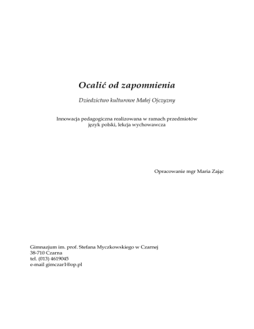 Ocalić od zapomnienia Dziedzictwo kulturowe Małej Ojczyzny Innowacja pedagogiczna realizowana w ramach przedmiotów język polski, lekcja wychowawcza Opracowanie mgr Maria Zając Gimnazjum im. prof. Stefana Myczkowskiego w Czarnej 38-710 Czarna tel. (013) 4619045 e-mail [email protected] Uchwała Rady Pedagogicznej Podstawa programowa DKW-4014-72/99 Świat w słowach i obrazach dla klas I-III Cele wprowadzenia innowacji: Ludność naszej gminy to przede wszystkim ludność napływowa. RóŜne były przyczyny wybierania – dobrowolnego lub z konieczności – Bieszczadów na swoją Małą Ojczyznę. Zdecydowaną większość mieszkańców naszych wsi stanowią przesiedleńcy z roku 1951 z Kresów Wschodnich, którzy przybyli tutaj na miejsce ludności bojkowskiej, zmuszonej wcześniej do opuszczenia swych domostw, wywiezionych na Wschód… Minęło juŜ ponad 50 lat, a oni wciąŜ tęsknią za swoimi domami, za Sokalem, za Krystynopolem. Młodzi często nic z tego nie rozumieją. Aby „ocalić od zapomnienia” i zbudować mosty między pokoleniami dziadków i wnuków, chciałabym realizować zadania przedstawione w opracowanej przeze mnie innowacji: • • • • • kształtowanie postaw świadomego uczestnictwa w budowaniu Małej Ojczyzny; poczucie historii lokalnej, poszanowanie dla przeszłości, dla innej kultury, tolerancja dla ludzi róŜnych wyznań religijnych; dostrzeganie związków teraźniejszości z przeszłością, pogłębianie wiedzy na temat genealogii własnej rodziny; dostrzeganie wartości kultur pogranicza; uświadomienie wartości dziedzictwa rodzinnego, regionalnego, narodowego i identyfikowanie się z nimi. Cele edukacyjne: • • • • • • • • • • poznanie historii Małej Ojczyzny, jej burzliwych losów w II połowie XX wieku; kształtowanie poczucia wartości i znaczenia dziedzictwa kulturalnego i odpowiedzialności za nie; poznanie legend związanych z Bieszczadami; poznanie ludzi waŜnych dla naszego regionu; tworzenie w oparciu o zgromadzone informacje własnych tekstów literackich; wycieczki do Muzeum Budownictwa Ludowego i Muzeum Ikon w Sanoku; poznanie historii kościołów (drewnianych cerkwi) na terenie naszej gminy (typy budownictwa cerkiewnego); troska o stare przycerkiewne cmentarze; przygotowanie do udziału w konkursach wiedzy o regionie; poznanie historii Kmitów (zamek w Lesku, ruiny zamku Sobień); • • • • ikona jako obiekt kultu i dzieło sztuki; świecka architektura bojkowska na terenie naszej gminy; film „I spakowali walizki” z serii „Małe Ojczyzny” w reŜyserii M. Bogusławskiego; gromadzenie słownictwa związanego z topografią gminy. Treści kształcenia: • • • • • • • • • • • • • • • poszanowanie i zrozumienie dla „przeszłości ołtarzy”; rozpoznanie typów budownictwa cerkiewnego (cerkwie bojkowskie, łemkowskie, w narodowym stylu ukraińskim, oraz te, w których widoczny jest wpływ architektury zachodniej); wyjaśnienie pojęcia świątyni jako miejsca kultu róŜnych wyznań religijnych (kościół, synagoga, cerkiew, meczet itp.); zasadnicze róŜnice w wystroju cerkwi i kościoła, rola ikonostasu i jego budowa, świątynia w Czarnej jako przykład przystosowania wystroju cerkwi do potrzeb kościoła; ikona – pisanie ikon, kanon, wzorniki, symbolika koloru, atrybut, podstawowe typy wyobraŜeń Matki BoŜej (Hogiditria, Umilenie, Orantka, Pokrew, M. B. Kazańska) i Chrystusa (np. Pantokrator); proces powstawania ikony jako dzieła sztuki; wycieczka do Muzeum Budownictwa Ludowego i Muzeum Ikon w Sanoku celem przeprowadzenia lekcji na wybrane tematy (w zbiorach placówek znajduje się duŜo ikon z naszego terenu); wycieczka do Muzeum Malarstwa w Rzeszowie i zorganizowanie lekcji na temat konserwacji dzieł sztuki; wycieczka do Leska (zamek Kmitów, synagoga, ruiny zamku Sobień); wycieczka po Czarnej szlakiem dawnej architektury bojkowskiej – „ŚcieŜka historyczno-przyrodnicza Siedlisko”; wycieczka do kościołów – dawnych cerkwi na terenie gminy, w których zachowały się ikony; tworzenie własnych tekstów literackich w oparciu o wiadomości zdobyte przez uczniów w rozmowach z dziadkami, rodzicami; poznawanie pamiątek rodzinnych, pogłębianie więzi rodzinnych, poszanowanie dla osób starszych; tworzenie słownika nazw topograficznych; troska o stare przycerkiewne cmentarze, dokumentowanie starych nagrobków. Opis zasad wprowadzenia innowacji z zajęć edukacyjnych język polski i lekcja wychowawcza Dostępność zajęć • innowacja obejmuje wybrane zajęcia edukacyjne z języka polskiego oraz część lekcji wychowawczych w klasach I-III, w których będę wychowawczynią od 1.09.2007 roku. Pracownia • • • • klasopracownia języka polskiego, gazetki na związane z innowacją tematy, zamieszczenie twórczości literackiej uczniów w szkolnej gazetce, publikowanie wybranych informacji na stronie internetowej gimnazjum. Podręczniki • W. Bobiński Świat w słowach i obrazach – klasy I-III. Kwalifikacje nauczyciela • • studia magisterskie z języka polskiego na Uniwersytecie Jagiellońskim, Kraków, 1983 r.; warsztaty. Literatura: A. Potocki, Między śukowem a Otrytem, Krosno 2002, A. Potocki, Księga legend i opowieści bieszczadzkich, Rzeszów 2006, A. Potocki, Bieszczadzkimi śladami Karola Wojtyły, A. Potocki, Bieszczadzkie losy. Bojkowie i śydzi. Rzeszów 2000, Stanisław Kłos, Bieszczady, Warszawa 2000, Roczniki Bieszczada, Olga Popowa, Ikony, Warszawa 1998, op. P. Luboński, Przewodnik Bieszczady, Pruszków 1998, Paweł Kusal, Zapomniane Bieszczady, Rzeszów 2005. Wydawnictwa albumowe: Konrad Onasch, Ikony, Ikony Polskie, Warszawa 1989, Ikony Słowackie, Warszawa 1980, Мοсковская икона, T. Budziński, Piękno w drewnie zamknięte, Warszawa 1992, T. Budziński, Bieszczady, Warszawa 1985, A Bujak, Domus Dei.