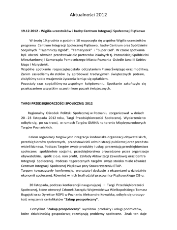 Aktualności 2012 19.12.2012 - Wigilia uczestników i kadry Centrum Integracji Społecznej Piątkowo W środę 19 grudnia o godzinie 10 rozpoczęła się wspólna Wigilia uczestników programu Centrum Integracji Społecznej Piątkowo, kadry Centrum oraz Spółdzielni Socjalnych "Tajemniczy Ogród", "Tamaryszek" i "Super Ład". W czasie spotkania byli obecni również przedstawiciele partnerów lokalnych tj. Poznaoskiej Spółdzielni Mieszkaniowej i Samorządu Pomocniczego Miasta Poznania Osiedle Jana III Sobieskiego i Marysieoki. Wspólne spotkanie rozpoczętezostało odczytaniem Pisma Świętego oraz modlitwą. Zanim zasiedliśmy do stołów by spróbowad tradycyjnych świątecznych potraw, złożyliśmy sobie wzajemnie życzenia łamiąc się opłatkiem. Pozostały czas spędziliśmy na wspólnym kolędowaniu. Spotkanie zakooczyło się przekazaniem wszystkim uczestnikom paczek świątecznych. TARGI PRZEDSIĘBIORCZOŚCI SPOŁECZNEJ 2012 Regionalny Ośrodek Polityki Społecznej w Poznaniu zorganizował w dniach 20 - 23 listopada 2012 roku, Targi Przedsiębiorczości Społecznej. Wydarzenie to odbyło się, po raz trzeci, w ramach Targów GMINA na terenie Międzynarodowych Targów Poznaoskich. Celem organizacji targów jest integracja środowiska organizacji obywatelskich, przedsiębiorców społecznych, przedstawicieli administracji publicznej oraz przedstawicieli biznesu. Podczas Targów swoje produkty i usługi prezentują przedsiębiorstwa społeczne: spółdzielnie socjalne, przedsiębiorstwa prowadzone przez organizacje obywatelskie, spółki z o.o. non profit, Zakłady Aktywizacji Zawodowej oraz Centra Integracji Społecznej. Podczas tegorocznych targów swoje stoisko miało również Centrum Integracji Społecznej Piątkowo przy Stowarzyszeniu ETAP. Targom towarzyszyły konferencje, warsztaty i dyskusje z ekspertami w dziedzinie ekonomii społecznej. Również w nich brali udział pracownicy Piątkowskiego CIS-u. 20 listopada, podczas konferencji inaugurującej III Targi Przedsiębiorczości Społecznej, które otworzył Członek Zarządu Województwa Wielkopolskiego Tomasz Bugajski oraz Dyrektor ROPS w Poznaniu Aleksandra Kowalska, odbyła się uroczystośd wręczenia certyfikatów "Zakup prospołeczny". Certyfikat "Zakup prospołeczny" wyróżnia produkty i usługi podmiotów, które działalnością gospodarczą rozwiązują problemy społeczne. Znak ten daje klientom szansę rozpoznania i kupowania produktów i usług ekonomii społecznej. Chcąc wesprzed marketing i promocję najlepszych przedsiębiorstw społecznych Fundacja im. Królowej Polski św. Jadwigi zainicjowała w roku 2010 kampanię "Certyfikacja i promocja podmiotów ekonomii społecznej". Symbolem akcji stał się znak jakości "Zakup prospołeczny". Początkowo kampania miała zasięg regionalny i funkcjonowała wyłącznie w Wielkopolsce, natomiast od tego roku została z powodzeniem wdrożona w Małopolsce oraz województwie łódzkim. Certyfikaty osobiście wręczał Członek Zarządu Województwa Wielkopolskiego i zarazem przewodniczący Wielkopolskiej Kapituły Certyfikującej, Tomasz Bugajski, w towarzystwie dyrektor poznaoskiego ROPS, Aleksandry Kowalskiej. Wyróżnione zostały cztery podmioty: Centrum Integracji Społecznej Piątkowo przy Stowarzyszeniu ETAP, Spółdzielnia Socjalna "Tamaryszek", Spółdzielnia Inwalidów "Przyjaźo" oraz Spółdzielnia Socjalna "Dąb". Certyfikat "Zakup prospołeczny" przyznany naszemu Centrum odebrał prezes Stowarzyszenia ETAP - Zbyszko Siewkowski, oraz dyrektor Centrum Integracji Społecznej Piątkowo - Lidia Nowotna. Kolejnym wyróżnionym podmiotem była Spółdzielnia Socjalna "Tamaryszek", która została założona przez 8 uczestników zajęd w CIS Piątkowo. Spółdzielnia powstała w 2010 roku a w jej ofercie znajdziemy m.in. pielęgnację terenów zielonych, prace remontowo - budowlane oraz prace porządkowe. Uroczystośd wręczenia certyfikatów "Zakup prospołeczny" poprzedziła wystąpienie Cezarego Miżejewskiego, który prezentował Krajowy Program Rozwoju Ekonomii Społecznej po wstępnych konsultacjach. Było to dla wszystkich obecnych ważne wystąpienie, ponieważ praktycy przedsiębiorczości społecznej zdają sobie sprawę, że program ten w znacznej mierze wpłynie na ich funkcjonowanie na rynku. Ekspert zaprosił podczas swojej prezentacji wszystkich chętnych do współpracy i współtworzenia programu, co zaowocowało dyskusją i zgłoszeniem konkretnych postulatów. Kolejne dni Targów Przedsiębiorczości Społecznej poświęcone były na panele dyskusyjne i warsztaty dotyczące tematyki funkcjonowania przedsiębiorstw społecznych. 10.10.2012r. - Współpraca z Bankiem Żywności Centrum Integracji Społecznej Piątkowo rozpoczęło współpracę z Wielkopolskim Bankiem Żywności. W ramach współpracy uczestnicy programu CIS przechodzący roczną reintegrację społeczną i zawodową raz w miesiącu otrzymują żywnośd. 13.09.2012 r. - Wizyta Studyjna Centrum Integracji Społecznej na Poznaoskim Piątkowie na stałe wpisało się w kalendarz wizyt studyjnych. Tym razem goście z Wielkiej Brytanii odwiedzili mający swoją siedzibę na Osiedlu Zwycięstwa warsztat produkcyjny i porządkowy. W spotkaniu uczestniczyli instruktorzy warsztatów, a także przedstawiciele porządkowej spółdzielni socjalnej "Super Ład". Zwiedzający mieli okazję w praktyce poznad funkcjonowanie zarówno warsztatów zawodowych przy CIS jak i spółdzielni socjalnej. 06.09.2012 - Spotkanie partnerskie na Piątkowie 6 września w siedzibie Biura Zarządu Stowarzyszenia ETAP odbyło się spotkanie partnerskie. W spotkaniu oprócz przedstawicieli Stowarzyszenia ETAP uczestniczyli przedstawiciele organizacji partnerskich tj.: Jerzy Jasicki oraz Michał Tokłowicz. W czasie spotkania poruszone zostały tematy związane z bieżącą działalnością Stowarzyszenia ETAP, oraz planami na działalnośd w najbliższym czasie. 10.08.2012r. - Wizyta z Irlandii i Wielki