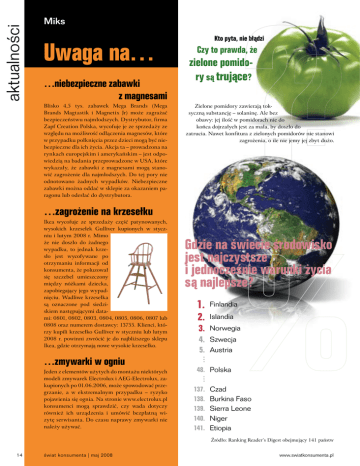 aktualności Miks Uwaga na… …niebezpieczne zabawki z magnesami Blisko 4,5 tys. zabawek Mega Brands (Mega Brands Magtastik i Magnetix Jr) może zagrażać bezpieczeństwu najmłodszych. Dystrybutor, firma Zapf Creation Polska, wycofuje je ze sprzedaży ze względu na możliwość odłączenia magnesów, które w przypadku połknięcia przez dzieci mogą być niebezpieczne dla ich życia. Akcja ta – prowadzona na rynkach europejskim i amerykańskim – jest odpowiedzią na badania przeprowadzone w USA, które wykazały, że zabawki z magnesami mogą stanowić zagrożenie dla najmłodszych. Do tej pory nie odnotowano żadnych wypadków. Niebezpieczne zabawki można oddać w sklepie za okazaniem paragonu lub odesłać do dystrybutora. Kto pyta, nie błądzi Czy to prawda, że zielone pomidory są trujące? Zielone pomidory zawierają toksyczną substancję – solaninę. Ale bez obawy: jej ilość w pomidorach nie do końca dojrzałych jest za mała, by doszło do zatrucia. Nawet konfitura z zielonych pomidorów nie stanowi zagrożenia, o ile nie jemy jej zbyt dużo. …zagrożenie na krzesełku Ikea wycofuje ze sprzedaży część patynowanych, wysokich krzesełek Gulliver kupionych w styczniu i lutym 2008 r. Mimo że nie doszło do żadnego wypadku, to jednak krzesło jest wycofywane po otrzymaniu informacji od konsumenta, że poluzował się szczebel umieszczony między nóżkami dziecka, zapobiegający jego wypadnięciu. Wadliwe krzesełka są oznaczone pod siedziskiem następującymi datami: 0801, 0802, 0803, 0804, 0805, 0806, 0807 lub 0808 oraz numerem dostawcy: 13755. Klienci, którzy kupili krzesełko Gulliver w styczniu lub lutym 2008 r. powinni zwrócić je do najbliższego sklepu Ikea, gdzie otrzymają nowe wysokie krzesełko. …zmywarki w ogniu Jeden z elementów użytych do montażu niektórych modeli zmywarek Electrolux i AEG-Electrolux, zakupionych po 01.06.2006, może spowodować przegrzanie, a w ekstremalnym przypadku – ryzyko pojawienia się ognia. Na stronie www.electrolux.pl konsumenci mogą sprawdzić, czy wada dotyczy również ich urządzenia i umówić bezpłatną wizytę serwisanta. Do czasu naprawy zmywarki nie należy używać. Gdzie na świecie środowisko jest najczystsze i jednocześnie warunki życia są najlepsze? 1. Finlandia 2. Islandia 3. Norwegia 4. Szwecja 5. Austria .. . 48. .. . 137. 138. 139. 140. 141. Polska Czad Burkina Faso Sierra Leone Niger Etiopia Źródło: Ranking Reader’s Digest obejmujący 141 państw 14 świat konsumenta | maj 2008 www.swiatkonsumenta.pl Zakupy w internecie to już codzienność 70% europejskiego handlu on-line jest skoncentrowana na czterech rynkach Europy: w Wielkiej Brytanii, Niemczech, Francji i Belgii – wynika z raportu Obserwator Cetelem 2008. Wielka Brytania jest największym graczem – ponad 80% wszystkich Brytyjczyków kupuje przez internet. Czechy i Polska są natomiast liderami e-zakupów w regionie Europy Środkowo-Wschodniej. Raport prognozuje, że w 2010 r. zakupy przez internet będą stanowić 15% wszelkich transakcji kupna-sprzedaży, a w 2015 osiągną aż 25% udziału w całym rynku handlowym. Od dwóch lat obroty w handlu elektronicznym na europejskich rynkach odnotowują dwucyfrowy wzrost – w drugiej połowie 2006 r. 78% zachodnioeuropejskich internautów dokonało zakupów w sieci. W tym samym czasie tylko w Wielkiej Brytanii na transakcje on-line zdecydowało się 89% użytkowników internetu. W tym kraju o największym odsetku podłączeń gospodarstw domowych do sieci więcej czasu spędza się surfując w internecie niż oglądając telewizję. W okresie wzmożonych zakupów, czyli przed Świętami Bożego Narodzenia w Wielkiej Brytanii, Niemczech i Francji wolumen sprzedaży w handlu tradycyjnym wzrasta niemal dwukrotnie i dokładnie takie samo zjawisko obserwuje się w świątecznym handlu wirtualnym. Wniosek jest prosty: robienie zakupów w sieci staje się codziennością. Witaminy aktualności E-zakupy Nie na raka Nie ma wystarczających dowodów na przeciwnowotworowe działanie suplementów witaminowych. Osoby, które zażywają je prewencyjnie, tylko wyrzucają pieniądze – ostrzegają eksperci. Zamiast polegać na antynowotworowym działaniu preparatów witaminowych, powinniśmy jeść więcej warzyw i owoców – radzi prof. Martin Wiseman z World Cancer Research Fund (WCRF), który opublikował raport analizujący ponad Dieta Dieta w genach Nie tylko wpojonym przyzwyczajeniom, ale i genom zawdzięczmy nasze kulinarne upodobania. Do takiego wniosku doszli brytyjscy uczeni, którzy zbadali zwyczaje związane z jedzeniem u 3 tys. par bliźniąt. Okazało się, że na to, co lubimy jeść, a czego nie, wpływ mają geny w 41 do 48%. Najsilniej determinują nasze upodobanie do… czosnku i kawy. 7 tys. badań naukowych dotyczących wpływu naszego trybu życia na ryzyko zachorowania na raka. Wynika z nich, że istnieją przesłanki, jakoby niektóre suplementy diety zapobiegały rakowi, niemniej jednak dowody są niewystarczające i naukowcy nie są jeszcze w stanie oszacować ewentualnych zalet i ryzyka zażywania suplementów dla całej populacji. Oto, co o przeciwnowotworowym działaniu witamin i mikroelementów wiedzą naukowcy dziś: Wapń zmniejsza ryzyko raka jelita (prawdopodobnie), jednak inne badania wskazują na zwiększenie ryzyka raka prostaty. Selen zmniejsza ryzyko raka prostaty, jelita i płuc (prawdopodobnie). Witamina A zmniejsza ryzyko raka skóry (niepełne dowody), a witamina E – prostaty (niepełne dowody). Raport WCRF wymienia także związki mogące zwiększać ryzyko raka: ß-karoten zwiększa ryzyko raka u palaczy (wystarczające dowody), selen zwiększa ryzyko raka skóry (niepełne dowody), a witamina A zwiększa ryzyko raka płuc u palaczy (niepełne dowody). www.swiatkonsumenta.pl Dodatki do żywności Bez E Brytyjska Agencja Standardów Żywności (Food Standards Agency) wzywa producentów do zaprzestania stosowania sześciu sztucznych barwnik