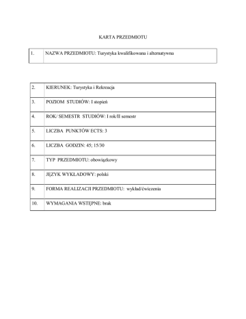 KARTA PRZEDMIOTU 1. NAZWA PRZEDMIOTU: Turystyka kwalifikowana i alternatywna 2. KIERUNEK: Turystyka i Rekreacja 3. POZIOM STUDIÓW: I stopień 4. ROK/ SEMESTR STUDIÓW: I rok/II semestr 5. LICZBA PUNKTÓW ECTS: 3 6. LICZBA GODZIN: 45; 15/30 7. TYP PRZEDMIOTU: obowiązkowy 8. JĘZYK WYKŁADOWY: polski 9. FORMA REALIZACJI PRZEDMIOTU: wykład/ćwiczenia 10. WYMAGANIA WSTĘPNE: brak 11. CELE PRZEDMIOTU: Na tle historii rozwoju turystyki na świecie i w Polsce wprowadzenie i objaśnienie pojęć i koncepcji turystyki kwalifikowanej i alternatywnej. Definicje turystyki kwalifikowanej i alternatywnej. Określenie specyficznych dla turystyki kwalifikowanej i różnych jej dyscyplin, form uprawiania , sposobów wykorzystywania sprzętu. Wyjaśnienie stosowanych zasad bezpieczeństwa. Przedstawienie form zdobywania i potwierdzania kwalifikacji osób uprawiających różne dyscypliny turystyki kwalifikowanej. Relacje pomiędzy turystyką kwalifikowana a turystyką aktywna i ekstremalną. Prezentacja różnych poglądów na temat koncepcji turystyki alternatywnej i różnych form jej uprawiania. 12. PRZEDMIOTOWE EFEKTY KSZTAŁCENIA Odniesienie do kierunkowych efektów kształcenia (symbol) P_W01. Zna i rozumie pojęcia: turystyka kwalifikowana, aktywna, alternatywna i pokrewne. Poznał historię rozwoju różnych dyscyplin turystyki kwalifikowanej i form turystyki alternatywnej. K_W14 P_W02. W zakresie wybranych dyscyplin turystyki kwalifikowanej zna sposoby uprawiania, orientuje się w zakresie wykorzystywanego aktualnie sprzętu, obowiązujących przepisów. K_W18 P_W03. Zna motywy kształtowania różnych form turystyki alternatywnej jako reakcji na dysfunkcje rozwoju turystyki. P_U01. Potrafi profesjonalnie organizować imprezy turystyczne wybranej przez siebie dyscypliny turystyki kwalifikowanej. P_U02. Potrafi stosować zasady bezpieczeństwa w praktyce uprawiania turystyki kwalifikowanej, profesjonalnie korzystać ze sprzętu, posługiwać się właściwą terminologią. K_W12, K_W14 K_U02 K_U02, K_U04 P_U03. Umie skonstruować i ocenić program imprezy turystycznej pod kątem widzenia zasad turystyki alternatywnej. 13. K_U02, K_U03 P_K0 Racjonalnie ocenia kwalifikacje turystyczne własne i innych pod kątem możliwości uczestnictwa w 1. imprezach turystyki kwalifikowanej. K_K04, K_K05 P_K0 W planowaniu i programowaniu imprez turystycznych stosuje prawidła i metody pozwalające uniknąć 2. dysfunkcji zagrażających środowisku społecznemu i przyrodniczemu. K_K03, K_K10 METODY OCENY EFEKTÓW KSZTAŁCENIA Symbol przedmiotowego efektu kształcenia Metody (sposoby) oceny Typ oceny Forma dokumentacji P_W01 egzamin końcowy podsumowująca praca pisemna P_W02 egzamin końcowy podsumowująca praca pisemna P_W03 egzamin końcowy podsumowująca praca pisemna P_U01 egzamin końcowy podsumowująca praca pisemna P_U02 egzamin końcowy podsumowująca praca pisemna P_U03 egzamin końcowy podsumowująca praca pisemna P_K01 egzamin końcowy podsumowująca praca pisemna P_K02 egzamin końcowy podsumowująca praca pisemna 14. KRYTERIA OCENY OSIĄGNIĘTYCH EFEKTÓW KSZTAŁCENIA (opisowe, procentowe, punktowe, inne ……………………………. formy oceny do wyboru przez wykładowcę) Efekty kształcenia NA OCENĘ 3,0 NA OCENĘ 3,5 NA OCENĘ 4.0 NA OCENĘ 4,5 NA OCENĘ 5,0 51-60% 61-70% 71-80% 81-90% 90-100% 51-60% 61-70% 71-80% 81-90% 90-100% 51-60% 61-70% 71-80% 81-90% 90-100% P_U01 51-60% 61-70% 71-80% 81-90% 90-100% P_U02 51-60% 61-70% 71-80% 81-90% 90-100% P_U03 51-60% 61-70% 71-80% 81-90% 90-100% P_K01 51-60% 61-70% 71-80% 81-90% 90-100% P_K02 51-60% 61-70% 71-80% 81-90% 90-100% P_W01 P_W02 P_W03 15. WARUNKI UZYSKANIA ZALICZENIA PRZEDMIOTU: € € € € € € Osiągnięcie założonych efektów kształcenia i pozytywny wynik zaliczenia egzaminu pisemnego egzaminu ustnego egzaminu praktycznego egzaminu końcowego ……………………… 1 TREŚCI PROGRAMOWE 6. Forma zajęć (liczba godz.) Symbol przedmiotowych efektów kształcenia Treść zajęć Wykłady 1. Organizacja turystyki kwalifikowanej i alternatywnej w Polsce i na świecie. wykłady (2) P_W01, P_K01 2. Wychowawczo-społeczne i zdrowotne funkcje turystyki kwalifikowanej. wykłady (1) P_U01 3. Związki turystyki kwalifikowanej, alternatywnej i krajoznawstwa. wykłady (1) P_W01, 4. Znaczenie turystyki kwalifikowanej i alternatywnej w realizacji celów współczesnego krajoznawstwa. wykłady (1) P_W01, 5. Działalność organizacji społecznych w rozwoju turystyki kwalifikowanej. wykłady (1) P_W01 6 Turystyka kwalifikowana w szkole i rodzinie. wykłady (1) P_W01, Turystyka kwalifikowana jako sektor działalności 7. gospodarczej. uwarunkowania makroekonomiczne – rola zmian systemowych. wykłady (1) P_W01, Kierunki rozwoju turystyki kwalifikowanej w Polsce i na świecie. wykłady (2) P_W01, 9 Promocja turystyki kwalifikowanej. wykłady (1) P_W01, 1 Przyczyny występowania wypadków. zapobieganie 0 nieszczęśliwym wypadkom w turystyce kwalifikowanej. wykłady (1) P_U01, P_U02, P_U03, P_K01 1 Odznaki turystyki kwalifikowanej zasady zdobywania i 1 przyznawania. wykłady (1) P_W01, 8 1 Podsumowanie zajęć i zaliczenie semestru. 2 wykłady (1) Ćwiczenia Turystyka kwalifikowana, aktywna i alternatywna w 1. całokształcie zagadnień ruchu turystycznego - o wieloznaczności pojęć. ćwiczenia (1) P_W01, P_W03, Turystyka masowa a turystyka alternatywna, turystyka 2. aktywna i specjalistyczna, turystyka kwalifikowana przegląd definicji. ćwiczenia (1) P_W01, P_W03, ćwiczenia (1) P_W01, P_W03, 4. Zagadnienia plenerowej rekreacji przygodowej. ćwiczenia (1) P_W02, P_U03. Programowanie bloków tematycznych turystyki przygodowej. ćwiczenia (1) P_U01 ćwiczenia (1) P_W01, P_U01, P_U02, P_K01 Turystyka kajakowa – rys historyczny, sprzęt, zasady i 7. formy uprawiania. ćwiczenia (1) P_W01, P_U01, P_U02, P_K01 Turystyka rowerowa – rys historyczny, sprzęt, zasady i 8. formy uprawiania. ćwiczenia (1) P_W01, P_U01, P_U02, P_K01 ćwicze
