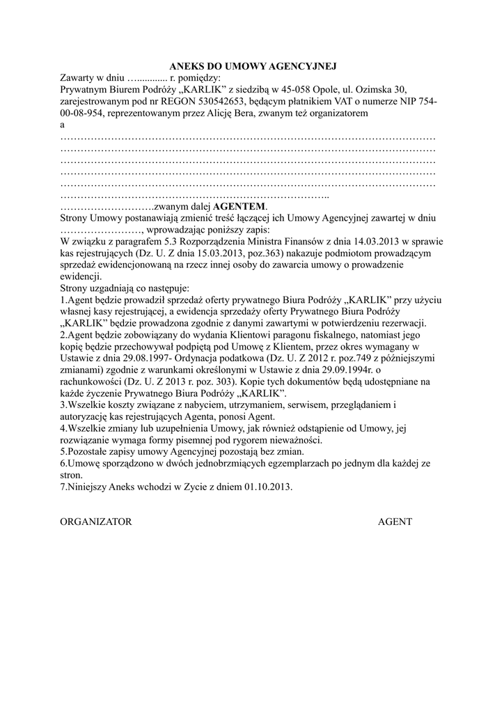 ANEKS DO UMOWY AGENCYJNEJ Zawarty w dniu …............ r. pomiędzy: Prywatnym Biurem Podróży „KARLIK” z siedzibą w 45-058 Opole, ul. Ozimska 30, zarejestrowanym pod nr REGON 530542653, będącym płatnikiem VAT o numerze NIP 75400-08-954, reprezentowanym przez Alicję Bera, zwanym też organizatorem a ………………………………………………………………………………………………… ………………………………………………………………………………………………… ………………………………………………………………………………………………… ………………………………………………………………………………………………… ………………………………………………………………………………………………… …………………………………………………………………….. ……………………….zwanym dalej AGENTEM. Strony Umowy postanawiają zmienić treść łączącej ich Umowy Agencyjnej zawartej w dniu ……………………, wprowadzając poniższy zapis: W związku z paragrafem 5.3 Rozporządzenia Ministra Finansów z dnia 14.03.2013 w sprawie kas rejestrujących (Dz. U. Z dnia 15.03.2013, poz.363) nakazuje podmiotom prowadzącym sprzedaż ewidencjonowaną na rzecz innej osoby do zawarcia umowy o prowadzenie ewidencji. Strony uzgadniają co następuje: 1.Agent będzie prowadził sprzedaż oferty prywatnego Biura Podróży „KARLIK” przy użyciu własnej kasy rejestrującej, a ewidencja sprzedaży oferty Prywatnego Biura Podróży „KARLIK” będzie prowadzona zgodnie z danymi zawartymi w potwierdzeniu rezerwacji. 2.Agent będzie zobowiązany do wydania Klientowi paragonu fiskalnego, natomiast jego kopię będzie przechowywał podpiętą pod Umowę z Klientem, przez okres wymagany w Ustawie z dnia 29.08.1997- Ordynacja podatkowa (Dz. U. Z 2012 r. poz.749 z późniejszymi zmianami) zgodnie z warunkami określonymi w Ustawie z dnia 29.09.1994r. o rachunkowości (Dz. U. Z 2013 r. poz. 303). Kopie tych dokumentów będą udostępniane na każde życzenie Prywatnego Biura Podróży „KARLIK”. 3.Wszelkie koszty związane z nabyciem, utrzymaniem, serwisem, przeglądaniem i autoryzację kas rejestrujących Agenta, ponosi Agent. 4.Wszelkie zmiany lub uzupełnienia Umowy, jak również odstąpienie od Umowy, jej rozwiązanie wymaga formy pisemnej pod rygorem nieważności. 5.Pozostałe zapisy umowy Agencyjnej pozostają bez zmian. 6.Umowę sporządzono w dwóch jednobrzmiących egzemplarzach po jednym dla każdej ze stron. 7.Niniejszy Aneks wchodzi w Zycie z dniem 01.10.2013. ORGANIZATOR AGENT