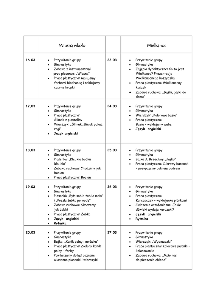 Wiosna wkoło 16.03 Przywitanie grupy Gimnastyka Zabawa z instrumentami przy piosence: „Wiosna” Praca plastyczna: Malujemy farbami biedronkę i naklejamy czarne kropki Wielkanoc 23.03 Przywitanie grupy Gimnastyka Zajęcia dydaktyczne: Co to jest Wielkanoc? Prezentacja Wielkanocnego koszyczka Praca plastyczna: Wielkanocny koszyk Zabawa ruchowa: „Gąski, gąski do domu” 17.03 Przywitanie grupy Gimnastyka Praca plastyczna: Ślimak z plasteliny Wierszyk: „Ślimak, ślimak pokaż rogi” Język angielski 24.03 Przywitanie grupy Gimnastyka Wierszyk: „Kolorowe bazie” Praca plastyczna: Bazie – wyklejamy watą Język angielski 18.03 Przywitanie grupy Gimnastyka Piosenka: „Kle, kle boćku kle, kle” Zabawa ruchowa: Chodzimy jak bocian Praca plastyczna: Bocian 25.03 Przywitanie grupy Gimnastyka Bajka J. Brzechwy „Jajko” Praca plastyczna: Cukrowy baranek – posypujemy cukrem pudrem 19.03 Przywitanie grupy Gimnastyka Piosenki: „Była sobie żabka mała” i „Poszła żabka po wodę” Zabawa ruchowa: Skaczemy jak żabki Praca plastyczna: Żabka Język angielski Rytmika 26.03 Przywitanie grupy Gimnastyka Praca plastyczna: Kurczaczek – wyklejanka piórkami Ćwiczenia ortofoniczne: Jakie dźwięki wydają kurczaki? Język angielski Rytmika 20.03 Przywitanie grupy Gimnastyka Bajka: „Konik polny i mrówka” Praca plastyczna: Zielony konik polny – farby Powtarzamy dotąd poznane wiosenne piosenki i wierszyki 27.03 Przywitanie grupy Gimnastyka Wierszyk: „Wydmuszki” Praca plastyczna: Kolorowe pisanki – kolorowanka Zabawa ruchowa: „Mało nas do pieczenia chleba”