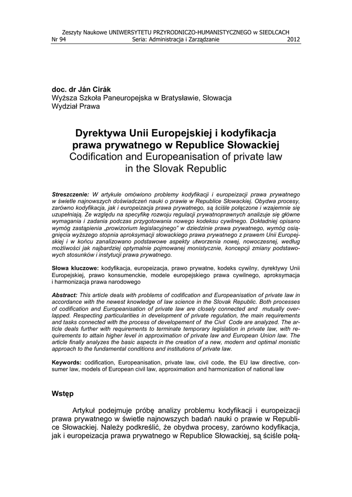 Zeszyty Naukowe UNIWERSYTETU PRZYRODNICZO-HUMANISTYCZNEGO w SIEDLCACH Nr 94 Seria: Administracja i Zarządzanie 2012 doc. dr Ján Cirák Wyższa Szkoła Paneuropejska w Bratysławie, Słowacja Wydział Prawa Dyrektywa Unii Europejskiej i kodyfikacja prawa prywatnego w Republice Słowackiej Codification and Europeanisation of private law in the Slovak Republic Streszczenie: W artykule omówiono problemy kodyfikacji i europeizacji prawa prywatnego w świetle najnowszych doświadczeń nauki o prawie w Republice Słowackiej. Obydwa procesy, zarówno kodyfikacja, jak i europeizacja prawa prywatnego, są ściśle połączone i wzajemnie się uzupełniają. Ze względu na specyfikę rozwoju regulacji prywatnoprawnych analizuje się główne wymagania i zadania podczas przygotowania nowego kodeksu cywilnego. Dokładniej opisano wymóg zastąpienia „prowizorium legislacyjnego” w dziedzinie prawa prywatnego, wymóg osiągnięcia wyższego stopnia aproksymacji słowackiego prawa prywatnego z prawem Unii Europejskiej i w końcu zanalizowano podstawowe aspekty utworzenia nowej, nowoczesnej, według możliwości jak najbardziej optymalnie pojmowanej monistycznie, koncepcji zmiany podstawowych stosunków i instytucji prawa prywatnego. Słowa kluczowe: kodyfikacja, europeizacja, prawo prywatne, kodeks cywilny, dyrektywy Unii Europejskiej, prawo konsumenckie, modele europejskiego prawa cywilnego, aproksymacja i harmonizacja prawa narodowego Abstract: This article deals with problems of codification and Europeanisation of private law in accordance with the newest knowledge of law science in the Slovak Republic. Both processes of codification and Europeanisation of private law are closely connected and mutually overlapped. Respecting particularities in development of private regulation, the main requirements and tasks connected with the process of developement of the Civil Code are analyzed. The article deals further with requirements to terminate temporary legislation in private law, with requirements to attain higher level in approximation of private law and European Union law. The article finally analyzes the basic aspects in the creation of a new, modern and optimal monistic approach to the fundamental conditions and institutions of private law. Keywords: codification, Europeanisation, private law, civil code, the EU law directive, consumer law, models of European civil law, approximation and harmonization of national law Wstęp Artykuł podejmuje próbę analizy problemu kodyfikacji i europeizacji prawa prywatnego w świetle najnowszych badań nauki o prawie w Republice Słowackiej. Należy podkreślić, że obydwa procesy, zarówno kodyfikacja, jak i europeizacja prawa prywatnego w Republice Słowackiej, są ściśle połą- 46 J. Cirák czone i wzajemnie uzupełniają się. Ze względu na specyfikę rozwoju regulacji prywatnoprawnej na Słowacji obydwa wspomniane procesy znajdują swój wyraz w poszczególnych przepisach ustawowych prawa prywatnego. Na pierwszym planie słowackiej cywilistyki znajduje się już od kilku lat utworzenie nowego kodeksu cywilnego. Zadanie wytworzenia nowego kodeksu cywilnego jest sprawą pilną i dlatego poświęciły jej uwagę prawie wszystkie rządy od 1990 roku. Początkowo był to rząd czechosłowacki, a od 1.01.1993 r. już rząd słowacki i, odpowiednio, czeski, które poświęciły tej problematyce szczególną uwagę. Po kilku niepomyślnych próbach dzisiejszy stan przygotowania kodyfikacji można jednak nazwać zaawansowanym stadium przygotowań nowego słowackiego kodeksu cywilnego. 14.01.2009 r. rząd zatwierdził „Plan legislacyjny kodyfikacji prawa prywatnego”, który otworzył nowy etap prac. Według harmonogramu prac legislacyjnych komisji rekodyfikacyjnej ostateczne brzmienie projektu nowego kodeksu ma zostać ustalone w 2014 roku. Potrzeba nowej kodyfikacji prawa prywatnego w Republice Słowackiej (podobnie jak i w Republice Czeskiej) była od początku bardzo silna. W wyniku zmian stosunków społecznych i politycznych w 1991 r. przyjęta została, pod dużą czasową presją, nowelizacja Kodeksu cywilnego z 1964 roku i całkowicie nowy Kodeks handlowy. Tak w pośpiechu utworzony stan prawny – będący reakcją przede wszystkim na absolutną nieprzydatność regulacji prawnych, między innymi pierwotnego Kodeksu cywilnego w nowej sytuacji ustrojowej, był od początku uważany za krótkotrwałe i tymczasowe „prowizorium legislacyjne”. Prowizorium legislacyjne „Prowizorium legislacyjne” powstało w byłej Czechosłowacji w wyniku tego, że dyskontynualność podstawowej regulacji prywatnoprawnej w wyniku wcześniejszego czterdziestoletniego rozwoju nie była konsekwentnie rozwiązywana na początku lat 90. minionego stulecia. Wprawdzie system polegający na cząstkowych nowelizacjach Kodeksu cywilnego z 1964 roku i przyjęciu całkowicie nowego Kodeksu handlowego w 1991 roku na danym etapie rozwoju usunął fundamentalne wady podstawowej regulacji prywatnoprawnej, jednak wprowadził przy tym, z perspektywicznego punktu widzenia, nierównoważny i niewyważony stan, trudno porównywalny z ogólnie stosowanymi standardami zasad kodyfikacji stosunków majątkowych w rozwiniętych krajach kontynentalnej Europy. Od ogólnych nowoczesnych standardów te regulacje odróżnia przede wszystkim stosunek ogólnego prawa prywatnego w nowelizowanym Kodeksie cywilnym z 1964 roku do szczególnego prawa prywatnego, które jest uregulowane przede wszystkim w nowym Kodeksie handlowym. Otóż Kodeks handlowy w Czechach i na Słowacji obejmuje nie tylko typową regulację spółek handlowych i spółdzielni, tzw. stosunków zakładowych czy zamówień publicznych, ale w swojej trzeciej części pod nazwą „Stosunki Handlowe Zobowiązujące” znajduje się szczegółowo koncypowana regulacja kwestii zarówno ogólnej, jak i szczegółowej części zobowiązań. Seria: Administracja i Zarządzanie (21)2012 ZN nr 94 Dyrektywa Unii Europejskiej i kodyfi