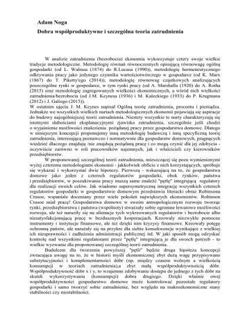 Adam Noga Dobra współproduktywne i szczególna teoria zatrudnienia W analizie zatrudnienia (bezrobocia) ekonomia wykorzystuje cztery swoje wielkie tradycje metodologiczne. Metodologię równań równoczesnych opisującą równowagę ogólną gospodarki (od L. Walrasa (1874) do R.Lucasa (1990)), metodologię hermeneutycznego odkrywania pracy jako jedynego czynnika wartościotwórczego w gospodarce (od K. Marx (1867) do T. Piketty'ego (2014)), metodologię równowag cząstkowych analizujących poszczególne rynki w gospodarce, w tym rynki pracy (od A. Marshalla (1920) do A. Rotha (2015) oraz metodologię zagregowanych wielkości ekonomicznych, a wśród nich wielkości zatrudnienia/bezrobocia (od J.M. Keynesa (1936) i M. Kaleckiego (1933) do P. Krugmana (2012) i J. Galiego (2015)). W ostatnim ujęciu J. M. Keynes napisał Ogólną teorię zatrudnienia, procentu i pieniądza. Jednakże we wszystkich wielkich nurtach metodologicznych ekonomii pojawiają się aspiracje do budowy najogólniejszej teorii zatrudnienia. Niestety wszystkie te nurty charakteryzują się istotnymi słabościami eksplanacyjnymi zjawisko zatrudnienia, szczególnie jeśli chodzi o wyjaśnienie możliwości znalezienia pożądanej pracy przez gospodarstwa domowe. Dlatego w niniejszym koncepcji proponujemy inną metodologię badawczą i inną specyficzną teorię zatrudnienia, interesującą poznawczo i normatywnie dla gospodarstw domowych, pragnących wiedzieć dlaczego znajdują /nie znajdują pożądaną pracę i co mogą czynić dla jej zdobycia oczywiście zarówno w roli pracowników najemnych, jak i właścicieli czy kierowników przedsiębiorstw. W proponowanej szczególnej teorii zatrudnienia, mieszczącej się poza wymienionymi wyżej czterema metodologiami ekonomii - jakkolwiek obficie z nich korzystających, spróbuje się wykazać i wykorzystać dwie hipotezy. Pierwszą - wskazującą na to, że gospodarstwa domowe jako jeden z czterech regulatorów gospodarki, obok rynków, państwa i przedsiębiorstw, w poszukiwaniu pracy muszą same znaleźć "pętlę" integrującą regulatory dla realizacji swoich celów. Jak wiadomo supersymetryczną integrację wszystkich czterech regulatorów gospodarki w gospodarstwie domowym przedstawia literacki obraz Robinsona Crusoe, wspaniale doceniany przez wiele pokoleń największych ekonomistów. Robinson Crusoe miał pracę! Gospodarstwa domowe w swoim antropologicznym rozwoju tworząc rynki, przedsiębiorstwa i państwa (wspólnoty) stwarzały sobie ogromne lewarowe możliwości rozwoju, ale też naraziły się na alienacje tych wykreowanych regulatorów i bezrobocie albo niesatysfakcjonującą pracę w bezdusznych korporacjach. Kreowały niezwykle pomocne instrumenty i instytucje finansowe, ale też dzięki nim kryzysy finansowe. Kreowały potęgę ochronną państw, ale narażały się na przykre dla siebie konsekwencje wynikające z wielkiej ich niesprawności i zadłużenia administracji publicznej itd. W jaki sposób mogą odzyskać kontrolę nad wszystkimi regulatorami przez "pętlę" integrującą je dla swoich potrzeb - to wielkie wyzwanie dla proponowanej szczególnej teorii zatrudnienia. Budulcem dla tworzenia powyższej "pętli" będzie druga hipoteza koncepcji zwracająca uwagę na to, że w historii myśli ekonomicznej zbyt dużą wagę przypisywano substytucyjności i komplementarności dóbr (np. między czasem wolnym a wielkością konsumpcji w teoriach zatrudnienia),a zbyt małą współproduktywnością dóbr. Współproduktywność dóbr x i y, to wzajemne zdobywanie dostępu do jednego z tych dóbr na skutek wykorzystywania (konsumpcji) dobra drugiego. Dzięki właśnie owej współproduktywności gospodarstwo domowe może kontrolować pozostałe regulatory gospodarki i samo tworzyć sobie zatrudnienie, bez względu na makroekonomiczne stany stabilności czy niestabilności.