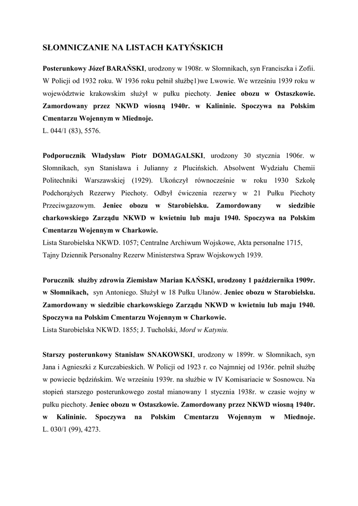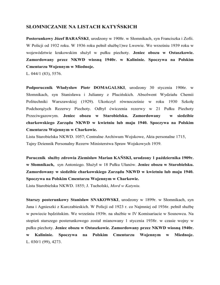 SŁOMNICZANIE NA LISTACH KATYŃSKICH Posterunkowy Józef BARAŃSKI, urodzony w 1908r. w Słomnikach, syn Franciszka i Zofii. W Policji od 1932 roku. W 1936 roku pełnił służbę1)we Lwowie. We wrześniu 1939 roku w województwie krakowskim służył w pułku piechoty. Jeniec obozu w Ostaszkowie. Zamordowany przez NKWD wiosną 1940r. w Kalininie. Spoczywa na Polskim Cmentarzu Wojennym w Miednoje. L. 044/1 (83), 5576. Podporucznik Władysław Piotr DOMAGALSKI, urodzony 30 stycznia 1906r. w Słomnikach, syn Stanisława i Julianny z Plucińskich. Absolwent Wydziału Chemii Politechniki Warszawskiej (1929). Ukończył równocześnie w roku 1930 Szkołę Podchorążych Rezerwy Piechoty. Odbył ćwiczenia rezerwy w 21 Pułku Piechoty Przeciwgazowym. Jeniec obozu w Starobielsku. Zamordowany w siedzibie charkowskiego Zarządu NKWD w kwietniu lub maju 1940. Spoczywa na Polskim Cmentarzu Wojennym w Charkowie. Lista Starobielska NKWD. 1057; Centralne Archiwum Wojskowe, Akta personalne 1715, Tajny Dziennik Personalny Rezerw Ministerstwa Spraw Wojskowych 1939. Porucznik służby zdrowia Ziemisław Marian KAŃSKI, urodzony 1 października 1909r. w Słomnikach, syn Antoniego. Służył w 18 Pułku Ułanów. Jeniec obozu w Starobielsku. Zamordowany w siedzibie charkowskiego Zarządu NKWD w kwietniu lub maju 1940. Spoczywa na Polskim Cmentarzu Wojennym w Charkowie. Lista Starobielska NKWD. 1855; J. Tucholski, Mord w Katyniu. Starszy posterunkowy Stanisław SNAKOWSKI, urodzony w 1899r. w Słomnikach, syn Jana i Agnieszki z Kurczabieskich. W Policji od 1923 r. co Najmniej od 1936r. pełnił służbę w powiecie będzińskim. We wrześniu 1939r. na służbie w IV Komisariacie w Sosnowcu. Na stopień starszego posterunkowego został mianowany 1 stycznia 1938r. w czasie wojny w pułku piechoty. Jeniec obozu w Ostaszkowie. Zamordowany przez NKWD wiosną 1940r. w Kalininie. Spoczywa L. 030/1 (99), 4273. na Polskim Cmentarzu Wojennym w Miednoje.