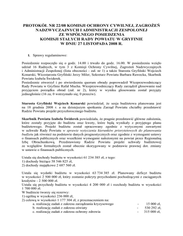 PROTOKÓŁ NR 22/08 KOMISJI OCHRONY CYWILNEJ, ZAGROŻEŃ NADZWYCZAJNYCH I ADMINISTRACJI ZESPOLONEJ ZE WSPÓLNEGO POSIEDZENIA KOMISJI STAŁYCH RADY POWIATU W GRYFINIE W DNIU 27 LISTOPADA 2008 R. I. Sprawy regulaminowe: Posiedzenie rozpoczęło się o godz. 14.00 i trwało do godz. 16.00. W posiedzeniu wzięło udział 16 Radnych, w tym 3 z Komisji Ochrony Cywilnej, Zagrożeń Nadzwyczajnych i Administracji Zespolonej (lista obecności - zał. nr 1) a także Starosta Gryfiński Wojciech Konarski, Wicestarosta Gryfiński Jerzy Miler, Sekretarz Powiatu Barbara Rawecka, Skarbnik Powiatu Izabela Świderek. Posiedzenie otworzył i po stwierdzeniu quorum obrady poprowadził Wiceprzewodniczący Rady Powiatu w Gryfinie Rafał Mucha. Wiceprzewodniczący Rady zarządził głosowanie nad przyjęciem porządku obrad (zał. nr 2), który w wyniku głosowania został przyjęty jednogłośnie (16 za; 0 wstrzymało się; 0 przeciw). Starosta Gryfiński Wojciech Konarski powiedział, że sesja budżetowa planowana jest na 18 grudnia 2008 r. a na dzisiejszym spotkaniu Zarząd Powiatu chciałby przedstawić Radzie Powiatu projekt przyszłorocznego budżetu. Skarbnik Powiatu Izabela Świderek powiedziała, że pragnie przedstawić główne założenia, które zostały przyjęte do budżetu oraz kwoty, które będą wynikały z przyjętego planu budżetowego. Projekt budżetu został opracowany zgodnie z wytycznymi zawartymi w uchwale Rady Powiatu w sprawie wytyczenia kierunków priorytetowych do planowania budżetu jak również na podstawie danych prognostycznych oraz zgodnie z wymogami ustawy o finansach publicznych oraz wszelkimi wymogami nałożonymi na powiat przez Regionalną Izbę Obrachunkową. Przedstawiony Radzie Powiatu projekt uchwały budżetowej ze względów formalnych został obecnie skorygowany w podstawie prawnej dot. zmiany w ustawie o finansach publicznych. Ustala się dochody budżetu w wysokości 61 234 385 zł, z tego: 1) dochody bieżące 58 546 825 zł, 2) dochody majątkowe 2 687 560 zł. Ustala się wydatki budżetu w wysokości 63 734 385 zł. Planowany deficyt budżetu w wysokości 2 500 000 zł, który zostanie pokryty przychodami pochodzącymi z zaciąganych kredytów - 2 500 000 zł. Ustala się przychody budżetu w wysokości 4 200 000 zł i rozchody budżetu w wysokości 1 700 000 zł. W budżecie tworzy się rezerwy: 1) ogólną w wysokości 236 000 zł, 2) celową w wysokości 1 177 304 zł, z przeznaczeniem na: a. realizację zadań z zakresu zarządzania kryzysowego 15 000 zł, b. realizację zadań z zakresu oświaty 530 292 zł, c. realizację zadań z zakresu ochrony zdrowia - 315 000 zł, d. realizację zadań z zakresu pomocy społecznej e. realizację zadań z zakresu edukacyjnej opieki wychowawczej - 80 000 zł, 237 012 zł. Rezerwy celowe w wysokości 530 292 zł oraz 237 012 zł zostały zaplanowane na przewidywane w przyszłym roku podwyżki dla nauczycieli oraz na odprawy emerytalne. Ustala się limity wydatków na wieloletnie programy inwestycyjne w latach 2009-2011 w wysokości 10 935 000,00 zł. Ustala się przychody i wydatki Powiatowego Funduszu Ochrony Środowiska i Gospodarki Wodnej w wysokości: 1) przychody - 2 497 000 zł, 2) wydatki - 2 433 500 zł. Ustala się przychody i wydatki Powiatowego Funduszu Gospodarki Zasobem Geodezyjnym i Kartograficznym w wysokości: 1) przychody - 1 400 000 zł, 2) wydatki - 1 350 000 zł. Ustala się limity zobowiązań z tytułu emisji papierów wartościowych i pożyczek zaciąganych na: 1) finansowanie przejściowego deficytu budżetu, do kwoty 2) finansowanie planowanego deficytu budżetu, do kwoty 3) spłatę wcześniej zaciągniętych zobowiązań z tytułu emisji papierów oraz zaciągniętych pożyczek i kredytów, do kwoty oraz kredytów - 3 000 000 zł, - 2 500 000 zł, wartościowych - 1 700 000 zł. Upoważnia się Zarząd do zaciągania zobowiązań: 1) na finansowanie wydatków na wieloletnie programy inwestycyjne w latach 2009-2011, 2) z tytułu umów, których realizacja w roku następnym jest niezbędna dla zapewnienia ciągłości działania jednostki i termin zapłaty upływa w roku następnym. Ustala się dotacje: 1) dla jednostek sektora finansów publicznych: a. podmiotowe w wysokości - 2 759 186 zł, b. celowe na zadania własne w wysokości - 1 353 694 zł, 2) dla jednostek spoza sektora finansów publicznych, celowe na zadania własne w wysokości 3 219 172 zł. Dochody i wydatki związane z realizacją zadań z zakresu administracji rządowej: 1) zleconych odrębnymi ustawami, zgodnie z załącznikiem nr 10, 2) wykonywanych na podstawie porozumień z organami administracji rządowej, zgodnie z załącznikiem nr 11, 2. Dochody i wydatki związane z realizacją zadań wykonywanych na podstawie porozumień (umów) między jednostkami samorządu terytorialnego, zgodnie z załącznikiem nr 12. Upoważnia się Zarząd do: 1) zaciągania kredytów i pożyczek oraz emisji papierów wartościowych na pokrycie występującego w ciągu roku budżetowego deficytu budżetu jednostki samorządu terytorialnego, 2 2) dokonywania zmian w planie wydatków budżetowych, z wyłączeniem przeniesień wydatków między działami, 3) przekazania niektórych uprawnień do dokonywania przeniesień planowanych wydatków innym jednostkom organizacyjnym powiatu, 4) przekazania uprawnień innym jednostkom do zaciągania zobowiązań z tytułu umów, których realizacja w roku następnym jest niezbędna dla zapewnienia ciągłości działania jednostki i termin zapłaty upływa w roku następnym, 5) udzielania w roku budżetowym pożyczek do kwoty 250 000 zł, 6) udzielania w roku budżetowym poręczeń i gwarancji do kwoty - 250 000 zł, 7) lokowania wolnych środków budżetowych na rachunkach bankowych w innych bankach niż bank prowadzący obsługę budżetu powiatu. Zaliczki na wydatki do rozliczenia mogą być udzielane pracownikom jednostek budżetowych Powiatu Gryfińskiego do kwoty, jednorazowo nieprzekraczające