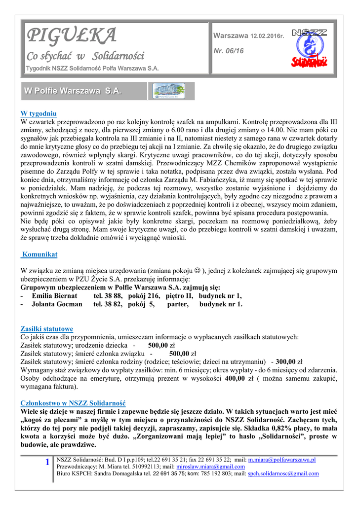 PIGUŁKA Co słychać w Solidarności Warszawa 12.02.2016r. Nr. 06/16 Tygodnik NSZZ Solidarność Polfa Warszawa S.A. W Polfie Warszawa S.A. W tygodniu W czwartek przeprowadzono po raz kolejny kontrolę szafek na ampułkarni. Kontrolę przeprowadzona dla III zmiany, schodzącej z nocy, dla pierwszej zmiany o 6.00 rano i dla drugiej zmiany o 14.00. Nie mam póki co sygnałów jak przebiegała kontrola na III zmianie i na II, natomiast niestety z samego rana w czwartek dotarły do mnie krytyczne głosy co do przebiegu tej akcji na I zmianie. Za chwilę się okazało, że do drugiego związku zawodowego, również wpłynęły skargi. Krytyczne uwagi pracowników, co do tej akcji, dotyczyły sposobu przeprowadzenia kontroli w szatni damskiej. Przewodniczący MZZ Chemików zaproponował wystąpienie pisemne do Zarządu Polfy w tej sprawie i taka notatka, podpisana przez dwa związki, została wysłana. Pod koniec dnia, otrzymaliśmy informację od członka Zarządu M. Fabiańczyka, iż mamy się spotkać w tej sprawie w poniedziałek. Mam nadzieję, że podczas tej rozmowy, wszystko zostanie wyjaśnione i dojdziemy do konkretnych wniosków np. wyjaśnienia, czy działania kontrolujących, były zgodne czy niezgodne z prawem a najważniejsze, to uważam, że po doświadczeniach z poprzedniej kontroli i z obecnej, wszyscy moim zdaniem, powinni zgodzić się z faktem, że w sprawie kontroli szafek, powinna być spisana procedura postępowania. Nie będę póki co opisywał jakie były konkretne skargi, poczekam na rozmowę poniedziałkową, żeby wysłuchać drugą stronę. Mam swoje krytyczne uwagi, co do przebiegu kontroli w szatni damskiej i uważam, że sprawę trzeba dokładnie omówić i wyciągnąć wnioski. Komunikat W związku ze zmianą miejsca urzędowania (zmiana pokoju ), jednej z koleżanek zajmującej się grupowym ubezpieczeniem w PZU Życie S.A. przekazuję informację: Grupowym ubezpieczeniem w Polfie Warszawa S.A. zajmują się: - Emilia Biernat tel. 38 88, pokój 216, piętro II, budynek nr 1, - Jolanta Gocman tel. 38 82, pokój 5, parter, budynek nr 1. Zasiłki statutowe Co jakiś czas dla przypomnienia, umieszczam informacje o wypłacanych zasiłkach statutowych: Zasiłek statutowy; urodzenie dziecka 500,00 zł Zasiłek statutowy; śmierć członka związku 500,00 zł Zasiłek statutowy; śmierć członka rodziny (rodzice; teściowie; dzieci na utrzymaniu) - 300,00 zł Wymagany staż związkowy do wypłaty zasiłków: min. 6 miesięcy; okres wypłaty - do 6 miesięcy od zdarzenia. Osoby odchodzące na emeryturę, otrzymują prezent w wysokości 400,00 zł ( można samemu zakupić, wymagana faktura). Członkostwo w NSZZ Solidarność Wiele się dzieje w naszej firmie i zapewne będzie się jeszcze działo. W takich sytuacjach warto jest mieć „kogoś za plecami” a myślę w tym miejscu o przynależności do NSZZ Solidarność. Zachęcam tych, którzy do tej pory nie podjęli takiej decyzji, zapraszamy, zapisujcie się. Składka 0,82% płacy, to mała kwota a korzyści może być dużo. „Zorganizowani mają lepiej” to hasło „Solidarności”, proste w budowie, ale prawdziwe. 1 NSZZ Solidarność: Bud. D I p.p109; tel.22 691 35 21; fax 22 691 35 22; mail: [email protected] Przewodniczący: M. Miara tel. 510992113; mail: [email protected] Biuro KSPCH: Sandra Domagalska tel. 22 691 35 75; kom: 785 192 803; mail: [email protected] U właściciela ; W farmacji Uwaga! Plaga fałszywych leków! Fakt Zalewają nas fałszywe leki. – Według światowych danych w Europie skala problemu szacowana jest na około 1 proc. rynku leków – mówi farmaceuta, prof. Zbigniew Fijałek, który od 10 lat bada problem fałszywych leków w Polsce i Europie. To oznacza tysiące opakowań lekarstw, których efekty działania i wpływ na nasze zdrowie trudno przewidzieć. Skąd biorą się na rynku? Fałszywe produkty lecznicze produkowane są głównie na wschodzie. Prym wiodą Chiny i Indie. Stamtąd w kontenerach miliony podrobionych opakowań wędrują między innymi do Europy. Po drodze mijają wiele portów, by zyskać na wiarygodności. Po długiej podróży docierają na lotniska czy do portów we Francji, Wielkiej Brytanii, Niemczech albo Szwajcarii, gdzie są zgłaszane jako niegroźne towary. – Fałszywe leki są też przesyłane bezpośrednio z Chin i Indii w małych paczkach, pakowane po kilkaset sztuk – dodaje prof. Fijałek. Oferowane są przede wszystkim w internecie, ale można kupić fałszywki i w realnym świecie. Zwłaszcza podczas wyjazdów do egzotycznych krajów, czy na wschodzie, gdzie za kilkakrotnie niższą cenę dostaniemy leki łudząco podobne do tych, które przyjmujemy na co dzień. Mają nazwy, opakowania i wygląd jak oryginalne leki czołowych producentów. Efekt kuracji może być jednak zabójczy. Podrabianie medykamentów to bardzo dochodowy biznes. Dlatego interesuje się nim zwłaszcza przestępczość zorganizowana i terroryści, którzy między innymi ze sprzedaży fałszywych leków finansują swoje działania. Podrabiane jest wszystko, co się opłaca. A opłaca się to, czego sprzedaje się najwięcej lub najdrożej, a więc antybiotyki, sterydy, leki przeciwastmatyczne czy przeciwalergiczne, leki na nadciśnienie, przeciwzapalne i przeciwbólowe, lekarstwa obniżające poziom cholesterolu, a także nowoczesne leki stosowane w leczeniu AIDS czy nowotworów. Jak się bronić przed zagrożeniem? Jedyny sposób to kupowanie leków w legalnych miejscach. – Dopóki będziemy kupować farmaceutyki w nielegalnym miejscu, dopóty znajdą się osoby, które będą je fałszować – podkreśla prof. Fijałek. Przeczytajcie, jak rozpoznać trefne medykamenty, co zrobić, gdy lek okazuje się podróbką oraz czym grozi zażywanie fałszywych lekarstw. Tak trujesz się fałszywkami Ta sama substancja czynna, która w odpowiedniej dawce i przyjęta z odpowiednich wskazań leczy, w innej może zagrażać zdrowiu, a nawet życiu pacjenta. Groźne dla zd