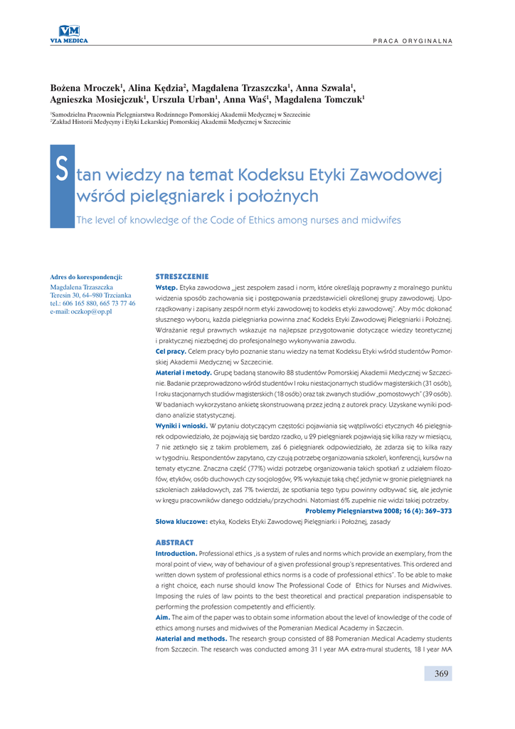 PRACA ORYGINALNA Bożena Mroczek1, Alina Kędzia2, Magdalena Trzaszczka1, Anna Szwala1, Agnieszka Mosiejczuk1, Urszula Urban1, Anna Waś1, Magdalena Tomczuk1 1 2 Samodzielna Pracownia Pielęgniarstwa Rodzinnego Pomorskiej Akademii Medycznej w Szczecinie Zakład Historii Medycyny i Etyki Lekarskiej Pomorskiej Akademii Medycznej w Szczecinie S tan wiedzy na temat Kodeksu Etyki Zawodowej wśród pielęgniarek i położnych The level of knowledge of the Code of Ethics among nurses and midwifes Adres do korespondencji: STRESZCZENIE Magdalena Trzaszczka Teresin 30, 64–980 Trzcianka tel.: 606 165 880, 665 73 77 46 e-mail: [email protected] Wstęp. Etyka zawodowa ,,jest zespołem zasad i norm, które określają poprawny z moralnego punktu widzenia sposób zachowania się i postępowania przedstawicieli określonej grupy zawodowej. Uporządkowany i zapisany zespół norm etyki zawodowej to kodeks etyki zawodowej”. Aby móc dokonać słusznego wyboru, każda pielęgniarka powinna znać Kodeks Etyki Zawodowej Pielęgniarki i Położnej. Wdrażanie reguł prawnych wskazuje na najlepsze przygotowanie dotyczące wiedzy teoretycznej i praktycznej niezbędnej do profesjonalnego wykonywania zawodu. Cel pracy. Celem pracy było poznanie stanu wiedzy na temat Kodeksu Etyki wśród studentów Pomorskiej Akademii Medycznej w Szczecinie. Materiał i metody. Grupę badaną stanowiło 88 studentów Pomorskiej Akademii Medycznej w Szczecinie. Badanie przeprowadzono wśród studentów I roku niestacjonarnych studiów magisterskich (31 osób), I roku stacjonarnych studiów magisterskich (18 osób) oraz tak zwanych studiów „pomostowych” (39 osób). W badaniach wykorzystano ankietę skonstruowaną przez jedną z autorek pracy. Uzyskane wyniki poddano analizie statystycznej. Wyniki i wnioski. W pytaniu dotyczącym częstości pojawiania się wątpliwości etycznych 46 pielęgniarek odpowiedziało, że pojawiają się bardzo rzadko, u 29 pielęgniarek pojawiają się kilka razy w miesiącu, 7 nie zetknęło się z takim problemem, zaś 6 pielęgniarek odpowiedziało, że zdarza się to kilka razy w tygodniu. Respondentów zapytano, czy czują potrzebę organizowania szkoleń, konferencji, kursów na tematy etyczne. Znaczna część (77%) widzi potrzebę organizowania takich spotkań z udziałem filozofów, etyków, osób duchowych czy socjologów, 9% wykazuje taką chęć jedynie w gronie pielęgniarek na szkoleniach zakładowych, zaś 7% twierdzi, że spotkania tego typu powinny odbywać się, ale jedynie w kręgu pracowników danego oddziału/przychodni. Natomiast 6% zupełnie nie widzi takiej potrzeby. Problemy Pielęgniarstwa 2008; 16 (4): 369–373 Słowa kluczowe: etyka, Kodeks Etyki Zawodowej Pielęgniarki i Położnej, zasady ABSTRACT Introduction. Professional ethics „is a system of rules and norms which provide an exemplary, from the moral point of view, way of behaviour of a given professional group’s representatives. This ordered and written down system of professional ethics norms is a code of professional ethics”. To be able to make a right choice, each nurse should know The Professional Code of Ethics for Nurses and Midwives. Imposing the rules of law points to the best theoretical and practical preparation indispensable to performing the profession competently and efficiently. Aim. The aim of the paper was to obtain some information about the level of knowledge of the code of ethics among nurses and midwives of the Pomeranian Medical Academy in Szczecin. Material and methods. The research group consisted of 88 Pomeranian Medical Academy students from Szczecin. The research was conducted among 31 I year MA extra-mural students, 18 I year MA 369 PROBLEMY PIELĘGNIARSTWA 2008, tom 16, zeszyt nr 4 daily students and among 39 complementary studies students. A questionnaire designed by one of the authors of the paper was filled in. The obtained results from the questionnaire were used in the statistical analysis. Results and conclusions. In the question about the frequency of feeling ethical doubts, 46 nurses said they had them very rarely, 29 nurses felt them a few times a month, 7 nurses did not have them and 6 nurses claimed they voiced ethical doubts a few times a week. The respondents were also asked if they had a need of organizing workshops, conferences or courses on ethical aspects. A huge majority of them (77%) said they had a need of organizing such workshops with philosophers, ethicists, priests or sociologists. Next, 9% of respondents had that need only in nurses« circles during hospital workshops and 7% thought that these workshops should be organized only in the circle of medical department workers or clinic ones. Finally, 6% of students admitted they did not have such a need at all. Nursing Topics 2008; 16 (4): 369–373 Key words: ethics, The Professional Code of Ethics for Nurses and Midwives, rules Wstęp Dynamiczny rozwój nauk przyrodniczych wiąże się z występowaniem różnorodnych problemów. Formułowanie zasad postępowania, wykorzystywanie najnowszych osiągnięć przyczynia się do świadczenia profesjonalnych usług medycznych. Pielęgniarstwo to zawód bardzo szczególny. Z jego istoty wynika, że jest nierozerwalnie połączony z etyką, gdyż zasady moralne kształtują podstawy tego zawodu. Etyka zawodowa ,,jest zespołem zasad i norm, które określają poprawny z moralnego punktu widzenia sposób zachowania się i postępowania przedstawicieli określonej grupy zawodowej. Uporządkowany i zapisany zespół norm etyki zawodowej to kodeks etyki zawodowej” [1]. Podczas wykonywania różnorodnych czynności zawodowych każda pielęgniarka swoje postępowanie rozpatruje zarówno w aspekcie organizacyjno-technicznym, jak i etycznym [2]. Jako podstawową zasadę etyczną uznano tę, która wskazuje, że człowiek powinien postępować tak, jak sam chciałby, aby inni postępowali wobec niego. Już Florencja Nightingale, uznana za twórczynię pielęgniarstwa, z