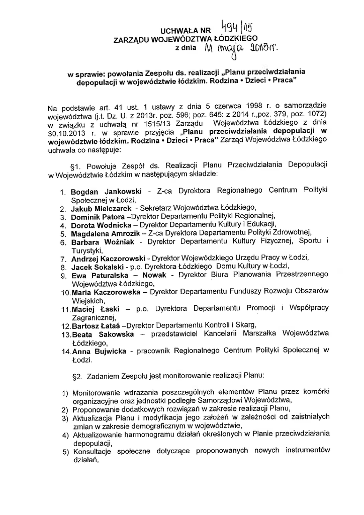 Uchwała Nr 494/15 Zarządu Województwa Łódzkiego