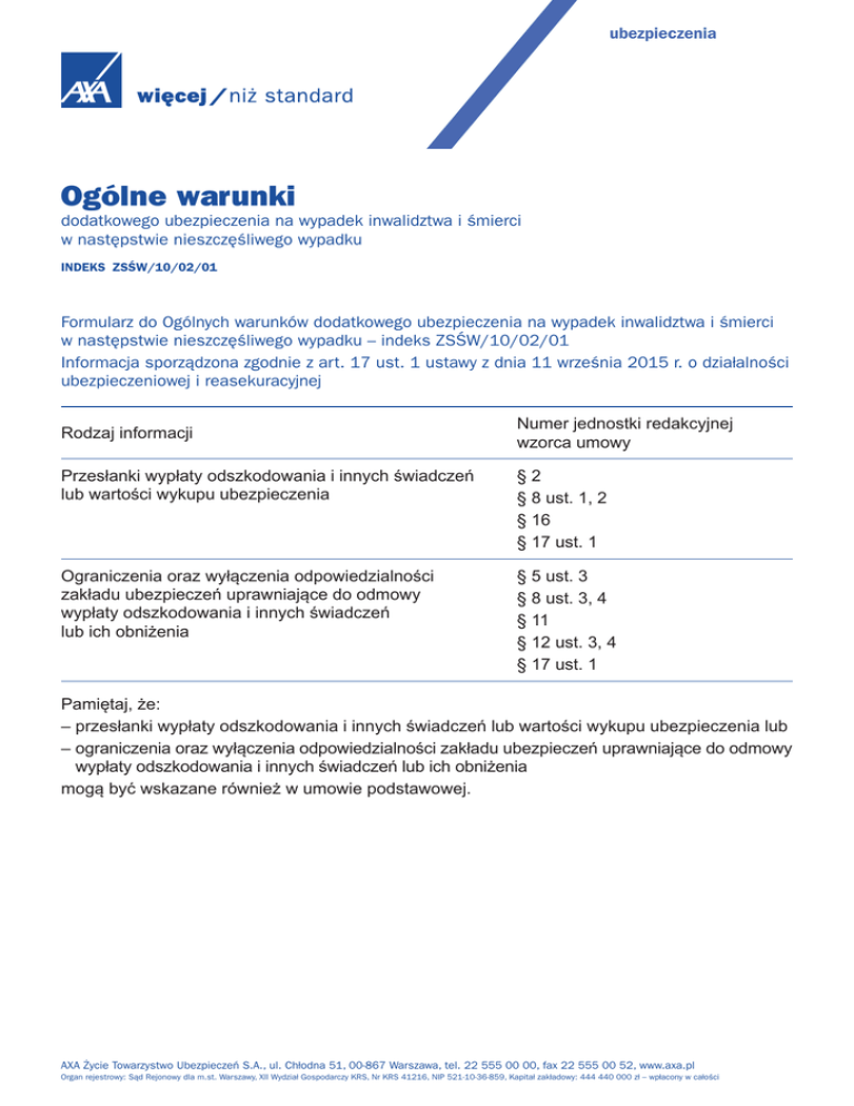 ubezpieczenia Ogólne warunki dodatkowego ubezpieczenia na wypadek inwalidztwa i śmierci w następstwie nieszczęśliwego wypadku INDEKS ZSŚW/10/02/01 Formularz do Ogólnych warunków dodatkowego ubezpieczenia na wypadek inwalidztwa i śmierci w następstwie nieszczęśliwego wypadku – indeks ZSŚW/10/02/01 Informacja sporządzona zgodnie z art. 17 ust. 1 ustawy z dnia 11 września 2015 r. o działalności ubezpieczeniowej i reasekuracyjnej Rodzaj informacji Numer jednostki redakcyjnej wzorca umowy Przesłanki wypłaty odszkodowania i innych świadczeń lub wartości wykupu ubezpieczenia §2 § 8 ust. 1, 2 § 16 § 17 ust. 1 Ograniczenia oraz wyłączenia odpowiedzialności zakładu ubezpieczeń uprawniające do odmowy wypłaty odszkodowania i innych świadczeń lub ich obniżenia § 5 ust. 3 § 8 ust. 3, 4 § 11 § 12 ust. 3, 4 § 17 ust. 1 Pamiętaj, że: – przesłanki wypłaty odszkodowania i innych świadczeń lub wartości wykupu ubezpieczenia lub – ograniczenia oraz wyłączenia odpowiedzialności zakładu ubezpieczeń uprawniające do odmowy wypłaty odszkodowania i innych świadczeń lub ich obniżenia mogą być wskazane również w umowie podstawowej. AXA Życie Towarzystwo Ubezpieczeń S.A., ul. Chłodna 51, 00-867 Warszawa, tel. 22 555 00 00, fax 22 555 00 52, www.axa.pl Organ rejestrowy: Sąd Rejonowy dla m.st. Warszawy, XII Wydział Gospodarczy KRS, Nr KRS 41216, NIP 521-10-36-859, Kapitał zakładowy: 444 440 000 zł – wpłacony w całości Ogólne warunki dodatkowego ubezpieczenia na wypadek inwalidztwa i śmierci w następstwie nieszczęśliwego wypadku INDEKS ZSŚW/10/02/01 I. TWOJE UBEZPIECZENIE Ogólne warunki dodatkowego ubezpieczenia na wypadek inwalidztwa i śmierci w następstwie nieszczęśliwego wypadku (OWUD) Co to dla Ciebie oznacza? Kto może zostać ubezpieczony w ramach umowy dodatkowej? Ubezpieczenie przeznaczone jest dla osób pomiędzy 13. a 61. rokiem życia. Pamiętaj, że Twój wiek w ramach umowy dodatkowej jest równy wiekowi ustalonemu na zasadach określonych w umowie podstawowej. W związku z tym, jest on liczony na dzień podpisania wniosku o zawarcie umowy podstawowej jako liczba ukończonych przez Ciebie pełnych lat życia. W każdą rocznicę polisy wartość ta zwiększana jest o jeden. §1 1. Ubezpieczonym w rozumieniu niniejszych OWUD może być wyłącznie Ubezpieczony w rozumieniu OWU, który w dniu podpisania wniosku o zawarcie umowy dodatkowej spełnia łącznie następujące warunki: 1) ma ukończony 13. rok życia; 2) nie ukończył 61. roku życia. 2. Na potrzeby OWUD wiek Ubezpieczonego jest równy wiekowi ustalonemu na zasadach określonych w OWU. Przykład: Wniosek o zawarcie umowy podstawowej został podpisany 10 marca 2010 r. Jako Ubezpieczony została w nim wskazana osoba urodzona 26 marca 1980 r. Osoba ta miała na dzień podpisania wniosku 29 lat. Umowa ubezpieczenia została zawarta 1 kwietnia 2010 r. Pomimo faktu, że zgodnie z kalendarzem osoba wskazana w przykładzie kończy 30 lat w marcu, dla celów umowy podstawowej i umowy dodatkowej (nawet w przypadku gdy umowa dodatkowa została zawarta w terminie późniejszym) skończy ona 30 lat dopiero w pierwszą rocznicę polisy, tj. 1 kwietnia 2011 r., 31 lat – 1 kwietnia 2012 r. etc. Co AXA ubezpiecza i za co odpowiada? Ubezpieczenie to ma na celu wesprzeć Cię finansowo, jeżeli na skutek nieszczęśliwego wypadku utracisz w poważnym stopniu sprawność organizmu. Jeśli ulegniesz śmiertelnemu wypadkowi, wesprzemy finansowo Twoich najbliższych. Nieszczęśliwy wypadek musi mieć miejsce w okresie udzielania ochrony ubezpieczeniowej z umowy dodatkowej. §2 1. Przedmiotem ubezpieczenia jest życie i zdrowie Ubezpieczonego. 2. Zakres ubezpieczenia obejmuje: 1)śmierć Ubezpieczonego spowodowaną bezpośrednio nieszczęśliwym wypadkiem, zaistniałym w okresie udzielania ochrony ubezpieczeniowej z tytułu umowy dodatkowej; 2) inwalidztwo Ubezpieczonego spowodowane bezpośrednio nieszczęśliwym wypadkiem, zaistniałym w okresie udzielania ochrony ubezpieczeniowej z tytułu umowy dodatkowej. W jaki sposób zawierana jest umowa dodatkowa? Umowę dodatkową możesz kupić razem z umową podstawową lub – począwszy od pierwszej rocznicy polisy – w terminach wymagalności składki regularnej. Możesz być poproszony o przedstawienie oświadczenia o stanie zdrowia, dokumentacji medycznej lub zostać skierowany na badania medyczne. Koszt badań pokryje AXA. 2 §3 1. Umowa dodatkowa może być zawarta wyłącznie jako rozszerzenie zakresu umowy podstawowej: – jednocześnie z umową podstawową, lub – p ocząwszy od pierwszej rocznicy polisy – w terminach wymagalności składki regularnej. 2. Umowa dodatkowa zawierana jest w tym samym trybie co umowa podstawowa, na zasadach określonych w umowie podstawowej, z zastrzeżeniem postanowień ust. 3–6. 3. Przed zawarciem umowy dodatkowej AXA może zażądać, aby Ubezpieczony: – poddał się badaniu medycznemu, z wyłączeniem badań genetycznych, lub – przedstawił dokumentację medyczną stwierdzającą stan jego zdrowia. O powyższym wymogu AXA zawiadomi Właściciela polisy w terminie 30 dni od dnia przedstawienia przez niego oświadczenia o stanie zdrowia Ubezpieczonego. 4. Badanie medyczne przeprowadzane jest przez wskazanego przez AXA lekarza lub zakład opieki zdrowotnej. Koszt badań medycznych ponosi AXA. 5. Badanie medyczne jest wykonywane wyłącznie w celu oceny ryzyka ubezpieczeniowego. Ogólne warunki dodatkowego ubezpieczenia na wypadek inwalidztwa i śmierci w następstwie nieszczęśliwego wypadku (OWUD) Co to dla Ciebie oznacza? Jeżeli wyniki badań będą odbiegały od normy, zaproponujemy Ci inne warunki umowy dodatkowej, a w skrajnych przypadkach będziemy zmuszeni do odmówienia zawarcia umowy. 6. Po dokonaniu analizy ryzyka ubezpieczeniowego, przeprowadzonej na podstawie danych zawartych we wniosku ubezpieczeniowym, dokumentacji medycznej, badań medycznych oraz innych elementów ry