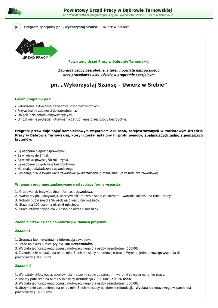 Powiatowy Urząd Pracy w Dąbrowie Tarnowskiej http://pupdt.pl/strona/program-specjalny-pn-„wykorzystaj-szanse-–-uwierz-w-siebie”/492 Program specjalny pn. „Wykorzystaj Szansę – Uwierz w Siebie” Powiatowy Urząd Pracy w Dąbrowie Tarnowskiej Zaprasza osoby bezrobotne, z terenu powiatu dąbrowskiego oraz pracodawców do udziału w programie specjalnym pn. „Wykorzystaj Szansę – Uwierz w Siebie” Celem programu jest: ● ● ● ● Pobudzenie aktywności zawodowej osób bezrobotnych, Przywrócenie zdolności do zatrudnienia, Objęcie działaniami aktywizacyjnymi, Umożliwienie podjęcia i utrzymania zatrudnienia przez osoby bezrobotne. Program przewiduje objąć kompleksowym wsparciem 216 osób, zarejestrowanych w Powiatowym Urzędzie Pracy w Dąbrowie Tarnowskiej, którym został ustalony III profil pomocy, spełniających jedno z poniższych kryteriów: ● ● ● ● ● ● Są osobami niepełnosprawnymi, Są w wieku do 34 lat, Są w wieku powyżej 50 roku życia, Są osobami długotrwale bezrobotnymi, Nie mają doświadczenia zawodowego, Posiadają niskie kwalifikacje zawodowe (wykształcenie gimnazjalne lub zasadnicze zawodowe). W ramach programu zaplanowano następujące formy wsparcia: 1. 2. 3. 4. 5. Grupowa lub indywidualna informacja zawodowa. Warsztaty pn. „Motywacja, asertywność, radzenie sobie ze stresem – warunki sukcesu na rynku pracy”. Roboty publiczne dla 96 osób na okres 5-ciu miesięcy. Staże dla 100 osób na okres 6 miesięcy. Prace interwencyjne dla 20 osób na okres 5 miesięcy. Zadania przewidziane do realizacji w ramach programu: Zadanie1 1. Grupowa lub indywidualna informacja zawodowa. 2. Staże na okres 6 miesięcy dla 100 uczestników, 3. Wypłata jednorazowego bonusu motywacyjnego dla osoby bezrobotnej (600,00zł), 4. Zatrudnienie po stażu na okres min. 3-ech miesięcy na umowę o pracę. Wypłata jednorazowego wsparcia dla pracodawcy (1000,00zł). Zadanie 2 1. Warsztaty „Motywacja, asertywność, radzenie sobie ze stresem - warunki sukcesu na rynku pracy. 2. Roboty publiczne na okres 5 miesięcy (refundacja 2 000,00zł) dla 96 osób, 3. Wypłata jednorazowego bonusu motywacyjnego dla osoby bezrobotnej (500,00zł), 4. Utrzymanie zatrudnienia na okres min. 3-ech miesięcy po okresie refundacji. Wypłata jednorazowego wsparcia dla pracodawcy (1 000,00zł). Zadanie 3 1. Indywidualna informacja zawodowa. 2. Prace interwencyjne na okres 5 miesięcy (refundacja 950,00 zł) dla 20 uczestników 3. Wypłata jednorazowego bonusu motywacyjnego dla osoby bezrobotnej (500,00 zł). 4. Utrzymanie zatrudnienia na okres min. 4-ech miesięcy po okresie refundacji. Wypłata jednorazowego wsparcia dla pracodawcy (1 500,00zł). Program zakłada efektywność zatrudnieniową na poziomie 100 %, co oznacza, że wszyscy uczestnicy zostaną zatrudnieni po zakończonym udziale w programie. Pracodawców zainteresowanych zorganizowaniem miejsc odbywania stażu i miejsc pracy dla bezrobotnych w ramach prac interwencyjnych oraz organizatorów robót publicznych zapraszamy do składania wniosków. Wnioski będą przyjmowane od dnia 1 kwietnia br. do wyczerpania limitu finansowego przeznaczonego na ten program. Wnioski należy składać wyłącznie w formie pisemnej w sekretariacie urzędu, pok. Nr 17 na I piętrze w godzinach pracy urzędu tj. 7.30 – 15.30, na drukach obowiązujących w Powiatowym Urzędzie Pracy w Dąbrowie Tarnowskiej. Szczegółowych informacji udzielają pracownicy Powiatowego Urzędu Pracy w Dąbrowie Tarnowskiej – tel. 14 642 24 78 lub 14 642 31 78.