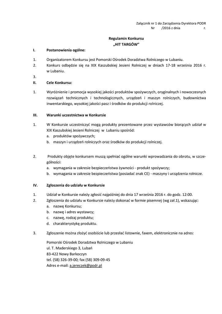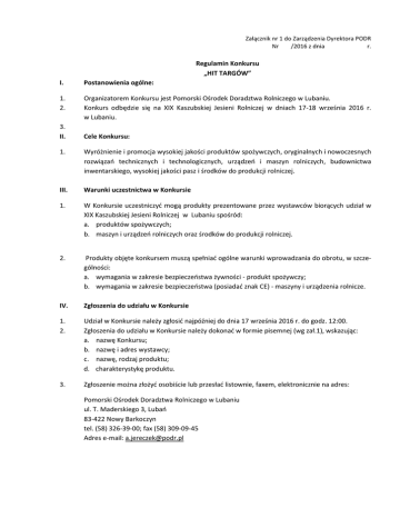 Załącznik nr 1 do Zarządzenia Dyrektora PODR Nr /2016 z dnia r. Regulamin Konkursu „HIT TARGÓW” I. Postanowienia ogólne: 1. 2. Organizatorem Konkursu jest Pomorski Ośrodek Doradztwa Rolniczego w Lubaniu. Konkurs odbędzie się na XIX Kaszubskiej Jesieni Rolniczej w dniach 17-18 września 2016 r. w Lubaniu. 3. II. Cele Konkursu: 1. Wyróżnienie i promocja wysokiej jakości produktów spożywczych, oryginalnych i nowoczesnych rozwiązań technicznych i technologicznych, urządzeń i maszyn rolniczych, budownictwa inwentarskiego, wysokiej jakości pasz i środków do produkcji rolniczej. III. Warunki uczestnictwa w Konkursie 1. W Konkursie uczestniczyć mogą produkty prezentowane przez wystawców biorących udział w XIX Kaszubskiej Jesieni Rolniczej w Lubaniu spośród: a. produktów spożywczych; b. maszyn i urządzeń rolniczych oraz środków do produkcji rolniczej. 2. Produkty objęte konkursem muszą spełniać ogólne warunki wprowadzania do obrotu, w szczególności: a. wymagania w zakresie bezpieczeństwa żywności - produkt spożywczy; b. wymagania w zakresie bezpieczeństwa (posiadać znak CE) - maszyny i urządzenia rolnicze. IV. Zgłoszenia do udziału w Konkursie 1. 2. Udział w Konkursie należy zgłosić najpóźniej do dnia 17 września 2016 r. do godz. 12:00. Zgłoszenia do udziału w Konkursie należy dokonać w formie pisemnej (wg zał.1), wskazując: a. nazwę Konkursu; b. nazwę i adres wystawcy; c. nazwę, rodzaj produktu; d. charakterystykę produktu. 3. Zgłoszenie można złożyć osobiście lub przesłać listownie, faxem, elektronicznie na adres: Pomorski Ośrodek Doradztwa Rolniczego w Lubaniu ul. T. Maderskiego 3, Lubań 83-422 Nowy Barkoczyn tel. (58) 326-39-00; fax (58) 309-09-45 Adres e-mail: [email protected] V. Komisja konkursowa 1. 2. Oceny stoiska dokona Komisja Konkursowa składająca się z 4 pracowników Pomorskiego Ośrodka Doradztwa Rolniczego w Lubaniu. Członków komisji powołuje Dyrektor Pomorskiego Ośrodka Doradztwa Rolniczego w Lubaniu. VI. Kryteria oceny przez komisję konkursową 1. 2. 3. 4. Walory produktu, przydatności w gospodarstwie i produkcji rolniczej. Pochodzenie produktu/surowców, z których produkt został wytworzony i metody jego wytwarzania. Nowoczesność produktu i jego zastosowanie. Jakość i estetyka wykonania. VII. Przebieg Konkursu 1. 4. 5. 6. Komisja konkursowa dokona oceny produktów w dniu 17 września 2016 r. pomiędzy godziną 12:00 a 16:00. Każdy z członków komisji dokona oceny punktowej zgłoszonych produktów w poszczególnych kryteriach. Maksymalna ilość punktów za każde kryterium wynosi – 5, a minimalna – 1. Indywidualna ocena każdego zgłoszonego produktu powstaje z sumowania punktów za poszczególne kryteria. Ogólna punktacja produktu powstanie z sumowania punktów wszystkich członków Komisji. Zwycięzcą Konkursu zostanie wystawca, którego produkt otrzyma najwyższą liczbę punktów. Komisja Konkursowa sporządzi protokół z przebiegu konkursu. VIII. Nagrody 1. Zwycięzca Konkursu zostanie nagrodzony pucharem Dyrektora Pomorskiego Ośrodka Doradztwa Rolniczego w Lubaniu. Dodatkowo zwycięzca konkursu otrzyma nagrodę w postaci pakietu promocyjnego zawierającego: 2. 3. 2. a) bezpłatny artykuł w miesięczniku Pomorskiego Ośrodka Doradztwa Rolniczego w Lubaniu „Pomorskie Wieści Rolnicze”; b) bezpłatny udział stoiska zwycięzcy podczas wybranej konferencji wojewódzkiej organizowanej przez Pomorski Ośrodek Doradztwa Rolniczego w Lubaniu; c) bezpłatny artykuł na stronie www.podr.pl. 3. Wręczenie nagród nastąpi w dniu 18 września 2016 r. na scenie pomiędzy godz. 12:00-14:00. Załącznik nr 1 do Regulaminu Konkursu „HIT TARGÓW”. FORMULARZ ZGŁOSZENIA do udziału w konkursie pn. „HIT TARGÓW” podczas XIX Kaszubskiej Jesieni Rolniczej w dniach 17-18 września 2016 r. w Lubaniu w kategorii: □ □ produkty spożywcze, maszyny i urządzenia rolnicze oraz środki do produkcji rolniczej. Nazwa i adres wystawcy: ……………………………………………………………………………………………………………………………………………………………… ……………………………………………………………………………………………………………………………………………………………… Nazwa, rodzaj produktu: …………………………………………………………………………………………………………………………………………………………….. …………………………………………………………………………………………………………………………………………………………….. Charakterystyka produktu: …………………………………………………………………………………………………………………………………………………………….. …………………………………………………………………………………………………………………………………………………………….. …………………………………………………………................ data i podpis osoby zgłaszającej