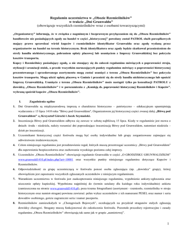 Regulamin uczestnictwa w „Obozie Rzemieślników” w trakcie „Dni Grunwaldu” (obowiązuje wszystkich rzemieślników wraz z osobami towarzyszącymi) „Organizatorzy” informują, że w związku z nagminnym i bezprawnym przyłączaniem się do „Obozu Rzemieślników” handlowców nie posiadających zgody na handel w części „historycznej” powołany został PATROL służb porządkowych mający prawo sprawdzać wśród kupców i rzemieślników identyfikator Grunwaldu oraz zgodę wydaną przez organizatorów na handel na terenie historycznym. Brak identyfikatora oraz zgody będzie skutkował przeniesieniem do strefy handlu niehistorycznego, pobraniem opłaty placowej lub usunięciem z Imprezy Grunwaldzkiej bez pokrycia kosztów transportu. Kupcy i Rzemieślnicy posiadający zgodę, a nie stosujący się do zaleceń regulaminu mówiących o poprawności stroju, stylizacji i aranżacji stoisk, a przede wszystkim naruszających punkty regulaminu mówiący o poprawności historycznej prezentowanego i sprzedawanego asortymentu mogą zostać usunięci z terenu „Obozu Rzemieślników” bez pokrycia kosztów transportu. Mogą uiścić opłatę placową w Gminie i przenieść się do strefy handlu niehistorycznego lub opuścić Imprezę Grunwaldzką. Usunięcie z terenu „Obozu Rzemieślników” może nastąpić tylko po konsultacji PATROLU z dowódcą „Obozu Rzemieślników” i w porozumieniu z „Komisją ds. poprawności historycznej Rzemieślników i Kupców”. wybraną spośród kupców „Obozu Rzemieślników”. I. Zagadnienia ogólne 1. Dni Grunwaldu są międzynarodową imprezą o charakterze historyczno – patriotyczno – edukacyjnym upamiętniają wydarzenia z 15 lipca 1410 roku "Bitwy pod Grunwaldem", Organizatorem jej historycznej części zwanej dalej „Bitwą pod Grunwaldem” są Krzysztof Górecki i Jacek Szymański. 2. Inscenizacja Bitwy pod Grunwaldem odbywa się zawsze w sobotę najbliższą 15 lipca. Kiedy w regulaminie jest mowa o dniach: środa - niedziela, należy rozumieć dni poprzedzające inscenizację Bitwy pod Grunwaldem, natomiast niedziela – dzień po inscenizacji. 3. Uczestnikami historycznej części festiwalu mogą być osoby indywidualne lub grupy zorganizowane zajmujące się odtwórstwem średniowiecznym. 4. Celem niniejszego regulaminu jest przedstawienie reguł, których muszą przestrzegać uczestnicy „Bitwy pod Grunwaldem” dla zapewnienia bezpieczeństwa oraz zachowania wysokiego poziomu całej imprezy. 5. Uczestników „Obozu Rzemieślników” obowiązuje regulamin Grunwaldu w części „O GRODZISKU GRUNWALDZKIM” www.grunwald1410.pl/index.php?art=10001 oraz wszystkie punkty niniejszego regulaminu dotyczące Kupców i Rzemieślników. 6. Odpowiedzialność za grupę uczestniczącą w festiwalu ponosi osoba zgłaszająca (np. „dowódca” grupy), której obowiązkiem jest zapoznanie wszystkich zgłaszanych uczestników z niniejszym regulaminem. 7. Warunkiem uczestnictwa w festiwalu jest zaakceptowanie niniejszego regulaminu, wypełnienie ankiety-zgłoszenia oraz uiszczenie opłaty kupieckiej. Wypełniona najpóźniej do (termin ustalany dla każdego roku indywidualnie) ankieta (zamieszczona na stronie www.grunwald1410.pl), poza trzema fotografiami (asortyment - rzemiosło, rzemieślnika w stroju historycznym oraz namiot-stragan) powinna zawierać: pełen wykaz uczestników z ich numerami PESEL oraz numer i seria dowodów osobistego, goście zagraniczni seria i numer paszportu. 8. Rzemieślników zamieszkałych w „Chorągwiach Bojowych”, oczekujących na przydział straganów stałych zgłaszają dowódcy chorągwi. Stragany muszą funkcjonować do zakończenia festiwalu. Pozostałe procedury rejestracyjne i zasady regulaminu „Obozu Rzemieślników” obowiązują tak samo jak w grupie „namiotowej”. 1 9. Dokonanie opłaty i pojawienie się wpisu w „Katalogu Rzemieślników” http://www.grunwald1410.pl/index.php?cat=151 oraz akceptacja regulaminu przez jego podpisanie (przy rejestracji kramu na polach Grunwaldu) jest równoznaczna z przyjęciem do obozu rzemieślników i kupców i zgodą na prowadzenie handlu i prezentacji. UWAGA: Brak wpisu eliminuje rzemieślnika z uczestnictwa w Dniach Grunwaldu. 10. W wypadku rażących uchybień, któregokolwiek z punktów regulaminu, organizatorzy zastrzegają sobie możliwość wydalenia uczestnika z terenu imprezy bez zwrotu jakichkolwiek kosztów. 11. Organizatorzy mają decydujący głos w sprawie uczestnictwa grup i osób indywidualnych w „Bitwie pod Grunwaldem”. Nie mają obowiązku przedłożenia argumentów swojej decyzji. 12. Wszelkie postanowienia wymienione w niniejszym regulaminie są ostatecznie i niepodważalne i nie podlegają jakiejkolwiek dyskusji z organizatorem. 13. Organizatorzy wyłączają swoją jakąkolwiek odpowiedzialność za skutki działania lub zaniechania osób postępujących niezgodnie z powyższym regulaminem II. Wymagania dotyczące zgłaszanych grup 14. Zaproszeni Rzemieślnicy – Kupcy zobowiązani są do przyjazdu najpóźniej w środę. Wyjazd najwcześniej w niedzielę. 15. „Bitwa pod Grunwaldem” jest imprezą datowaną. Odtwórcy zgłaszający chęć uczestnictwa w imprezie zobowiązani są do posiadania strojów, wyposażenia oraz innych artefaktów nawiązujących do tego okresu wykonanych z materiałów naturalnych. 16. Stroje datowane na okres 1350-1420 obowiązują wszystkich mieszkających i handlujących w osadzie. 17. Zgłaszane grupy bądź odtwórcy indywidualni powinni posiadać namioty zgodne z przyjętymi dla okresu około grunwaldzkiego formami, wykonany z materiałów naturalnych. 18. Sprzedawany asortyment powinien propagować kulturę materialną średniowiecza być jej wierną bądź stylizowaną na podstawie ikonografii, opisów historycznych, badań naukowych repliką, wykonaną tylko z materiałów naturalnych (zakaz handlu plastykowymi tarczami i tym podobnymi wynalazkami). Dopuszcza się handel 