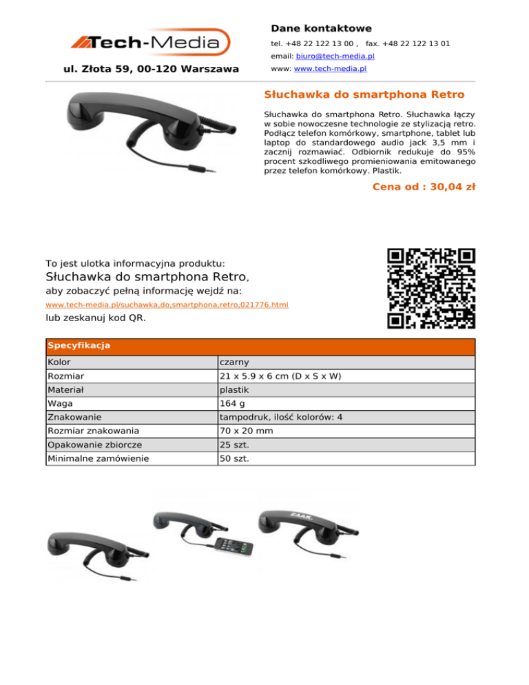 Dane kontaktowe tel. +48 22 122 13 00 , fax. +48 22 122 13 01 email: [email protected] ul. Złota 59, 00-120 Warszawa www: www.tech-media.pl Słuchawka do smartphona Retro Słuchawka do smartphona Retro. Słuchawka łączy w sobie nowoczesne technologie ze stylizacją retro. Podłącz telefon komórkowy, smartphone, tablet lub laptop do standardowego audio jack 3,5 mm i zacznij rozmawiać. Odbiornik redukuje do 95% procent szkodliwego promieniowania emitowanego przez telefon komórkowy. Plastik. Cena od : 30,04 zł To jest ulotka informacyjna produktu: Słuchawka do smartphona Retro, aby zobaczyć pełną informację wejdź na: www.tech-media.pl/suchawka,do,smartphona,retro,021776.html lub zeskanuj kod QR. Specyfikacja Kolor czarny Rozmiar 21 x 5.9 x 6 cm (D x S x W) Materiał plastik Waga 164 g Znakowanie tampodruk, ilość kolorów: 4 Rozmiar znakowania 70 x 20 mm Opakowanie zbiorcze 25 szt. Minimalne zamówienie 50 szt.